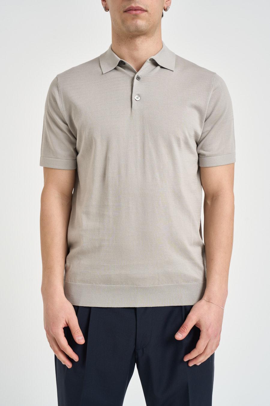 DIKTAT Polo uomo in maglia grigia. Modello a maniche corte con colletto classico e chiusura frontale con bottoni. Realizzata in maglia leggera e morbida, presenta finiture a costine su colletto, maniche e fondo che valorizzano la struttura del capo. Composizione: 100% Poliestere. Il modello è alto 190 cm e indossa la taglia 50.