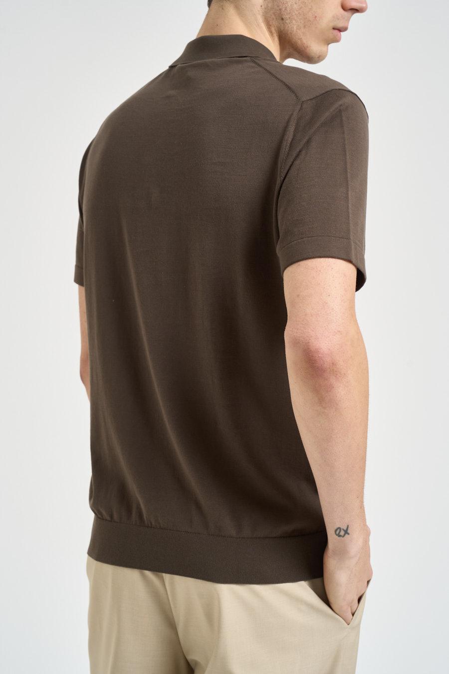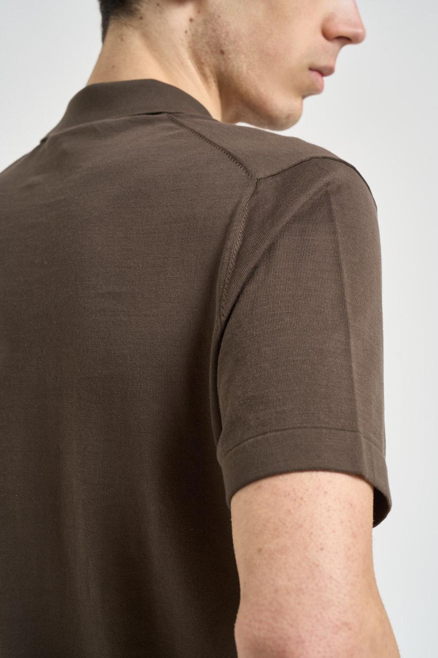 DIKTAT Polo uomo in maglia marrone. Modello a maniche corte con colletto classico e chiusura frontale con bottoni. Realizzata in maglia leggera e morbida, presenta finiture a costine su colletto, maniche e fondo che valorizzano la struttura del capo. Composizione: 100% Poliestere. Il modello è alto 190 cm e indossa la taglia 50.