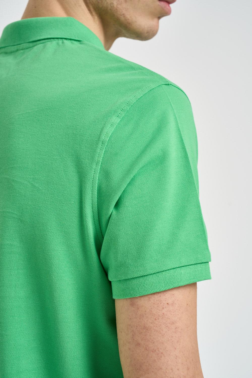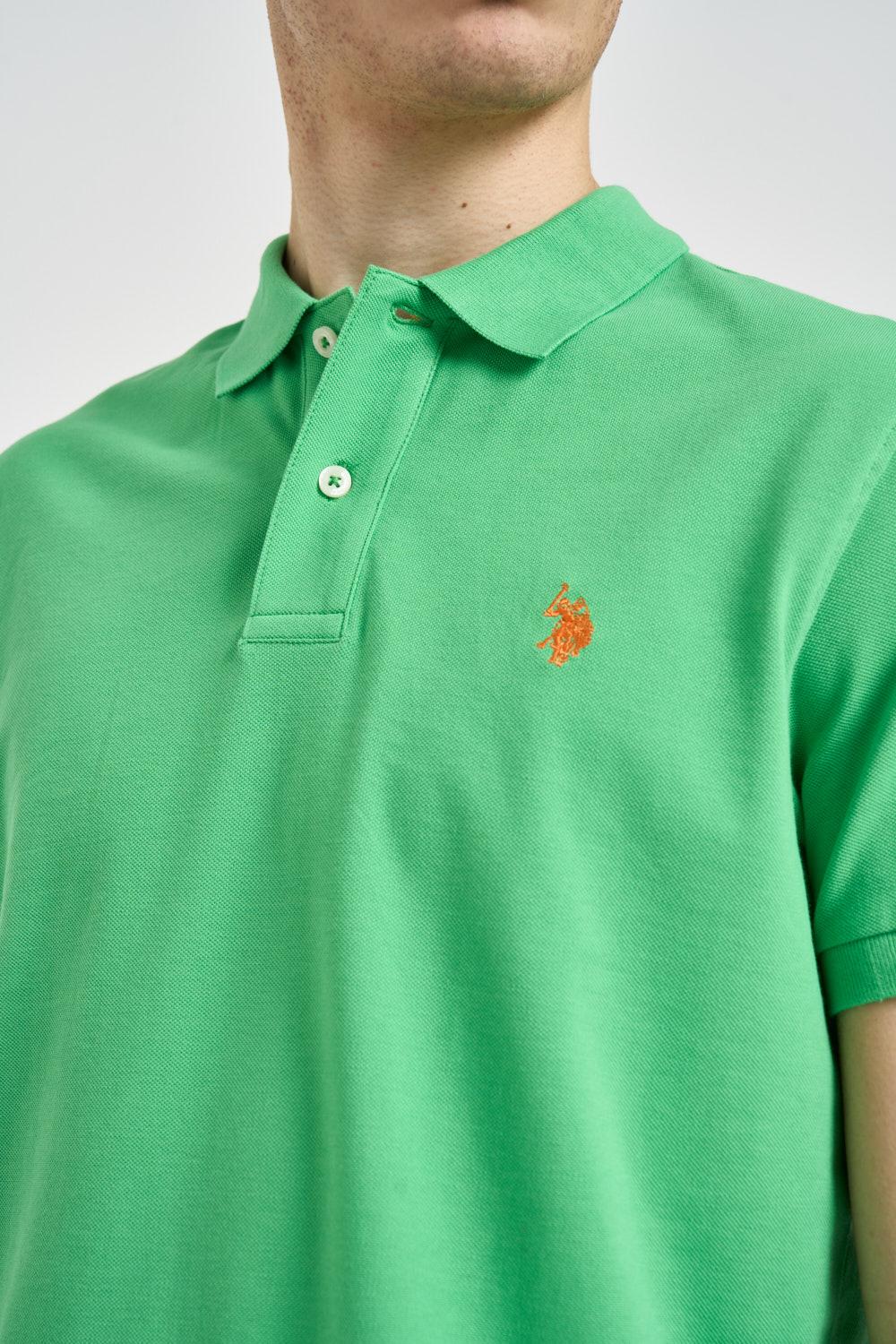 U.S. POLO Polo uomo verde fluo. Modello a manica corta classico con colletto a polo e chiusura frontale con bottoni. Realizzata in tessuto piqué di cotone, dettaglio iconico con logo in arancione ricamato a contrasto sul petto. Finiture con colletto e bordo maniche a costine e piccoli spacchi laterali sul fondo. Composizione: 100% cotone. Il modello è alto 190 cm e indossa la taglia L.