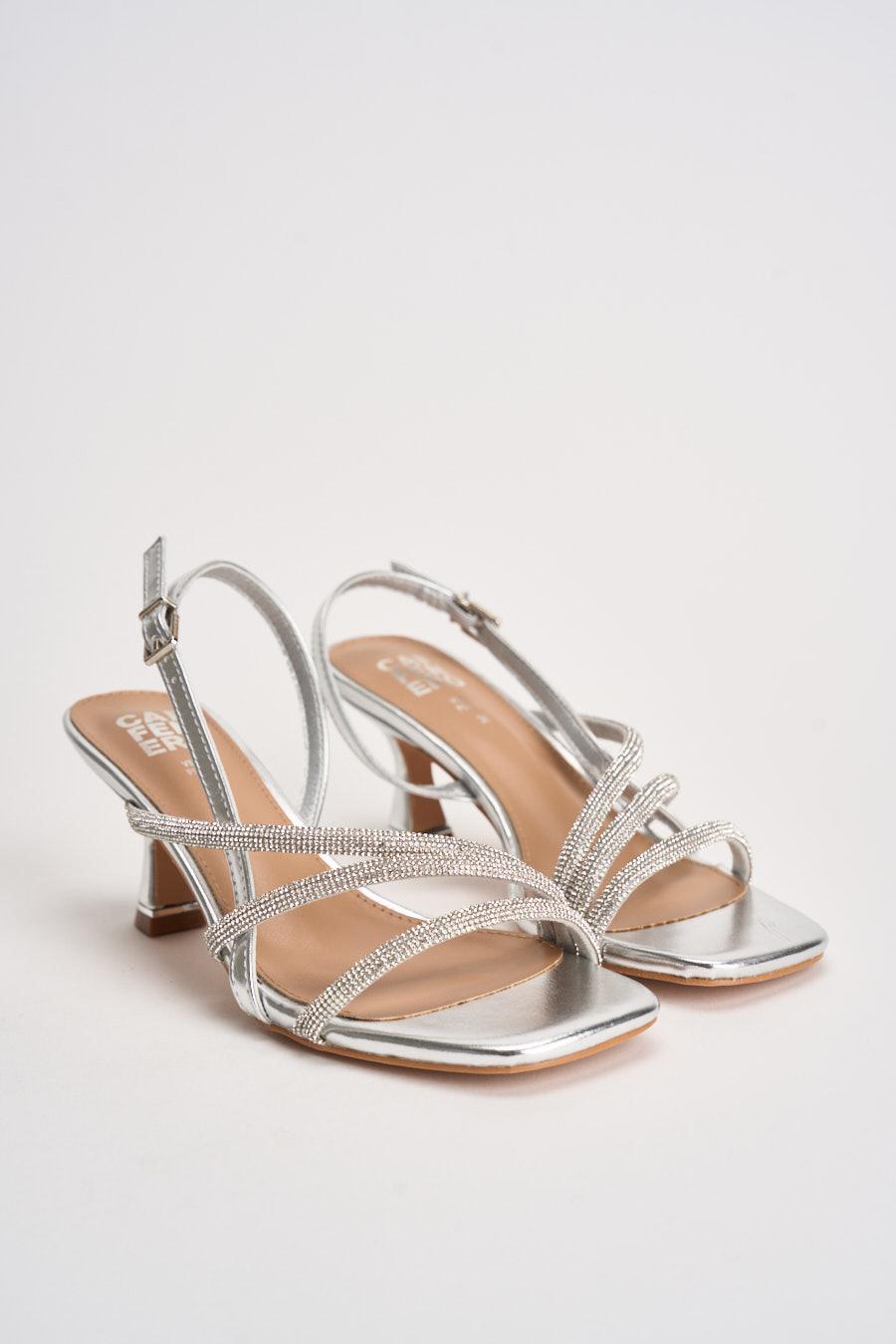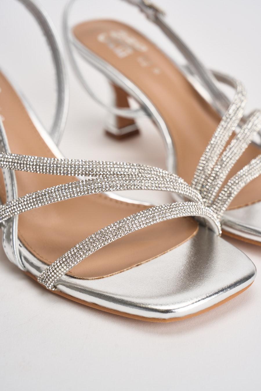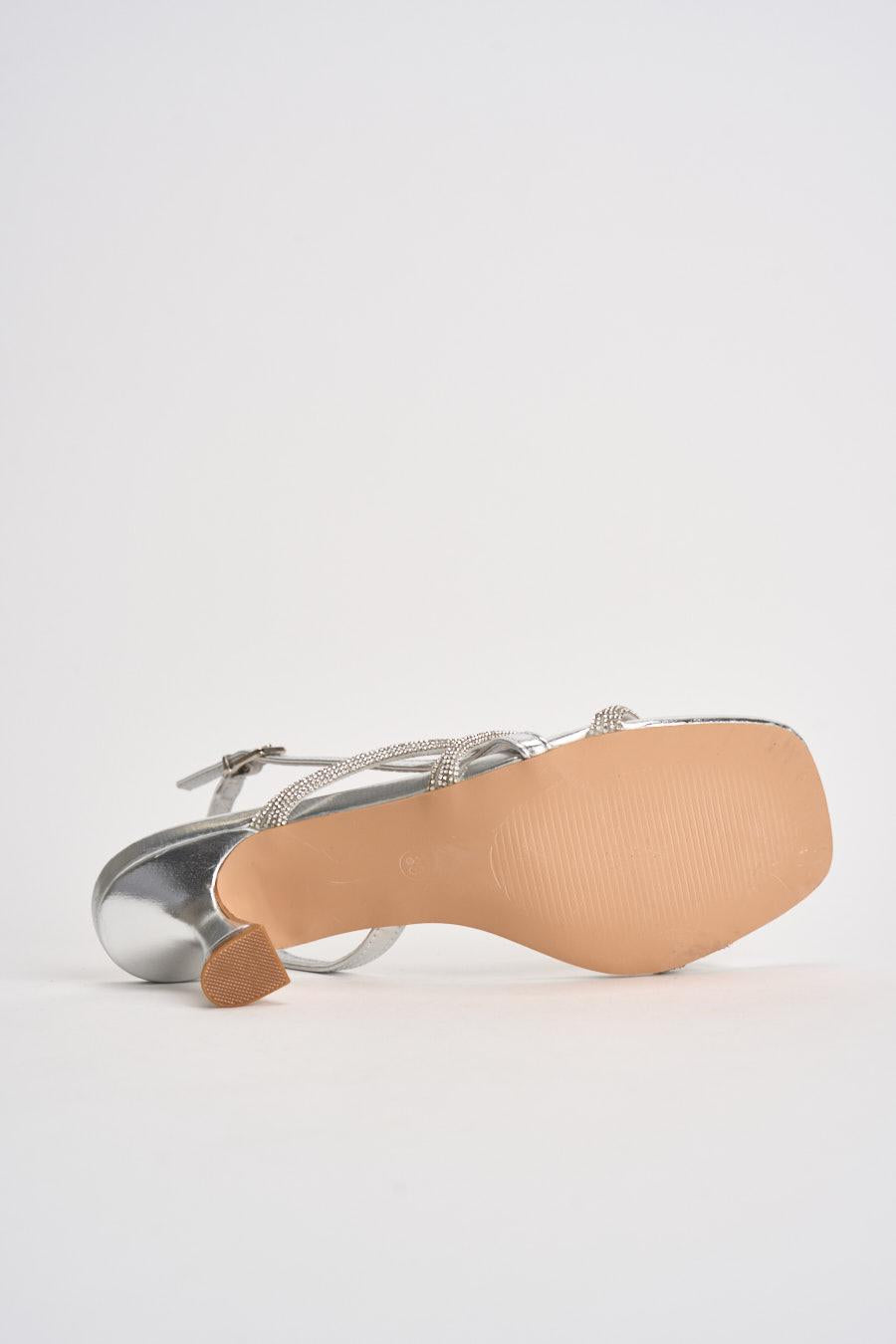 CAFFÈ NERO Sandalo donna argento con strass. Modello con punta squadrata e sottili fasce incrociate impreziosite da applicazioni luminose che donano un elegante effetto brillante. Cinturino alla caviglia con fibbia regolabile in metallo. Tacco medio sagomato dal design moderno e femminile. Altezza tacco: 6 cm.