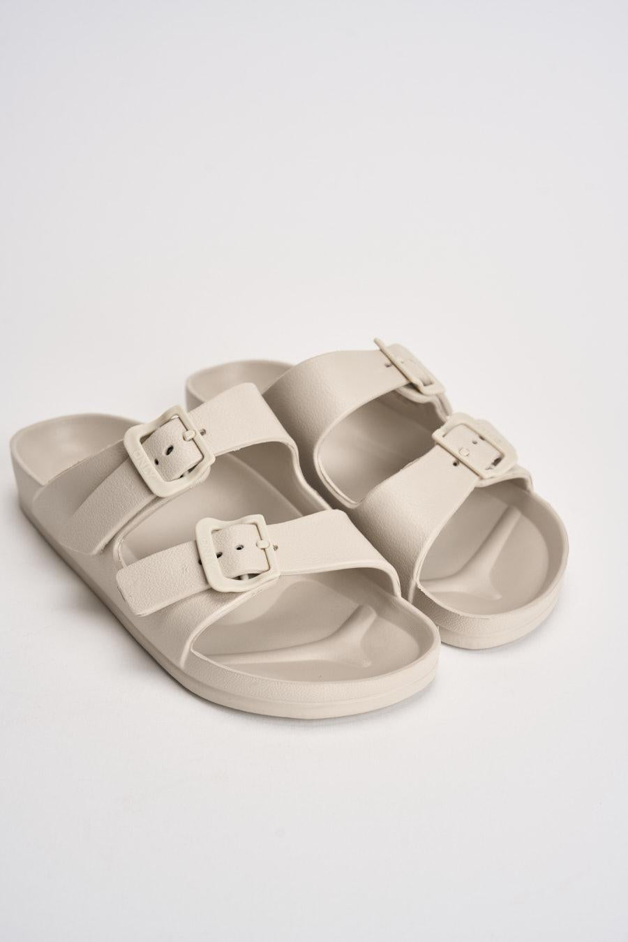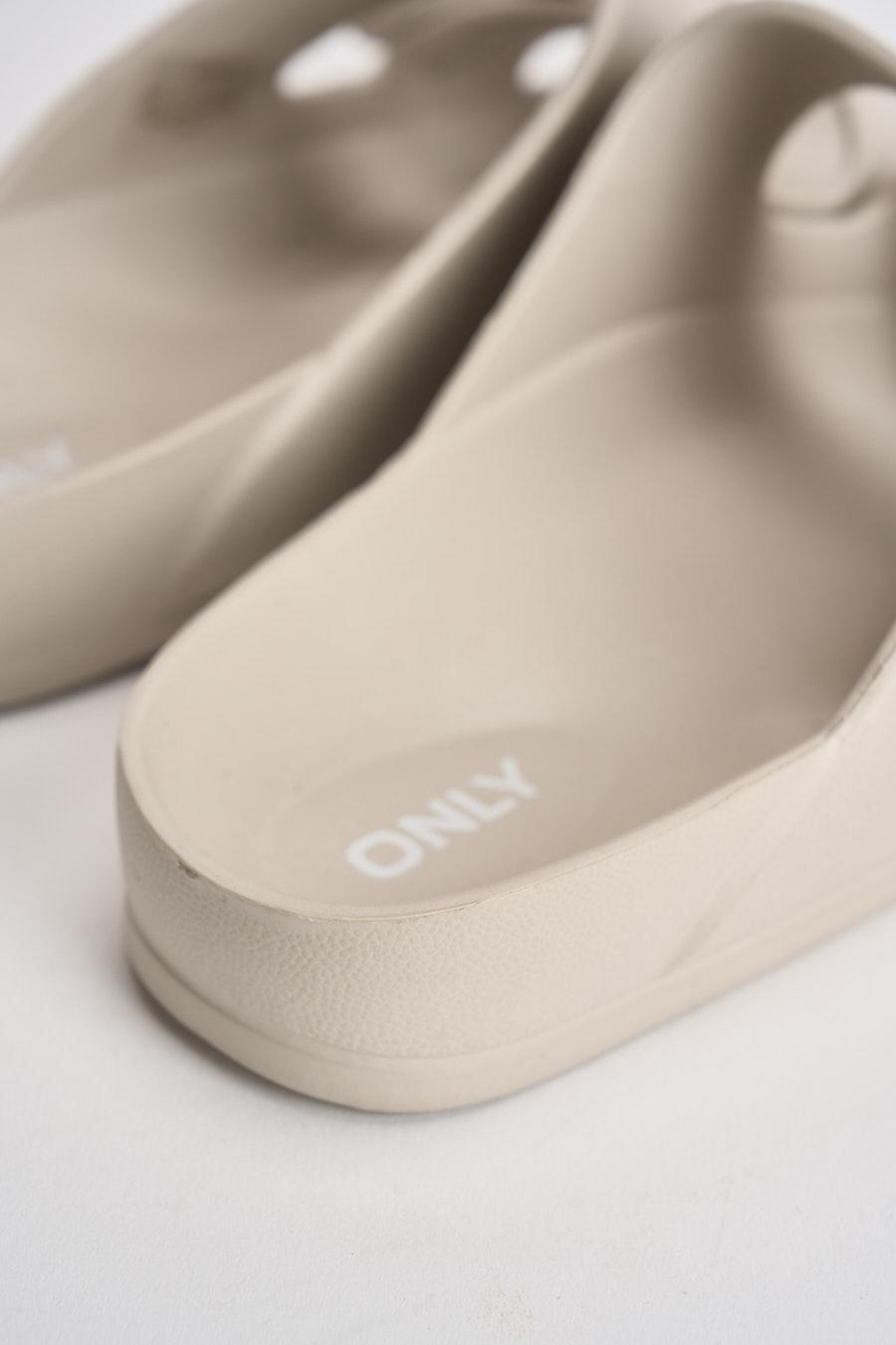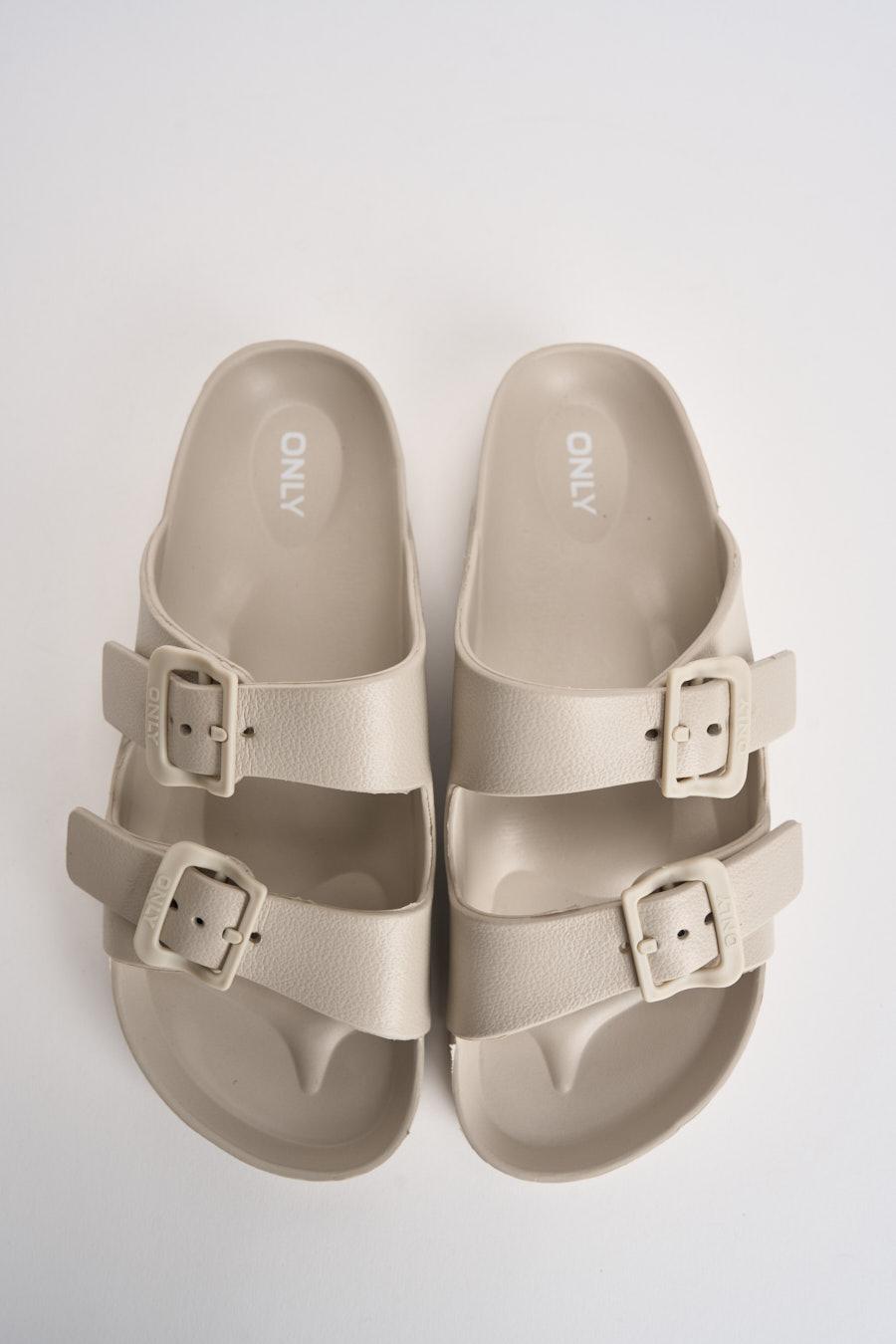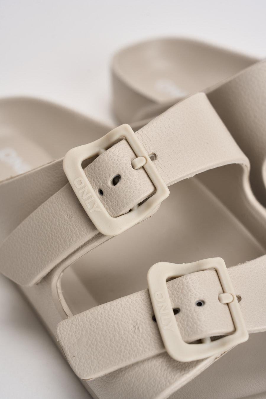 ONLY Sandalo donna in EVA panna. Modello Arizona con doppia fascia regolabile con fibbie tono su tono. Punta arrotondata e design essenziale. Plantare sagomato per un maggiore comfort e suola piatta con leggera struttura ammortizzata. Composizione: eva. Soletta esterna: gomma. Calzata regolare.
