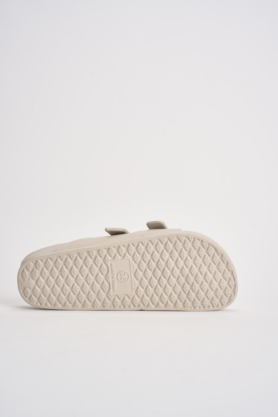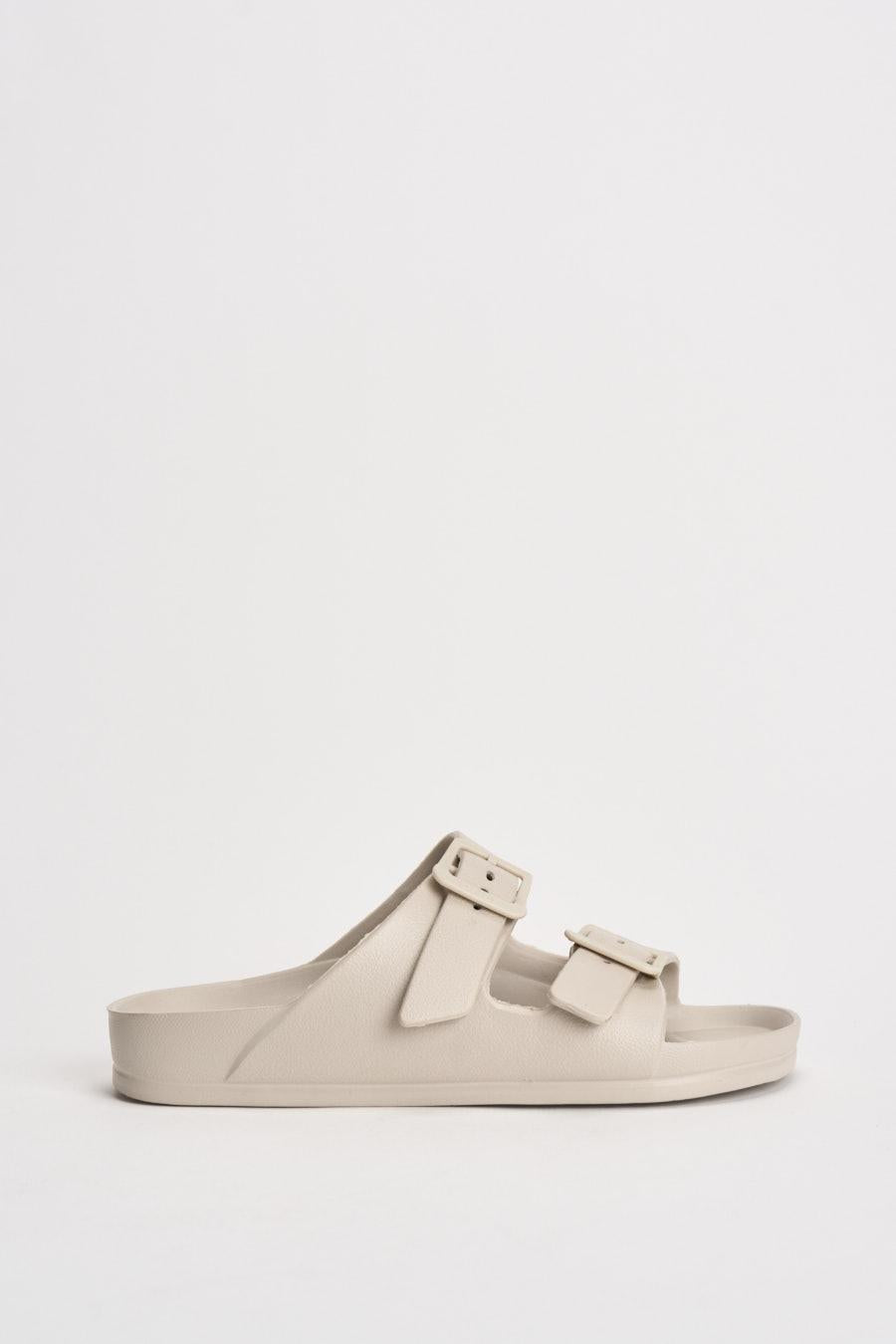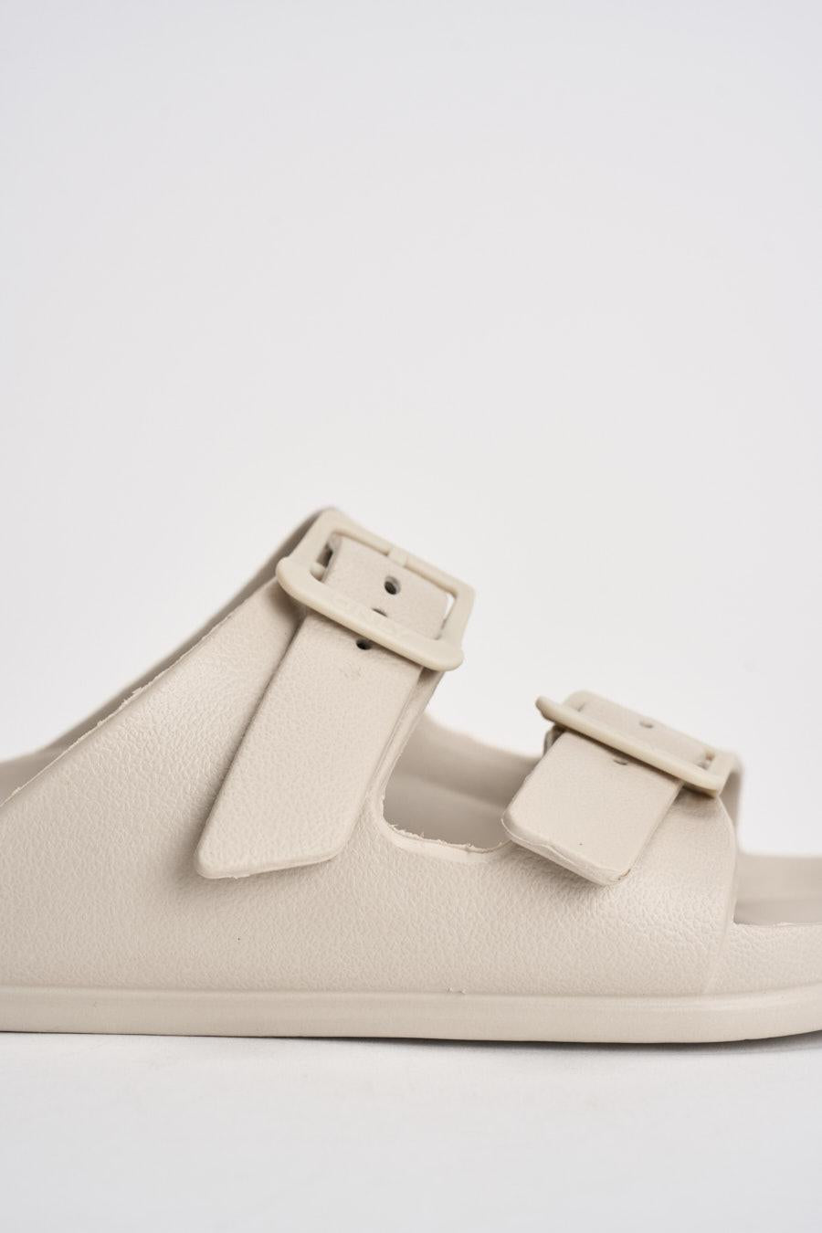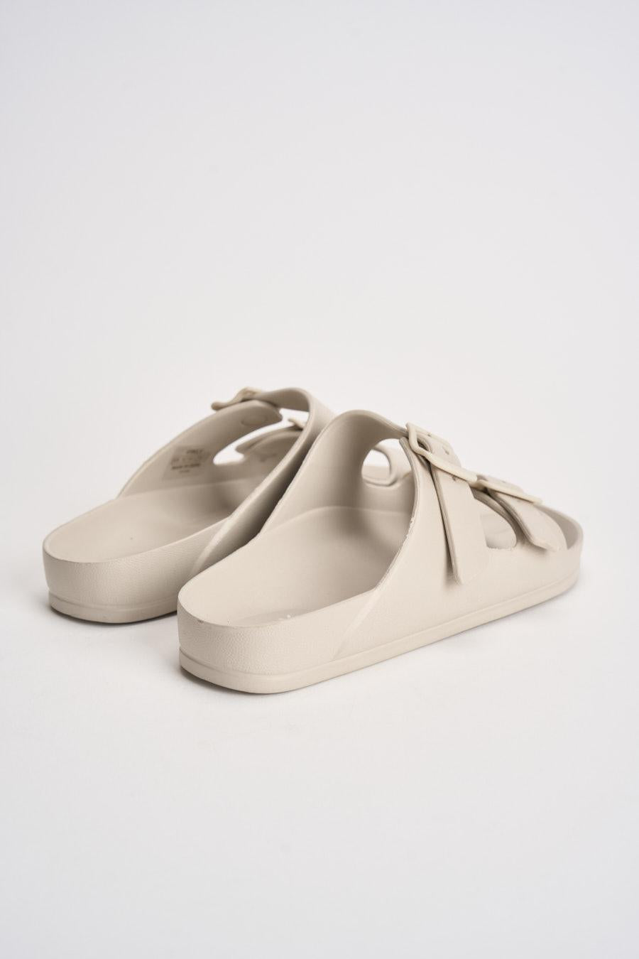 ONLY Sandalo donna in EVA panna. Modello Arizona con doppia fascia regolabile con fibbie tono su tono. Punta arrotondata e design essenziale. Plantare sagomato per un maggiore comfort e suola piatta con leggera struttura ammortizzata. Composizione: eva. Soletta esterna: gomma. Calzata regolare.