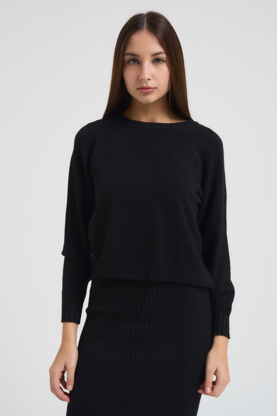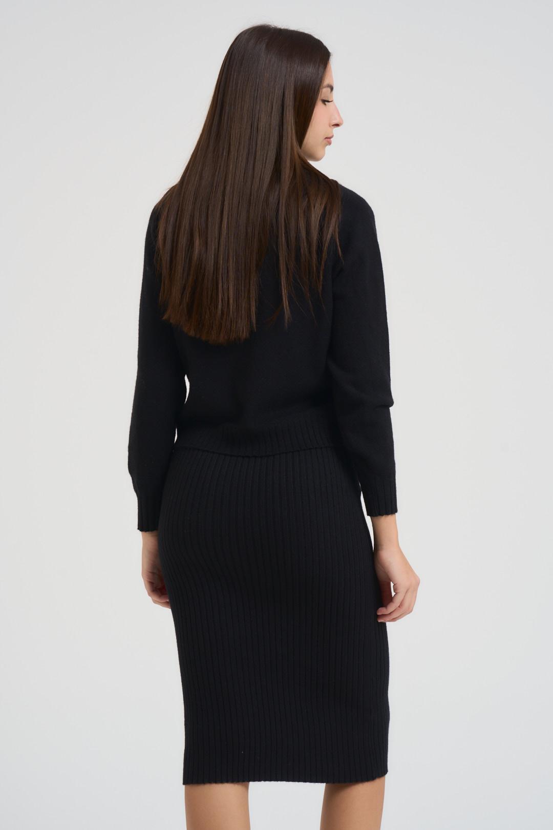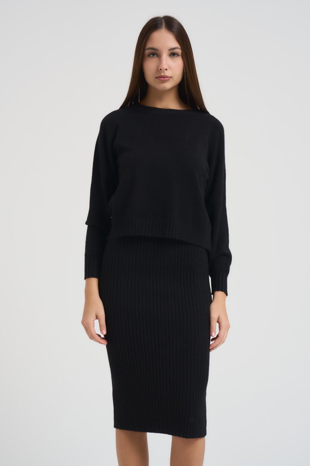 SUSY MIX Set coordinato donna nero. Modello composto da abito midi in maglia a coste con scollo a V. Maglia scollo a barchetta e maniche lunghe con orli a costine. Composizione: 50% viscosa, 28% poliestere. La modella è alta 176 cm e indossa la taglia UNI.