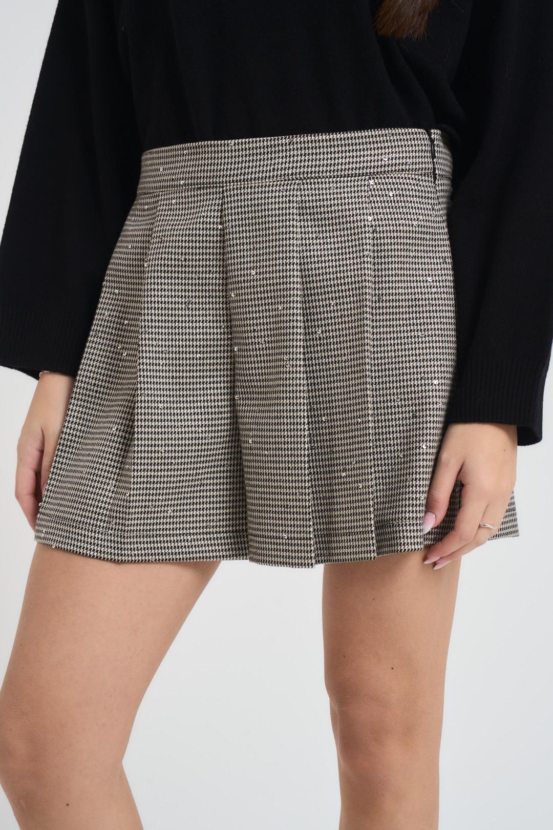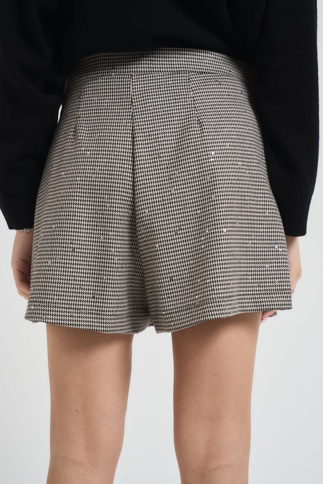 LOKITA MILANO Short donna pied de poule nero e paillettes. Modello con pieghe, chiusura con zip nascosta laterale. Composizione: Poliestere e viscosa. La modella è alta 172 cm e indossa la taglia S.