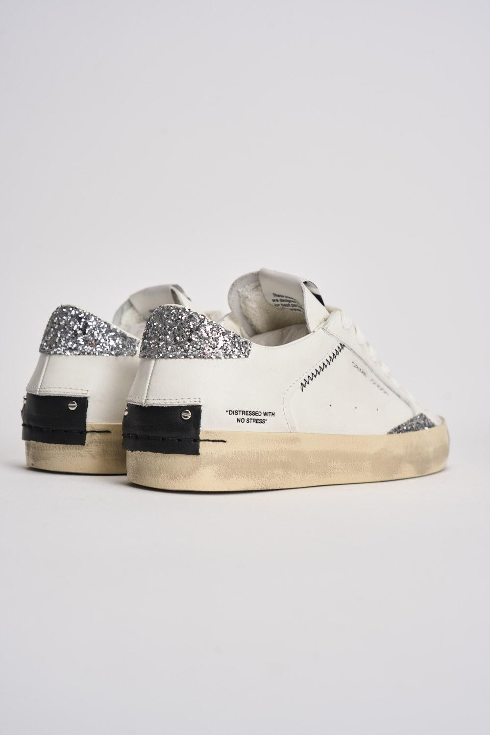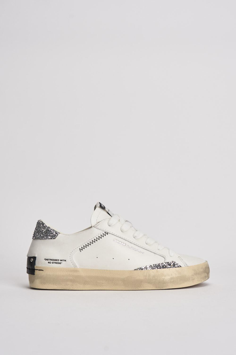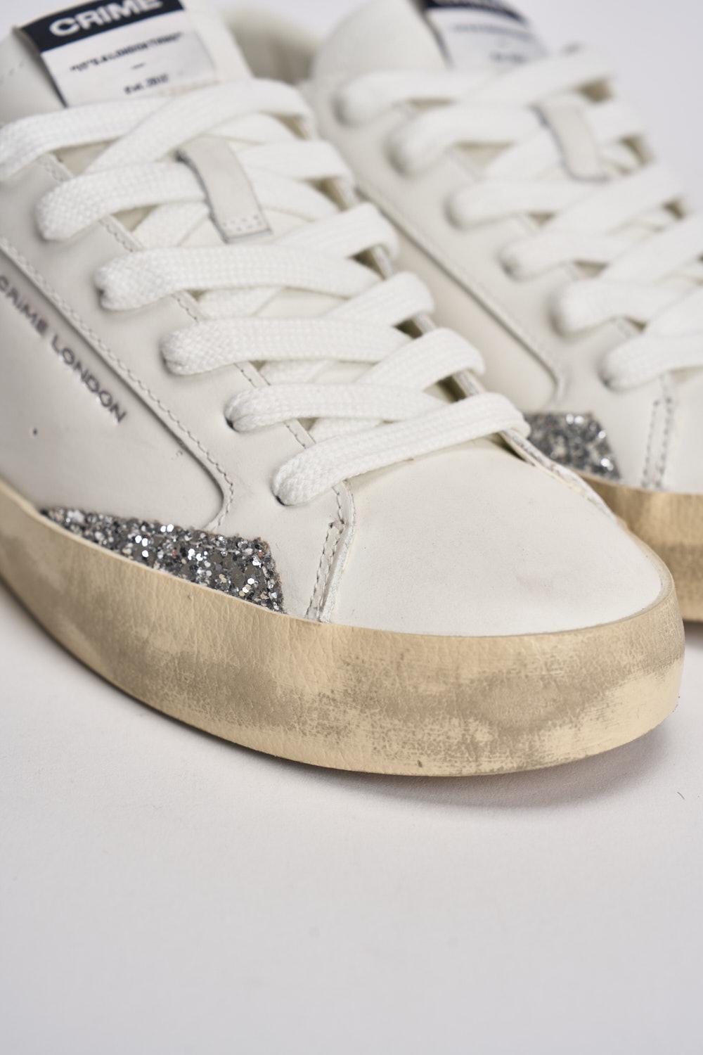 CRIME LONDON Sneakers donna bianche e glitter argento. Modello in pelle bianca con inserti silver e talloncino con glitter. Linguetta in pelle bianca con etichetta logata, patch in pelle nera sul retro. Calzata regolare.