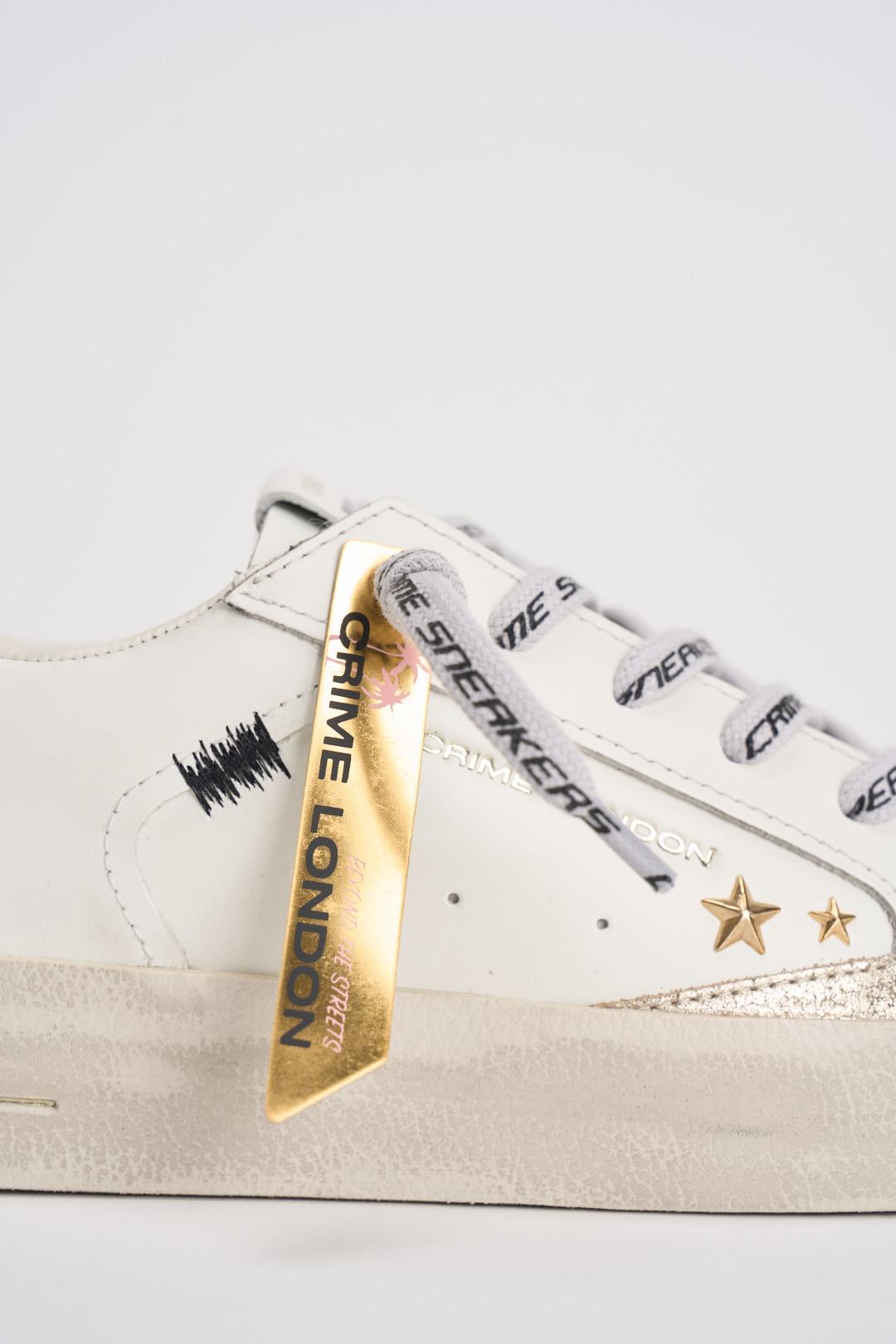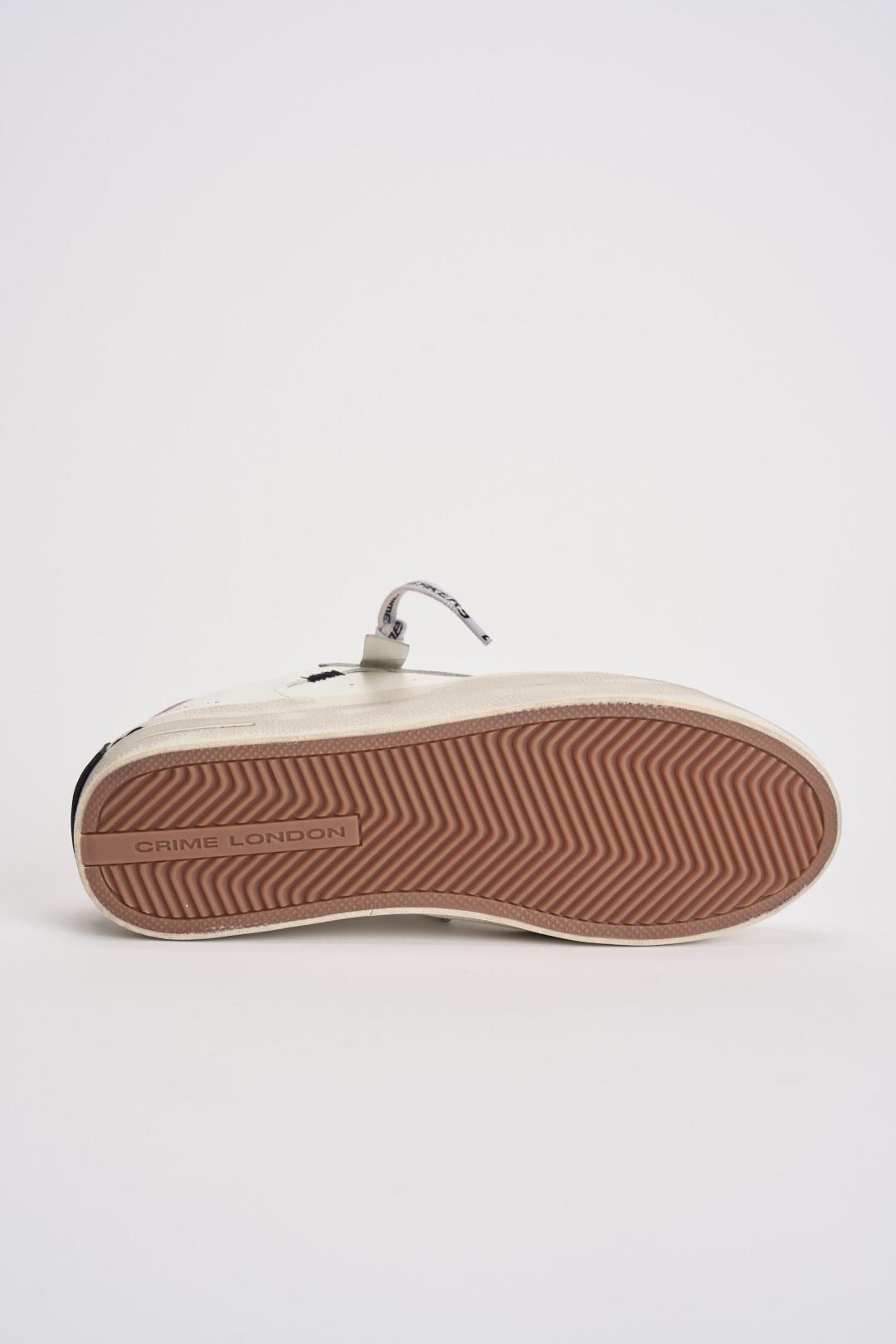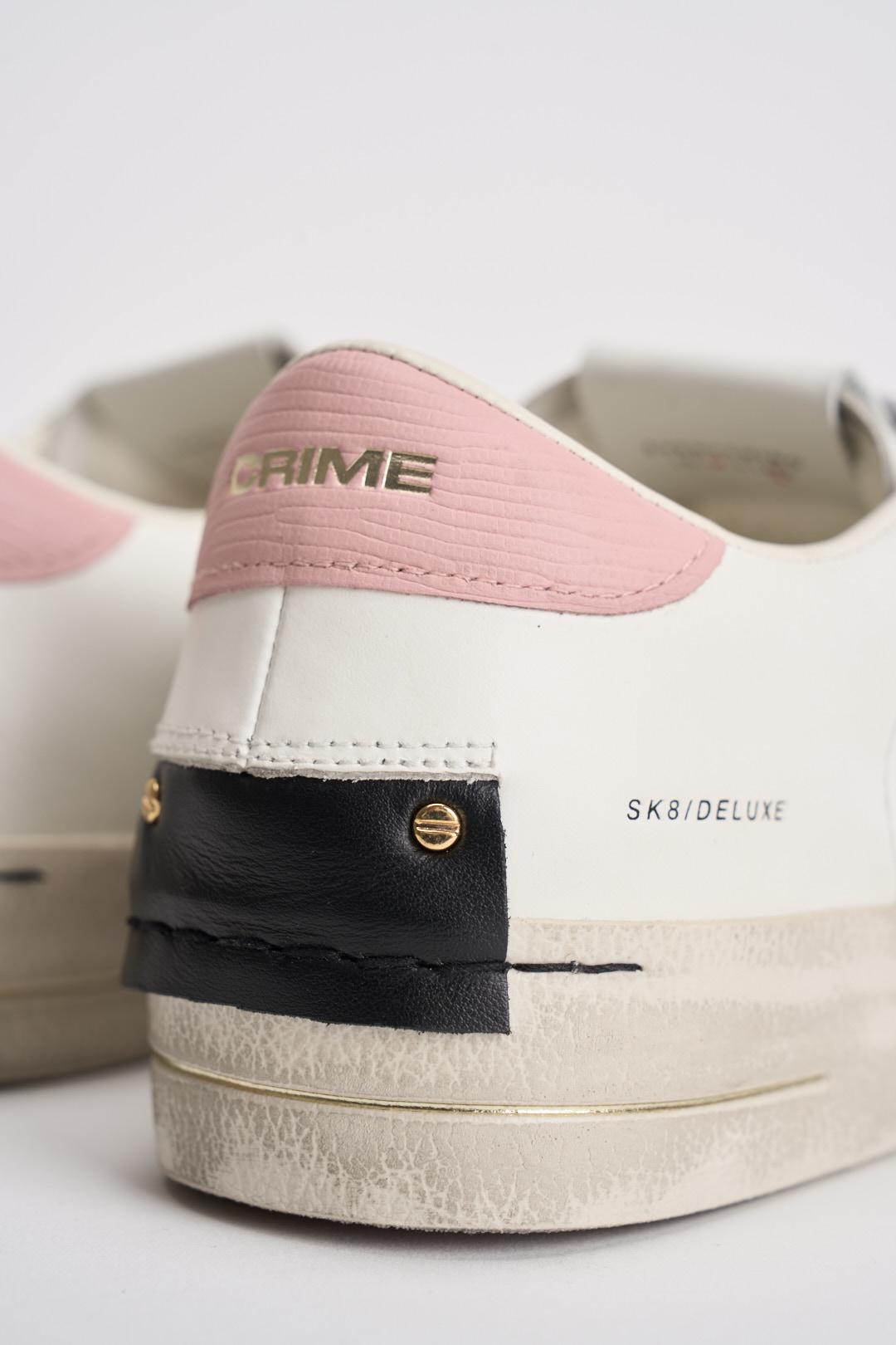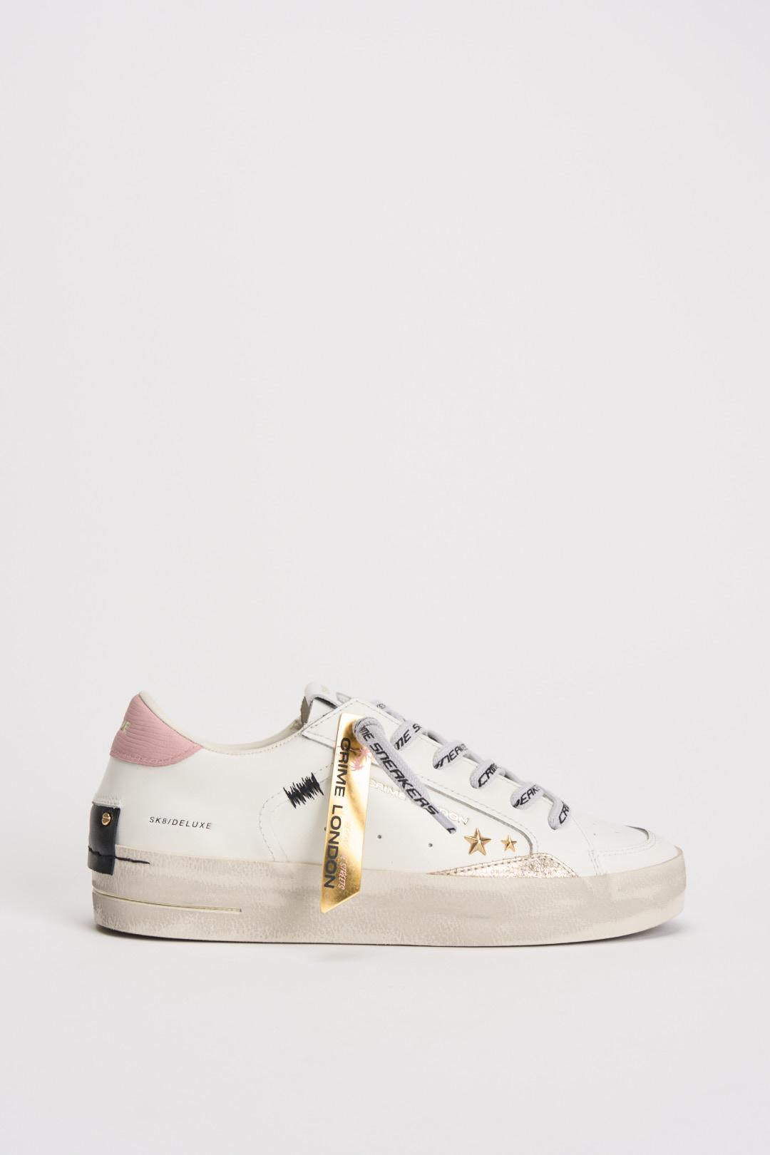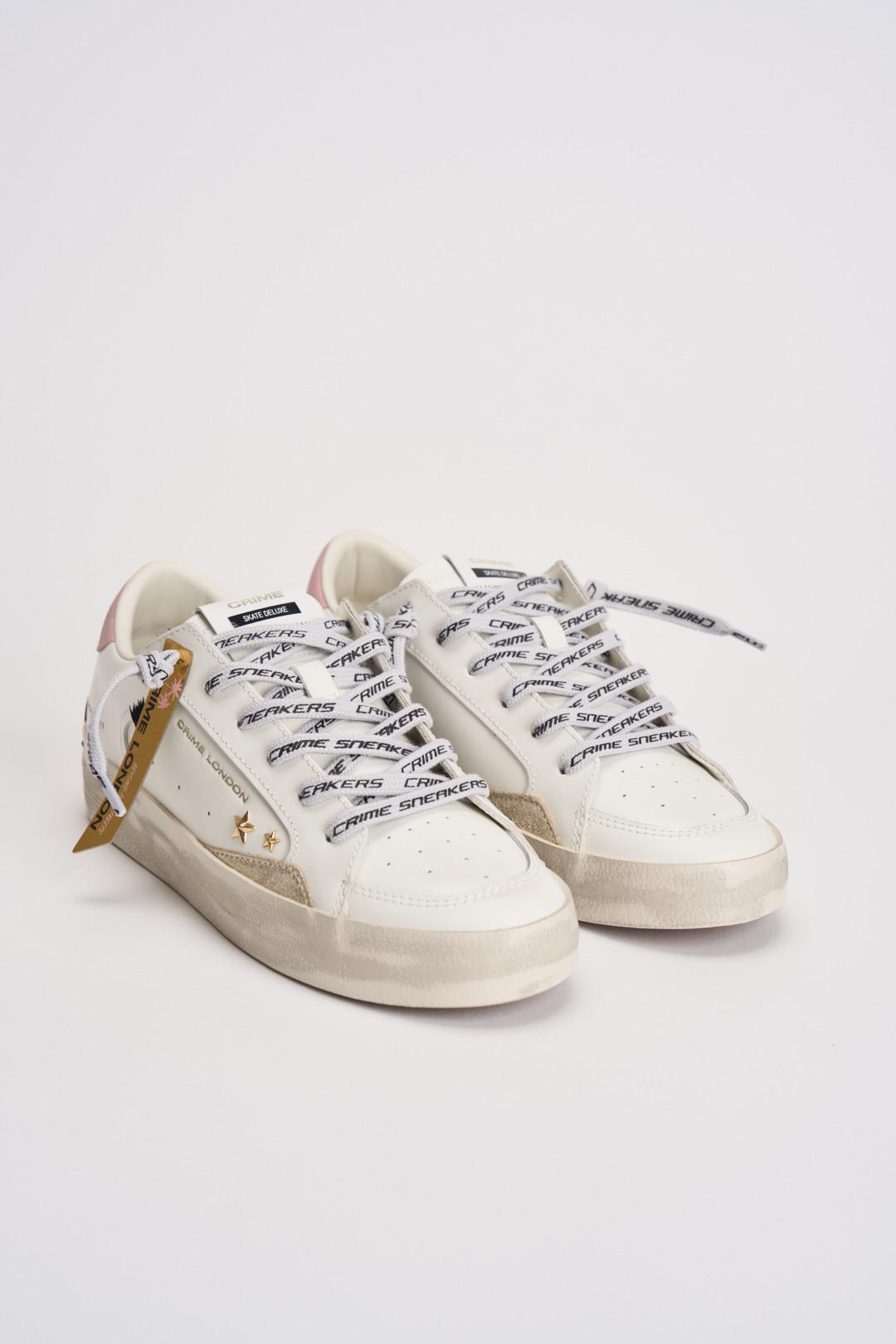 CRIME LONDON Sneakers donna bianche e rosa. Modello in pelle bianca con talloncino rosa, patch in pelle nera sul retro. Lacci bianchi con scritta nera Sneakers Crime e borchie dorate sulla tomaia laterale, dettagli in suede beige. Linguetta in pelle bianca con etichetta in pelle logata. Singola etichetta effetto specchio dorato. Misure: 2.5-3.5 cm. Calzata regolare.