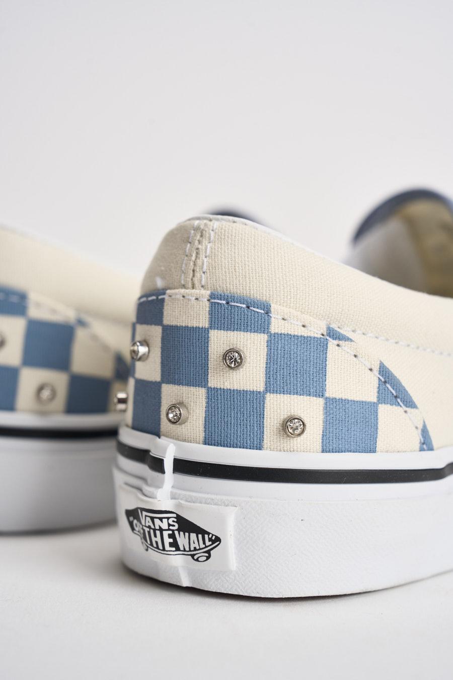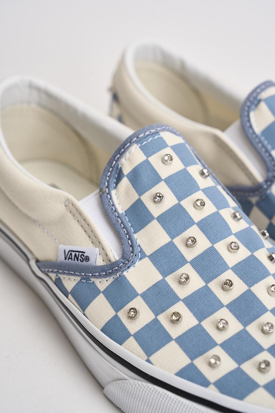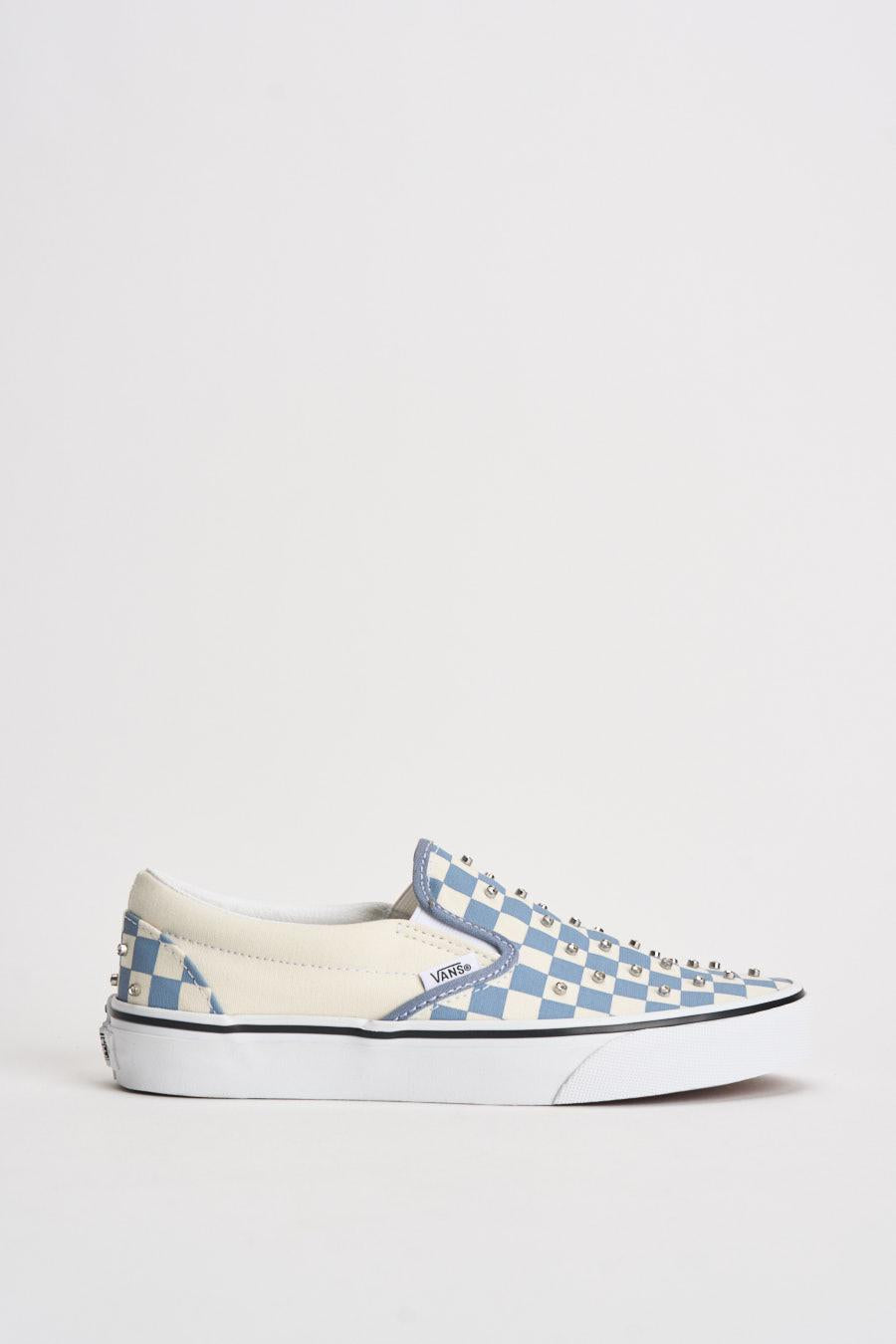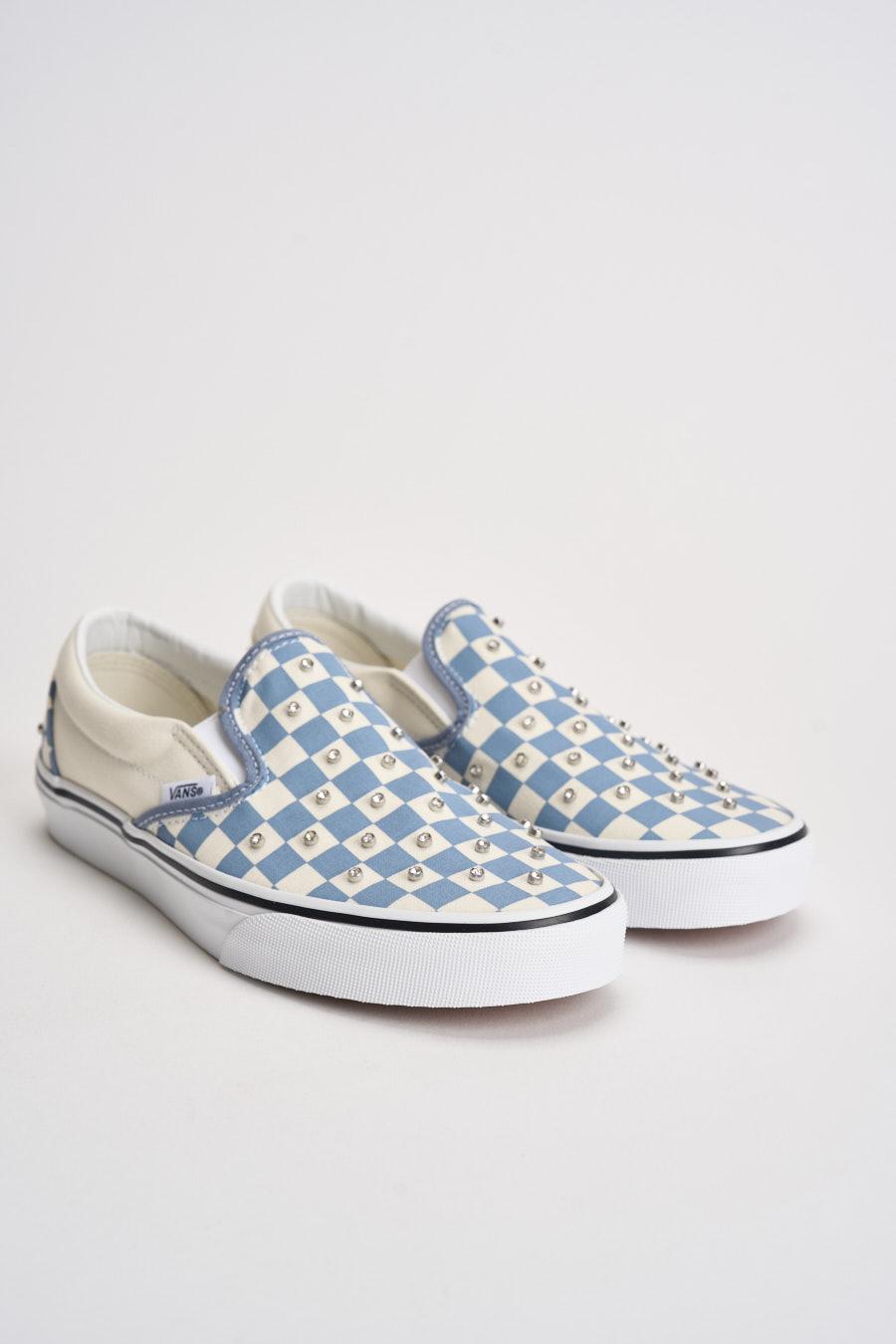 VANS Sneakers donna Classic slip-on scacchi celeste. Modello slip on con tomaia senza lacci con inserti elastici laterali per una calzata pratica e confortevole. Decorata con piccoli rivetti metallici applicati su tutta la superficie. Logo VANS applicato lateralmente e patch Vans Off The Wall sul tallone. Suola vulcanizzata in gomma bianca con bordo a contrasto. Altezza suola: 2cm. Composizione: tessuto e gomma. Calzata regolare.
