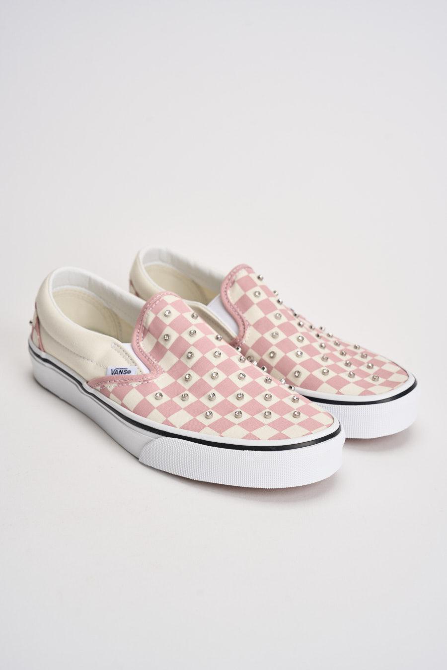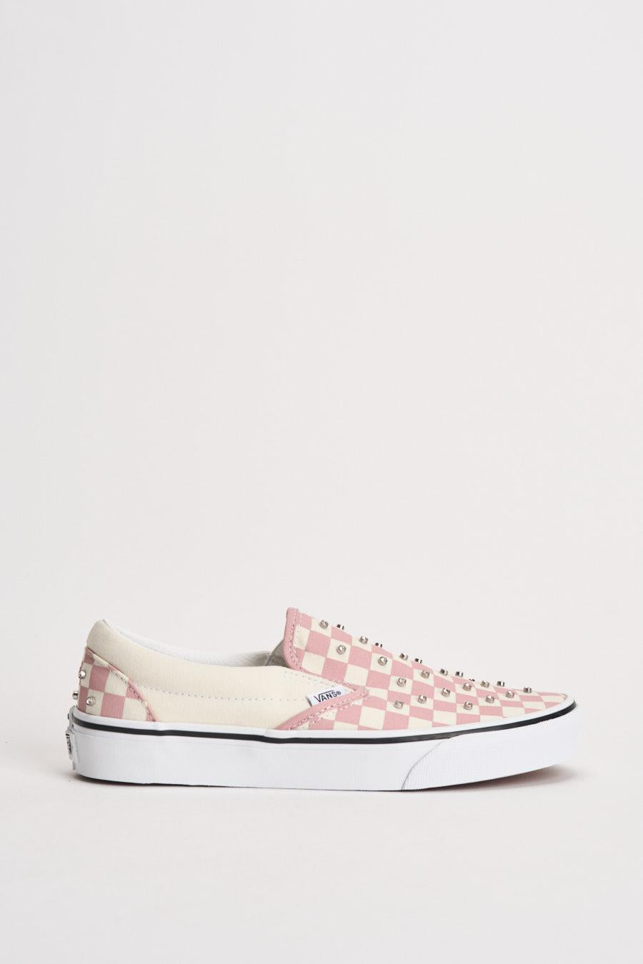 VANS Sneakers donna Classic slip-on scacchi rosa. Modello slip on con tomaia senza lacci con inserti elastici laterali per una calzata pratica e confortevole. Decorata con piccoli rivetti metallici applicati su tutta la superficie. Logo VANS applicato lateralmente e patch Vans Off The Wall sul tallone. Suola vulcanizzata in gomma bianca con bordo a contrasto. Altezza suola: 2cm. Composizione: tessuto e gomma. Calzata regolare.