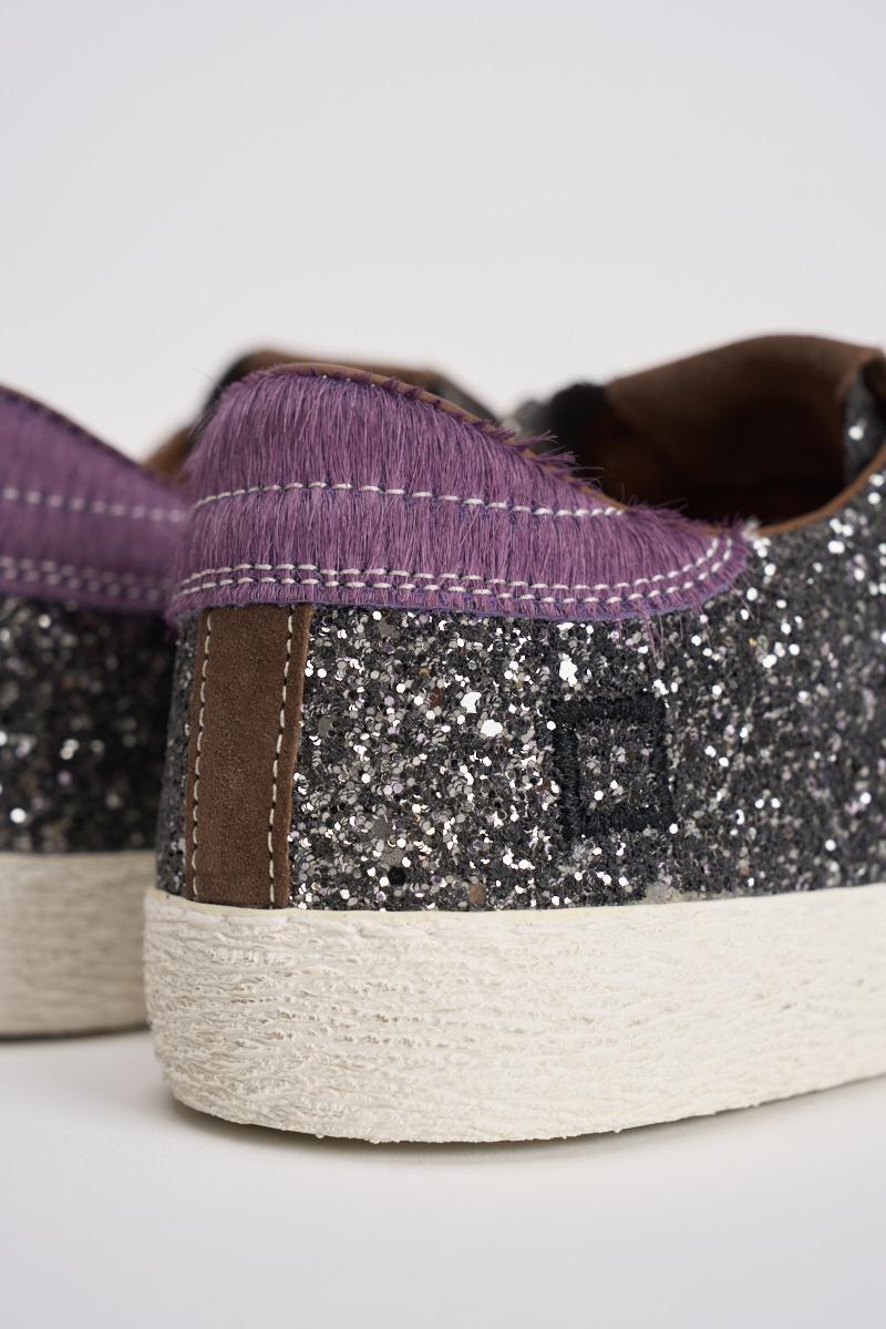 D.A.T.E Sneakers donna Hill Low Calf glitter multicolor. Modello base grigia, inserti in suede marrone, con logo brand impresso in suede sulla linguetta. Lacci in cotone. Logo quadrato e codice impressi lateralmente. Talloncino posteriore in cavallino viola e striscia laterale in suede marrone. Fodera in pelle e spugna di cotone. Il soletto interno è rialzato di 2.5 cm. Calzata regolare.