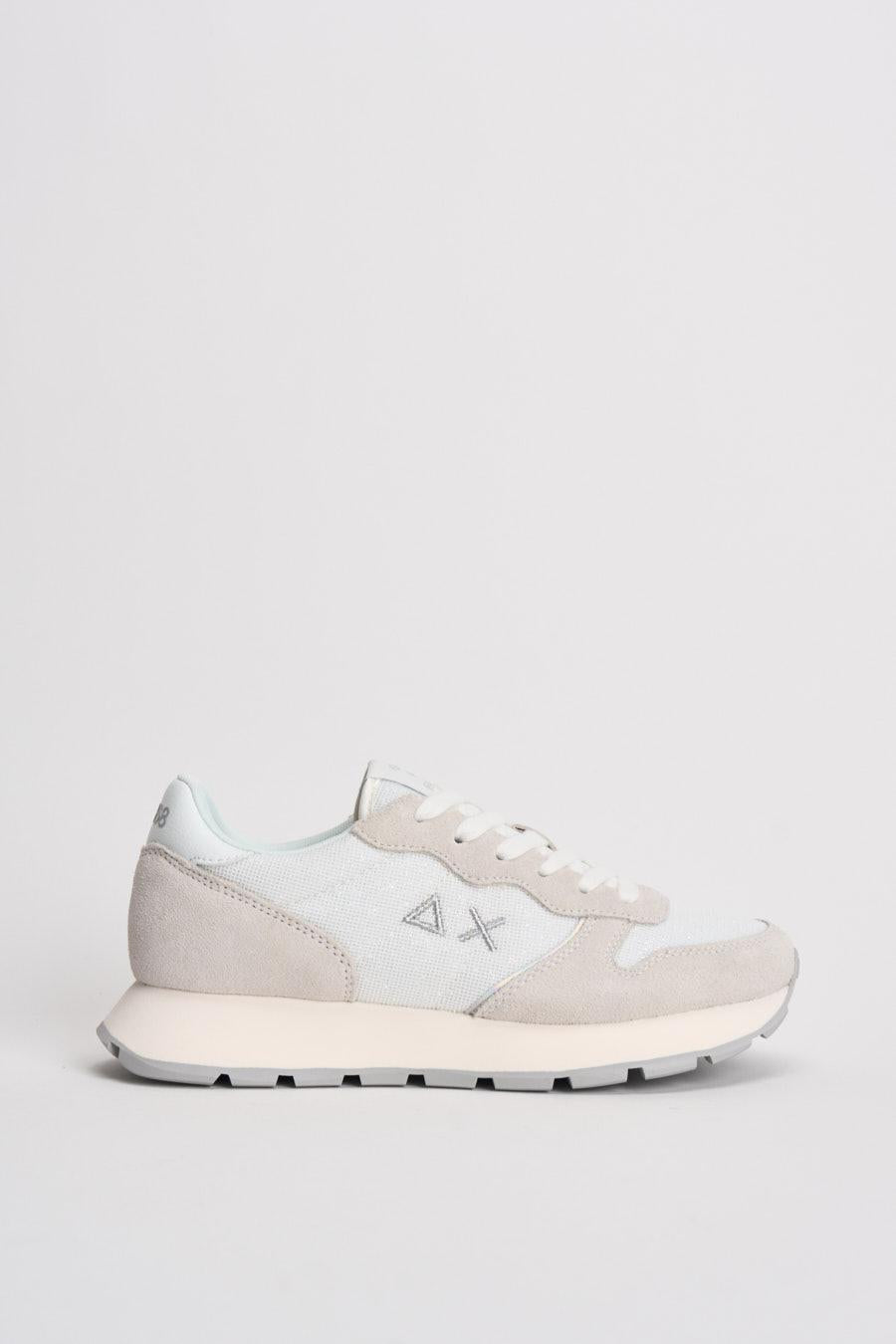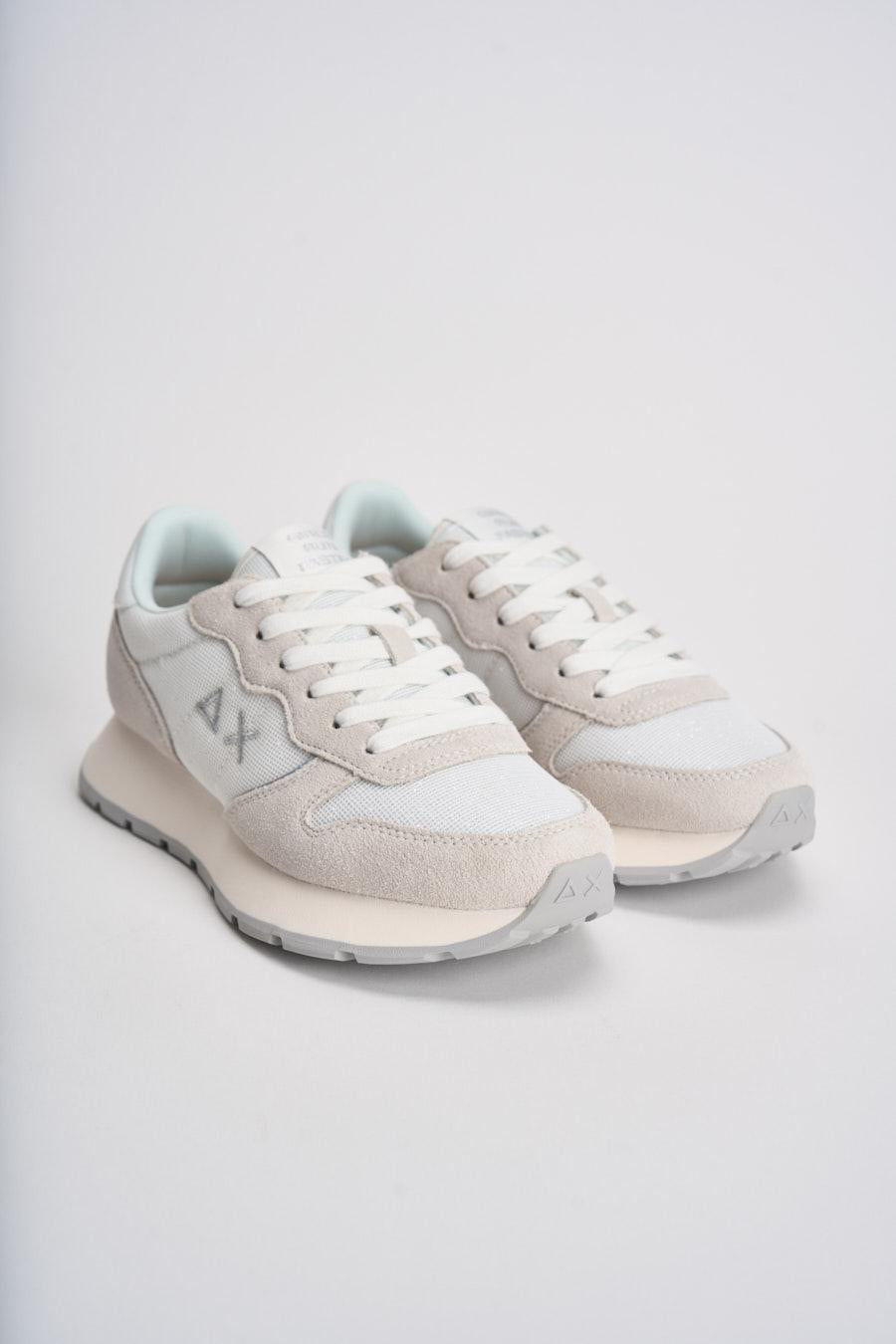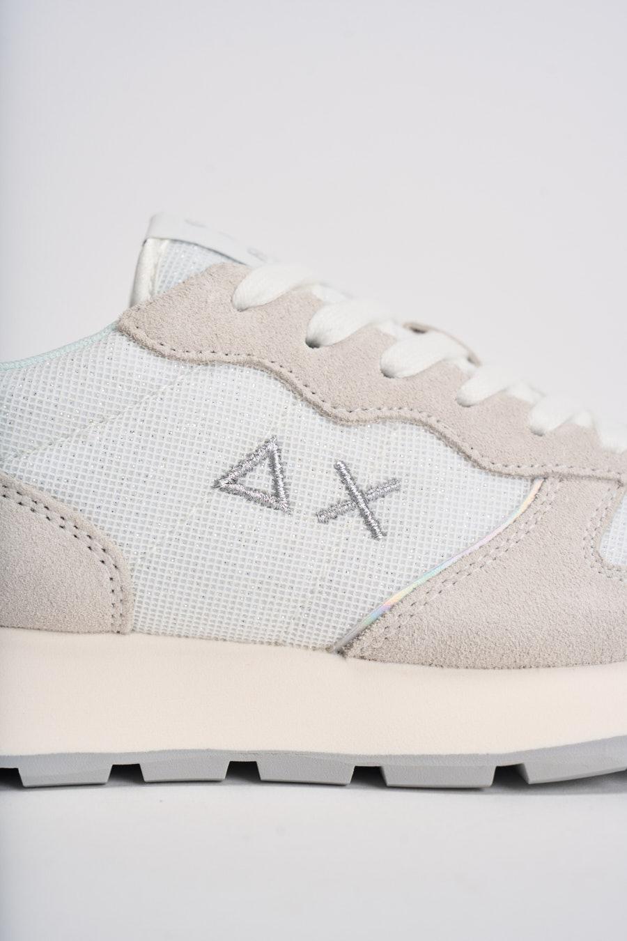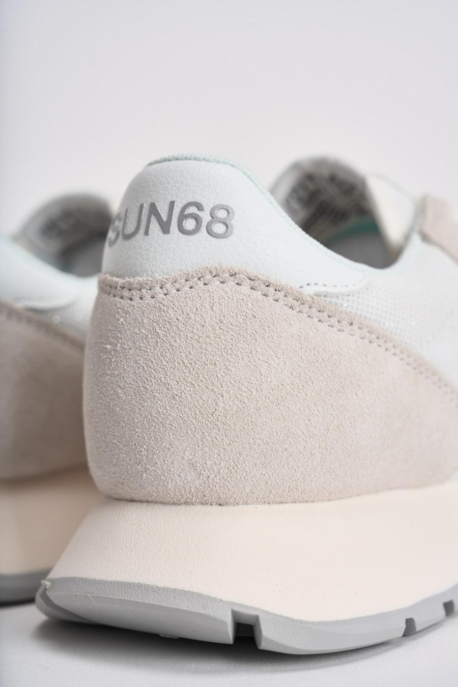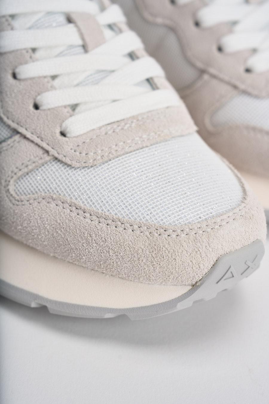 SUN68 Sneakers donna in suede bianche e silver. Modello in suede beige con inserti in tessuto glitter silver. Logo laterale ricamato a contrasto, talloncino bianco con scritta SUN68. Linguetta con etichetta logata e lettering decorativo. Suola in gomma dal colore naturale. Calzata regolare. Composizione: pelle e tessuto.