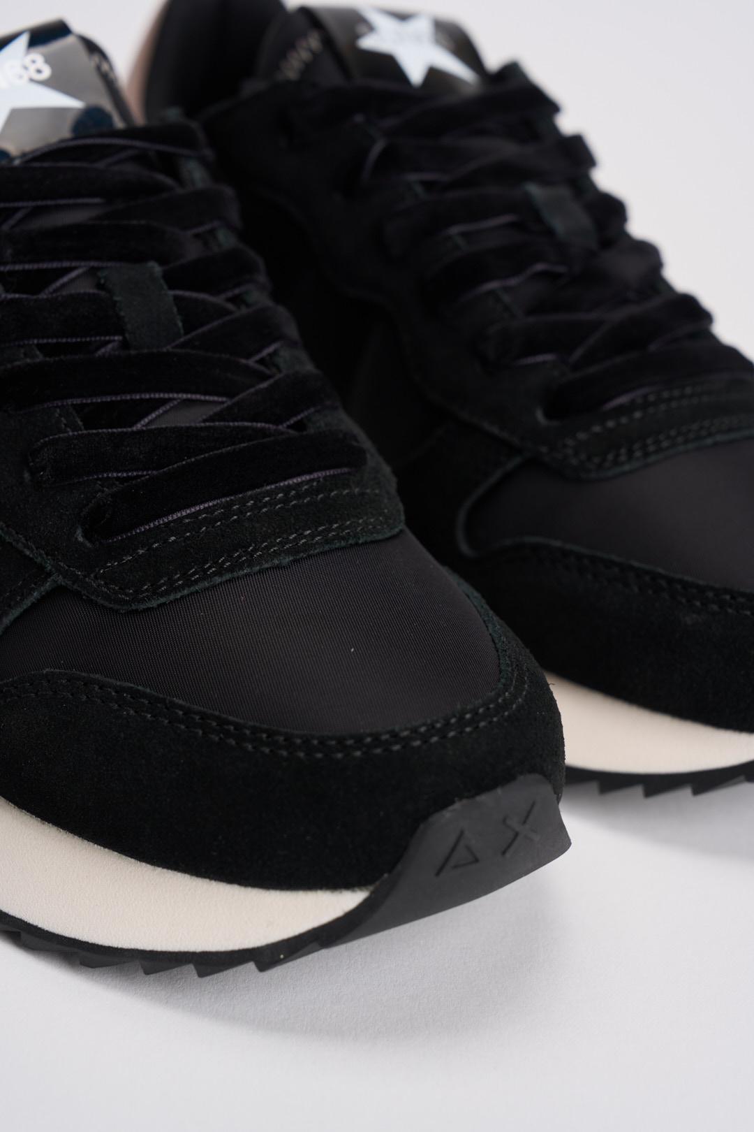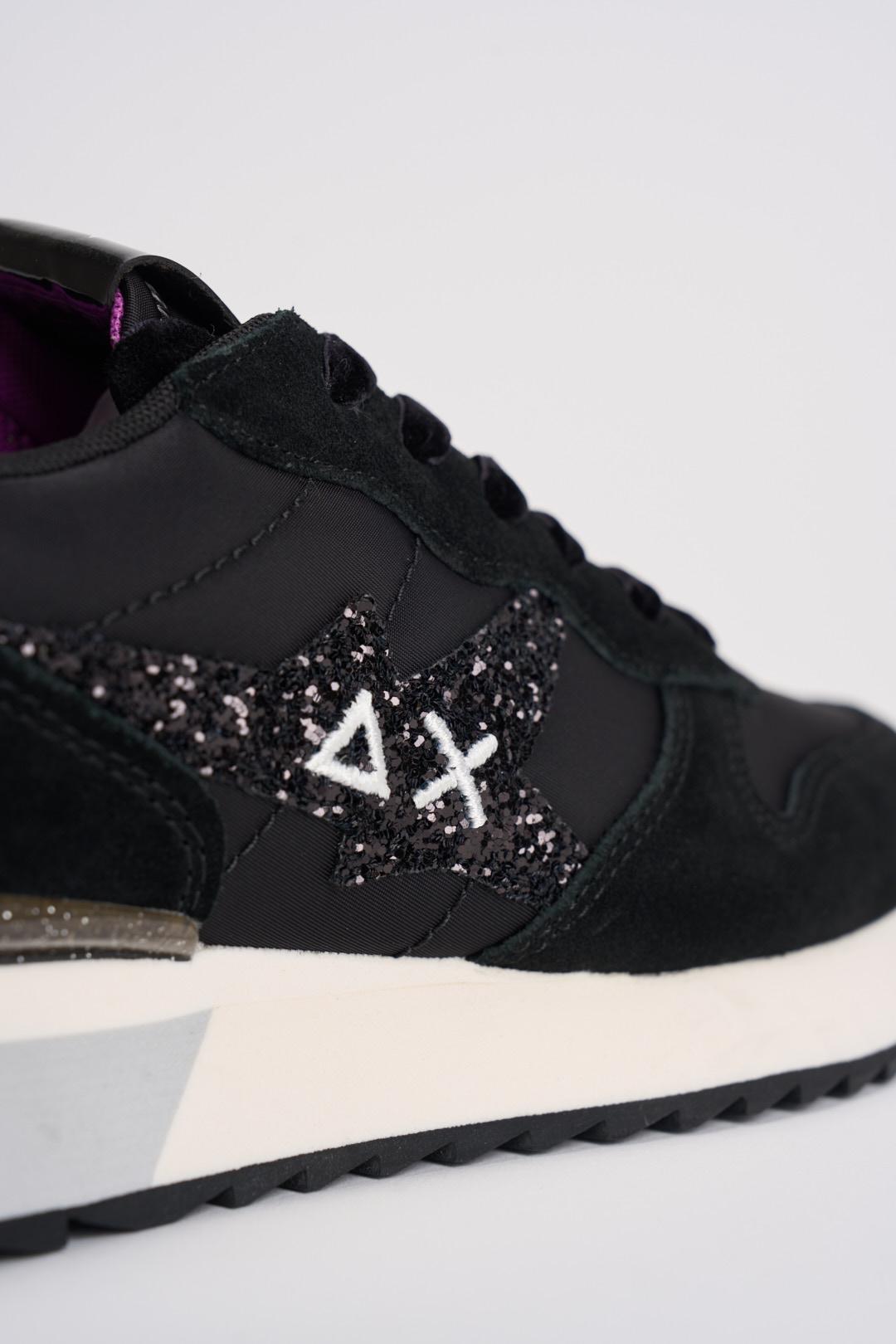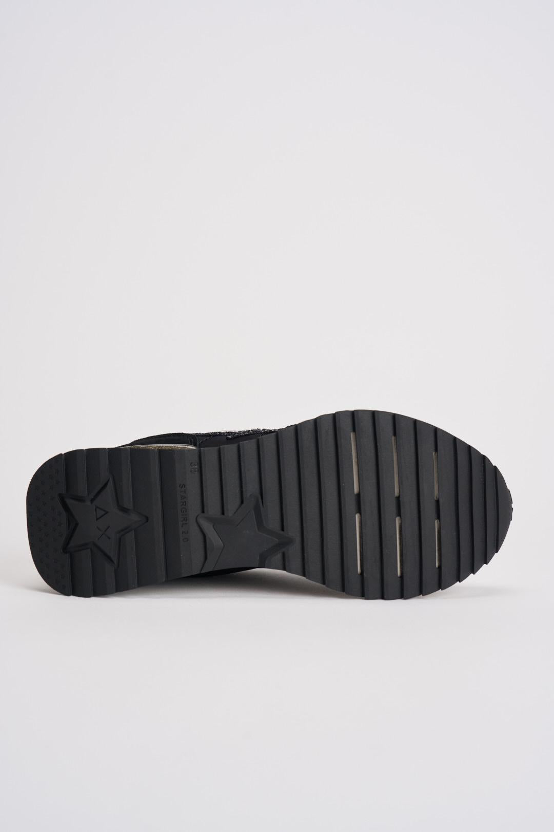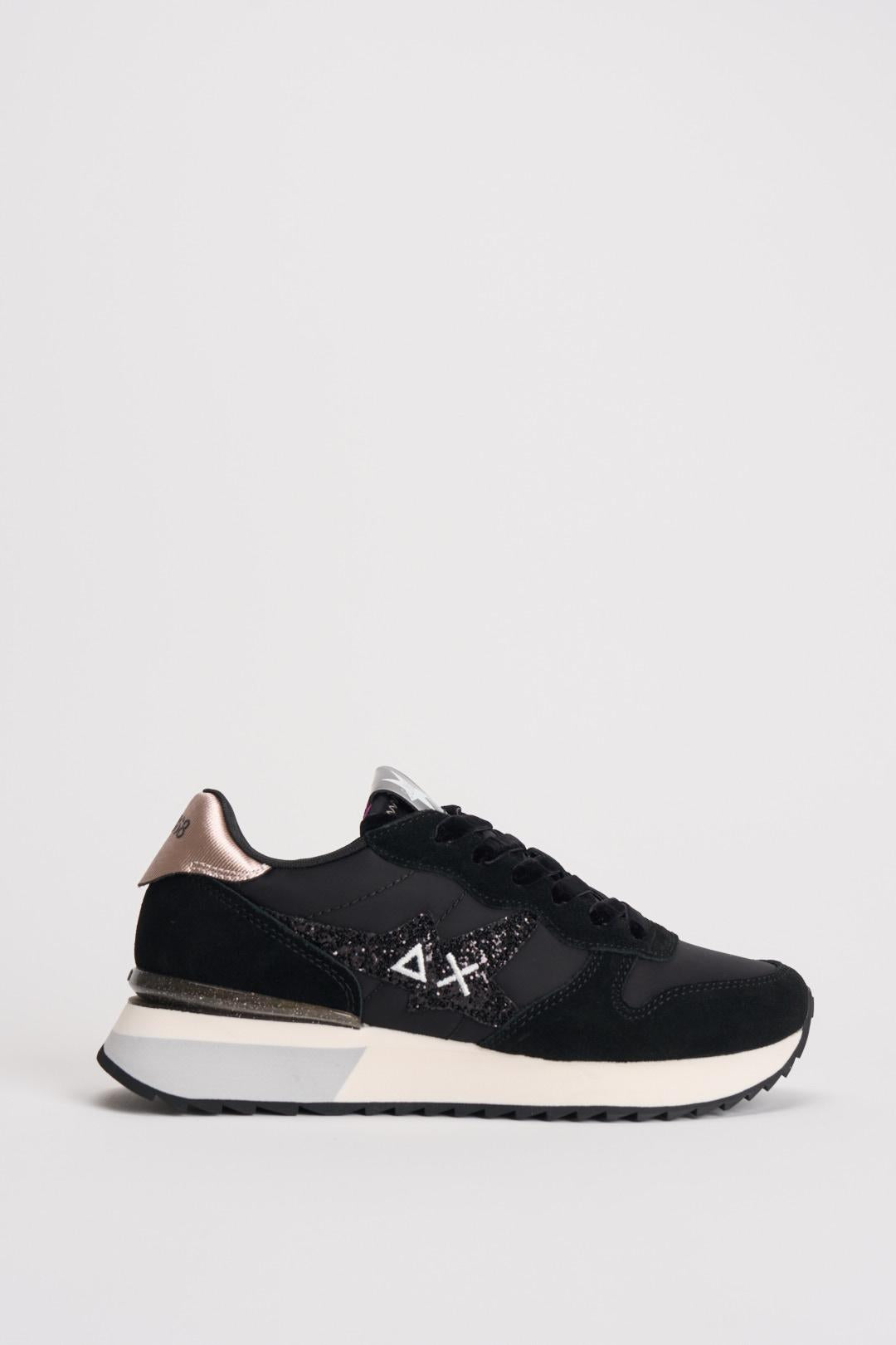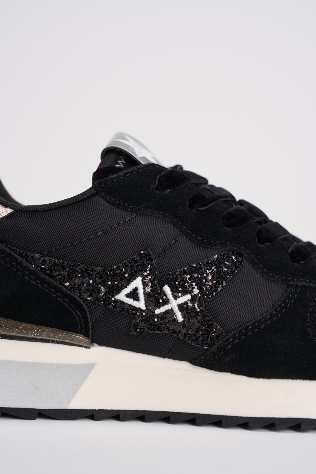 SUN68 Sneakers donna nera con glitter neri. Modello in pelle con inserti in suede neri. Talloncino in rosa laminato. Simbolo brand ricamato in bianco sul laterale. Calzata regolare.