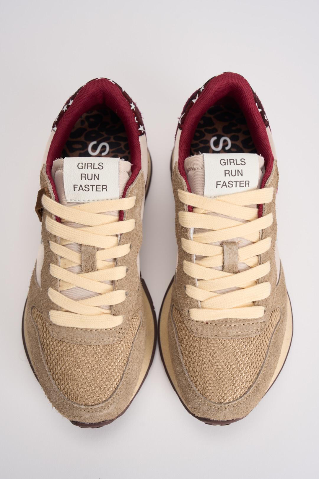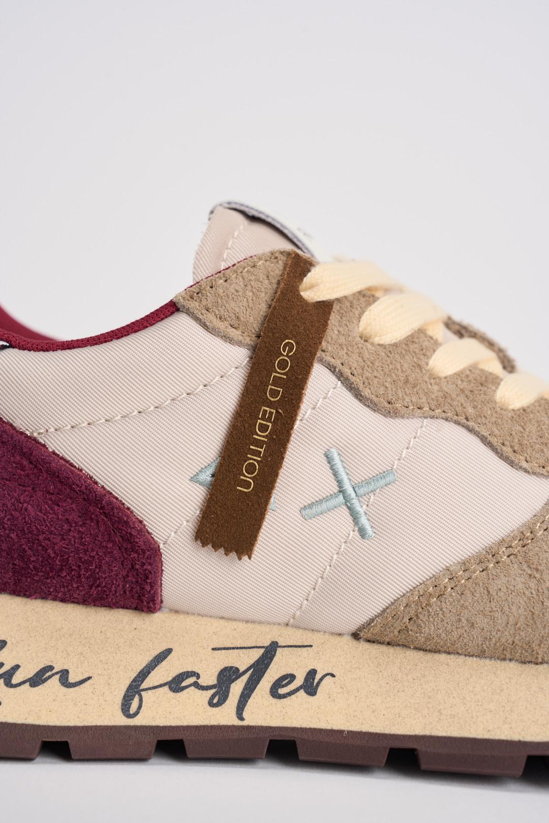SUN68 Sneakers donna panna e bordeaux. Modello con tallone in suede borseaux e talloncino in pelle bordeaux con stelle bianche. Tomaia in pelle bianca con inserti in suede beige, soletta estraibile in lattice e tessuto. Ricamo logo laterale in panna, suola in gomma con scritta Run Faster. Calzata regolare.