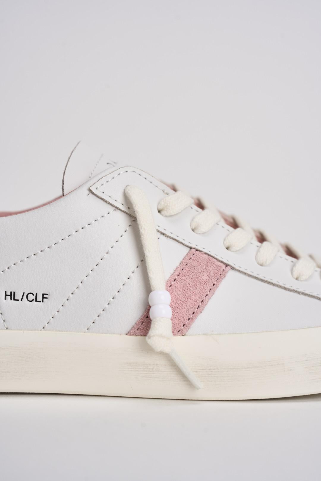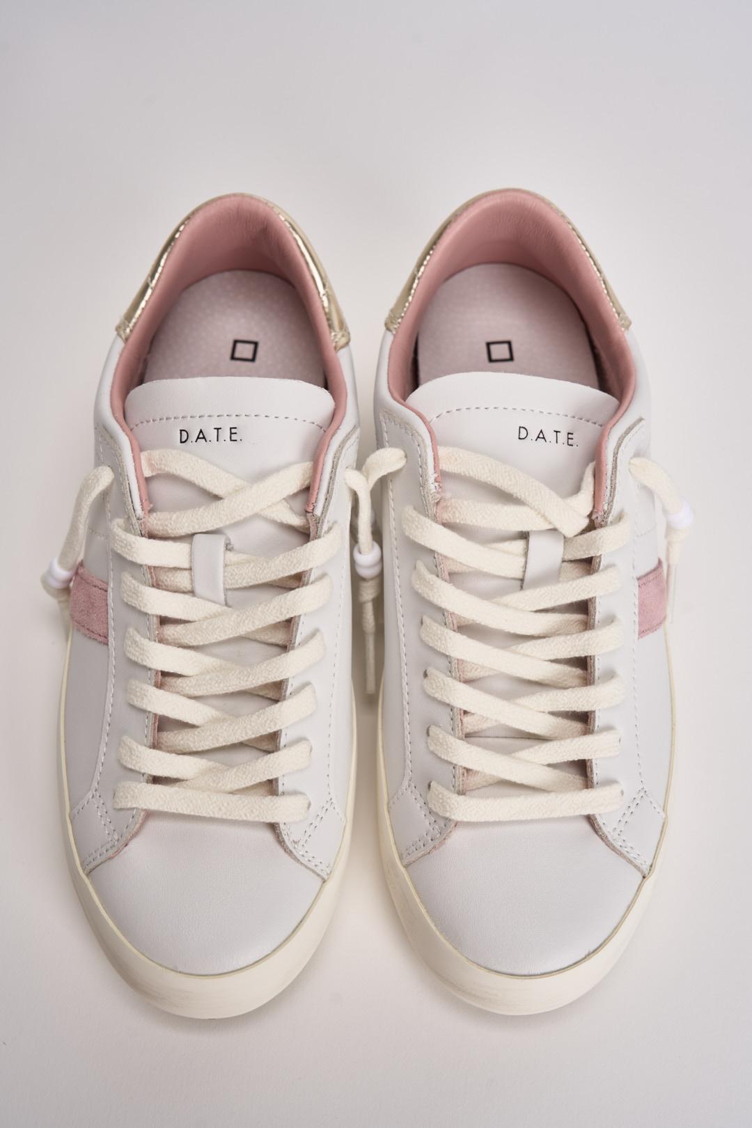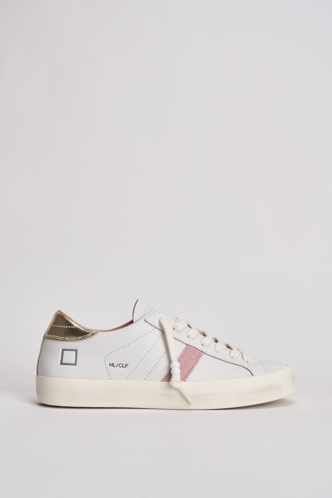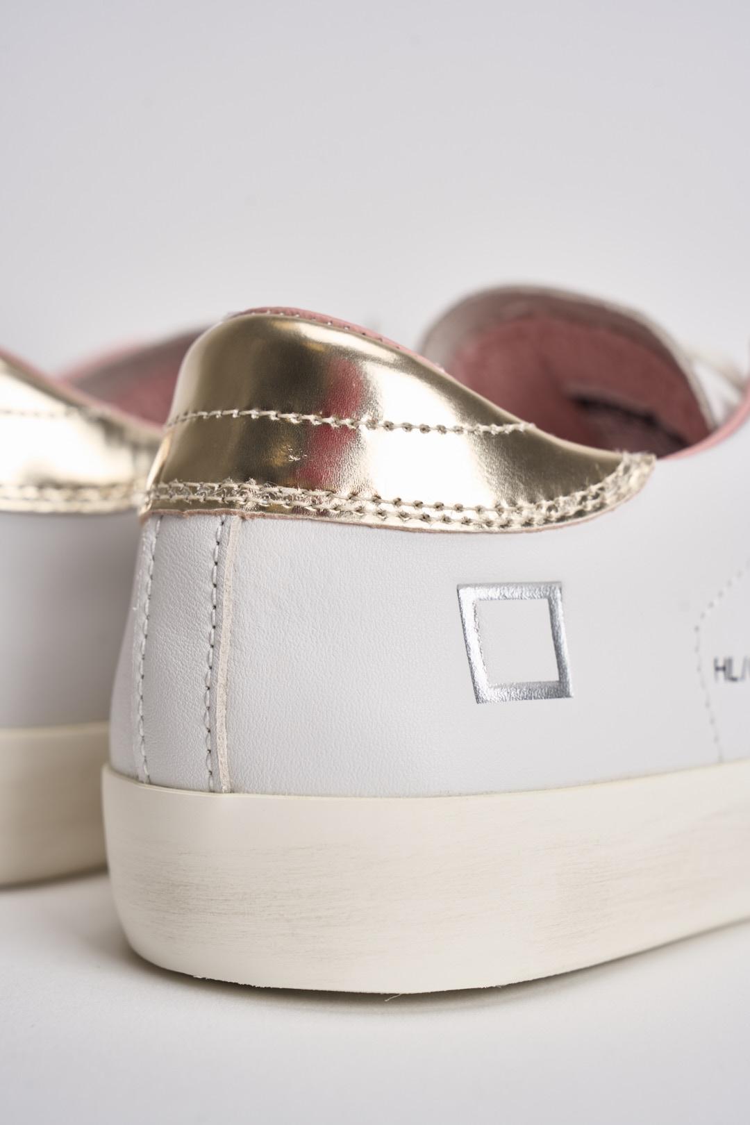 D.A.T.E Sneakers Hill Low donna. Sneakers bassa in pelle colore bianco. Linguetta in pelle in tono con logo D.A.T.E. impresso. Lacci in cotone. Il logo quadrato e il nome del modello sono impressi lateralmente. Banda laterale in suede colore rosa. Talloncino posteriore in pelle lucida colore oro. Fodera in pelle e spugna di cotone. Soletta interna rialzata di 2 cm per un miglior comfort. La suola in gomma, con leggero effetto used, è alta 3 cm. Calzata: regolare.