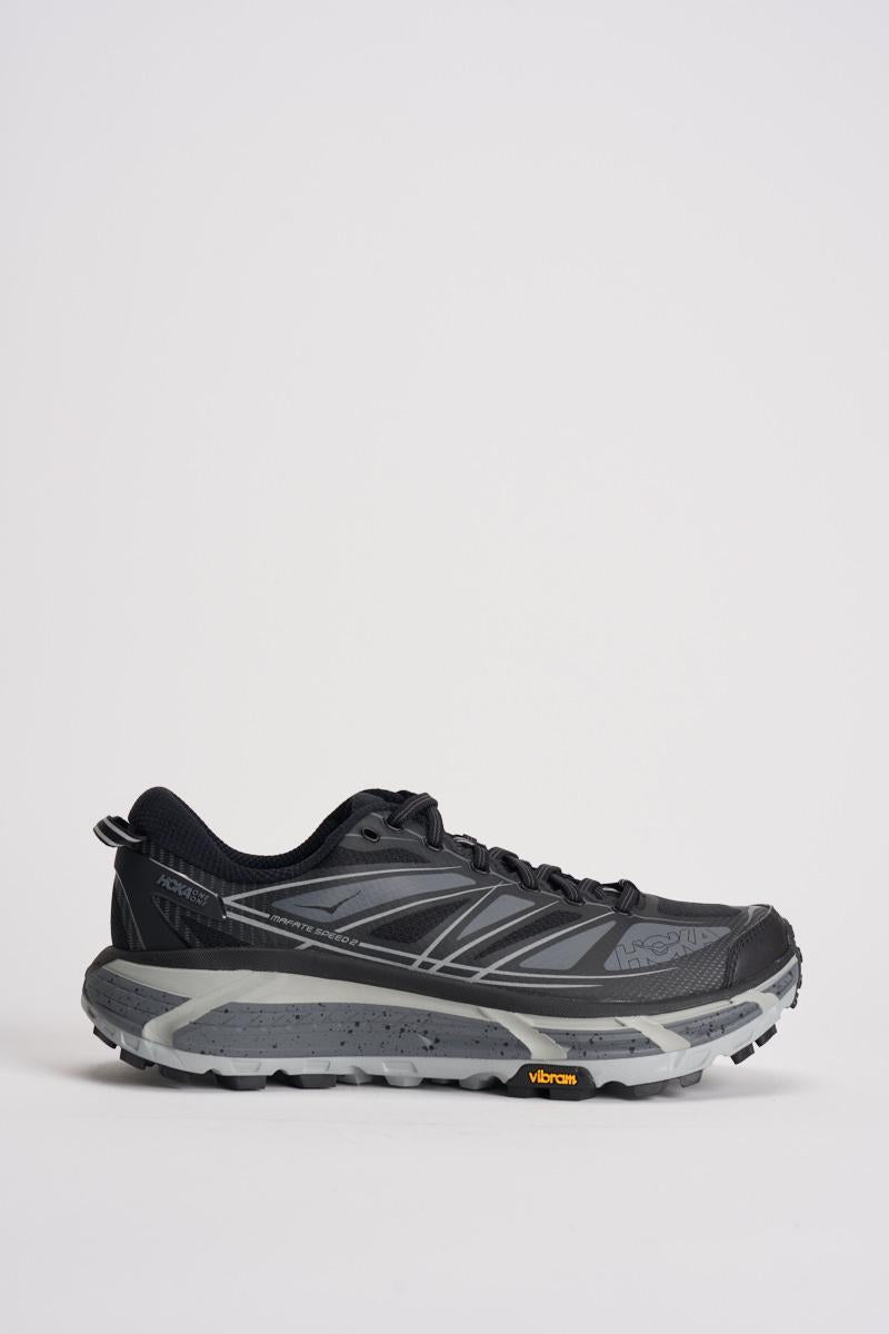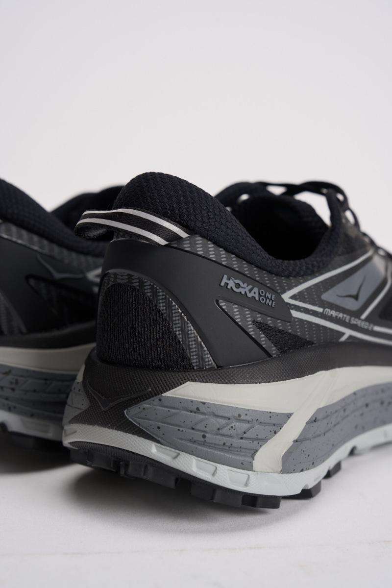 HOKA Sneakers uomo Mafate Speed 2 nere. Modello con struttura SpeedFrame leggera e senza cuciture, schermo esterno in monomesh e contrafforte del tallone esterno leggero in TPU. Geometria con MetaRocker vicino al collo del piede e parte superiore dellintersuola in CMEVA ammortizzata e leggera. Suola Vibram® Megagrip, differenziale di 4 mm fra tallone e punta. Calzata regolare.