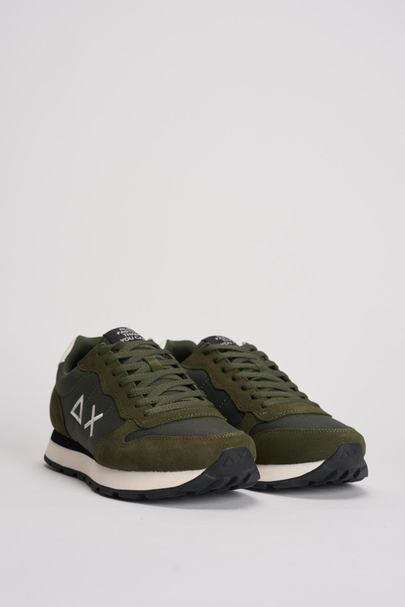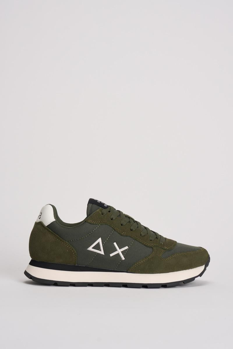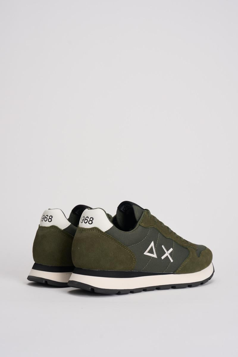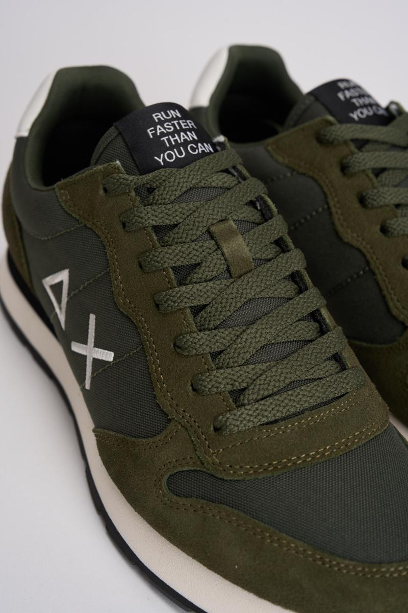 SUN68 Sneakers Tom Classic uomo. a sneaker Tom Classic ha un design running leggero per il massimo comfort e un'estetica sobria. Logo laterale. Realizzata in pelle con dettagli in suede. Chiusura con lacci in cotone. Logo ricamato sul lato. Suola in EVA. Colore: verde militare e grigio.