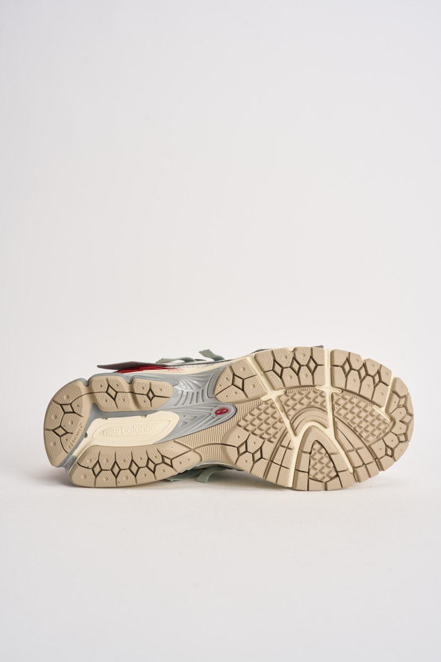 NEW BALANCE Sneakers uomo 1906R verde e rosse. Modello con intersuola ABZORB-SBS, dettagli di camoscio e pelle liscia di colore tortora. Calzano precise.