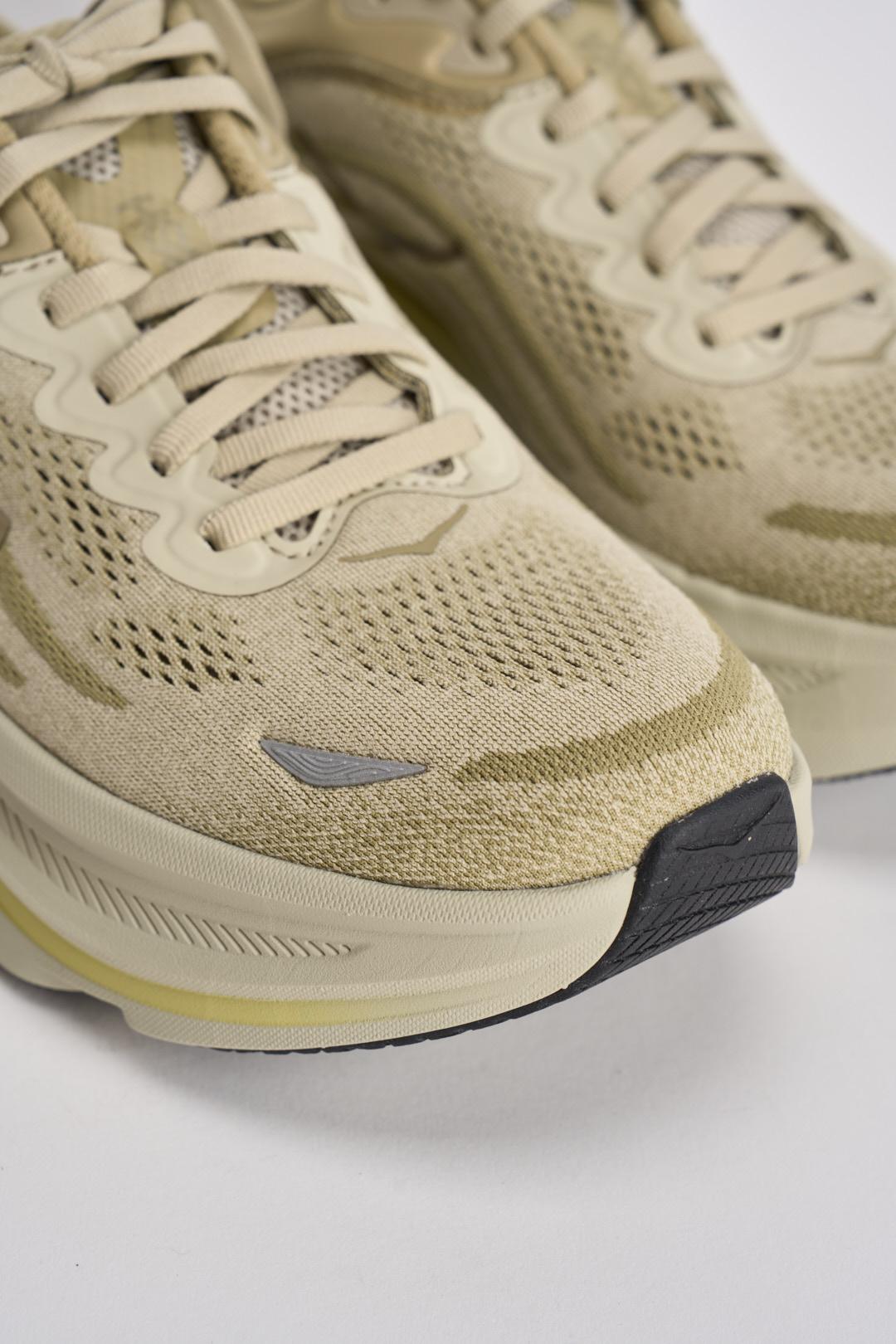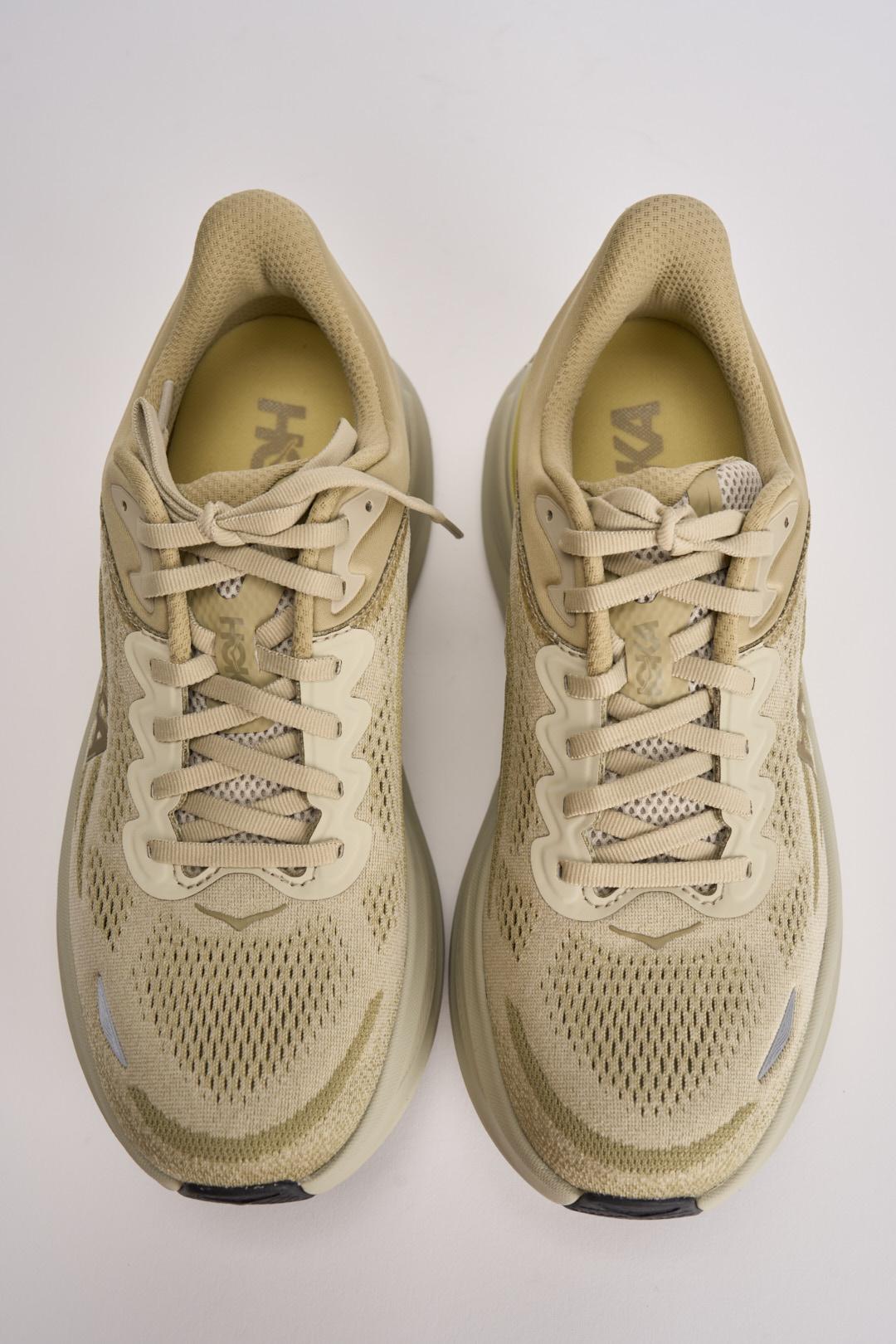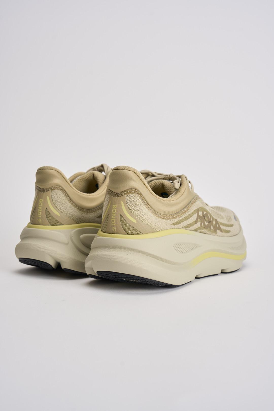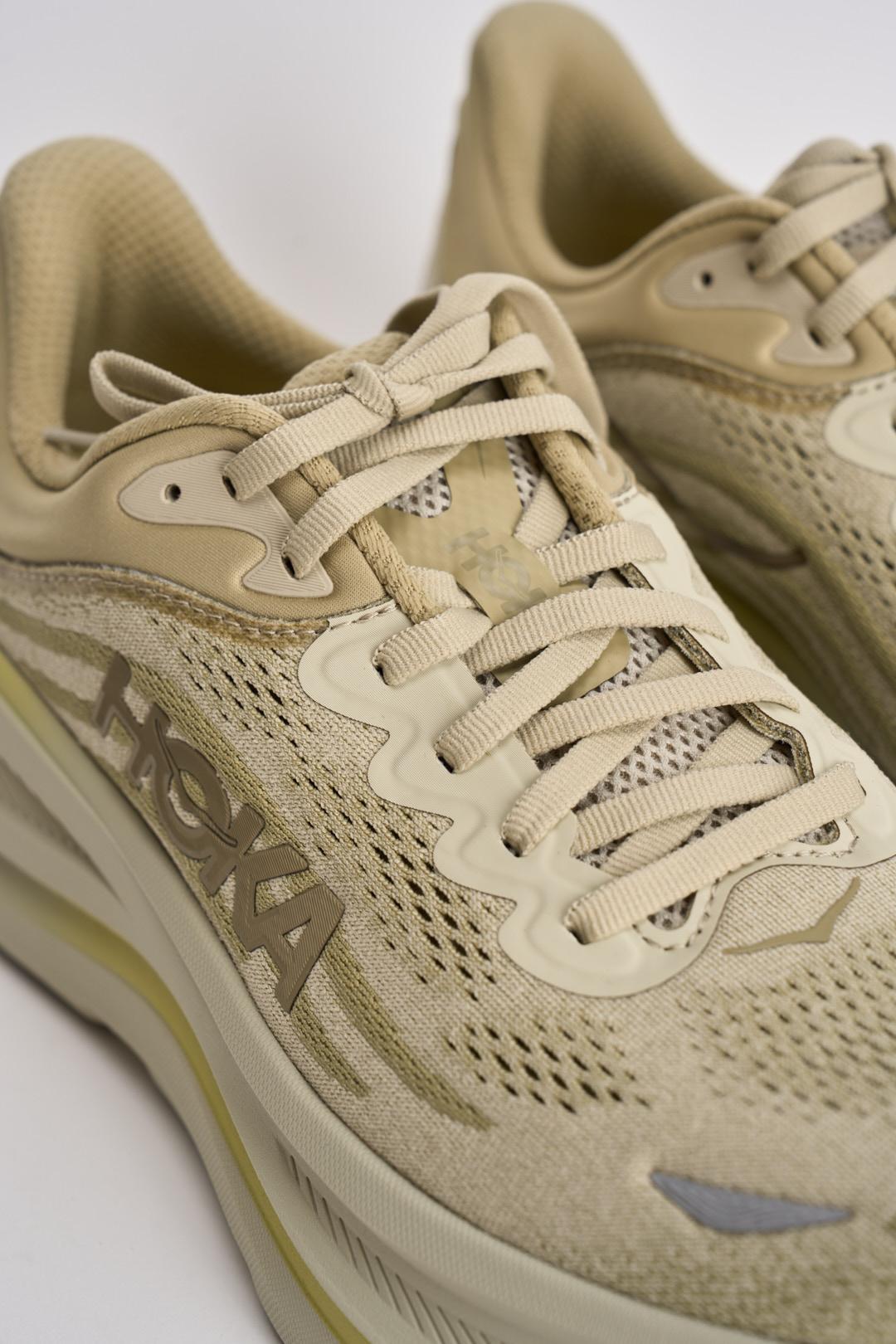 HOKA Sneakers uomo Bondi 9 crema. Modello con collarino sagomato 3D, mesh tecnico con poliestere riciclato, dettagli catarifrangenti sulla tomaia, tirante allungato sul tallone. MetaRocker fluido, active Foot Frame concentrato sul retropiede. Soletta sagomata in EVA e suola in Durabrasion Rubber. Composizione: poliestere.
