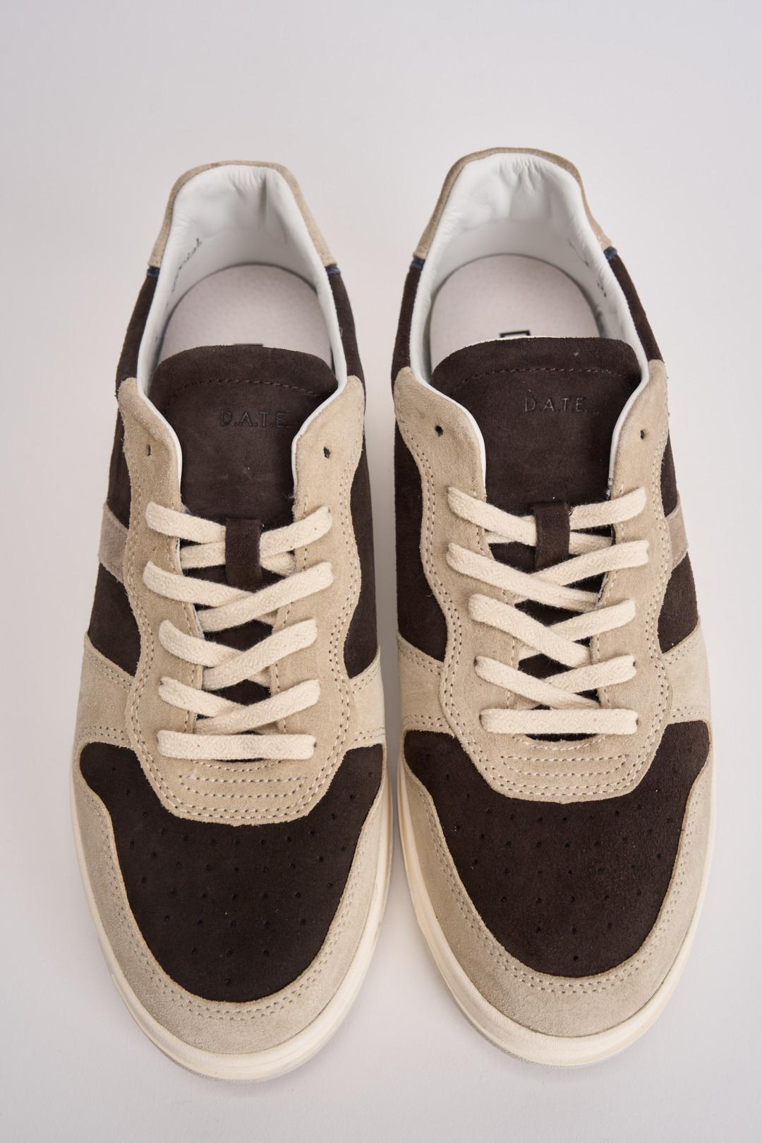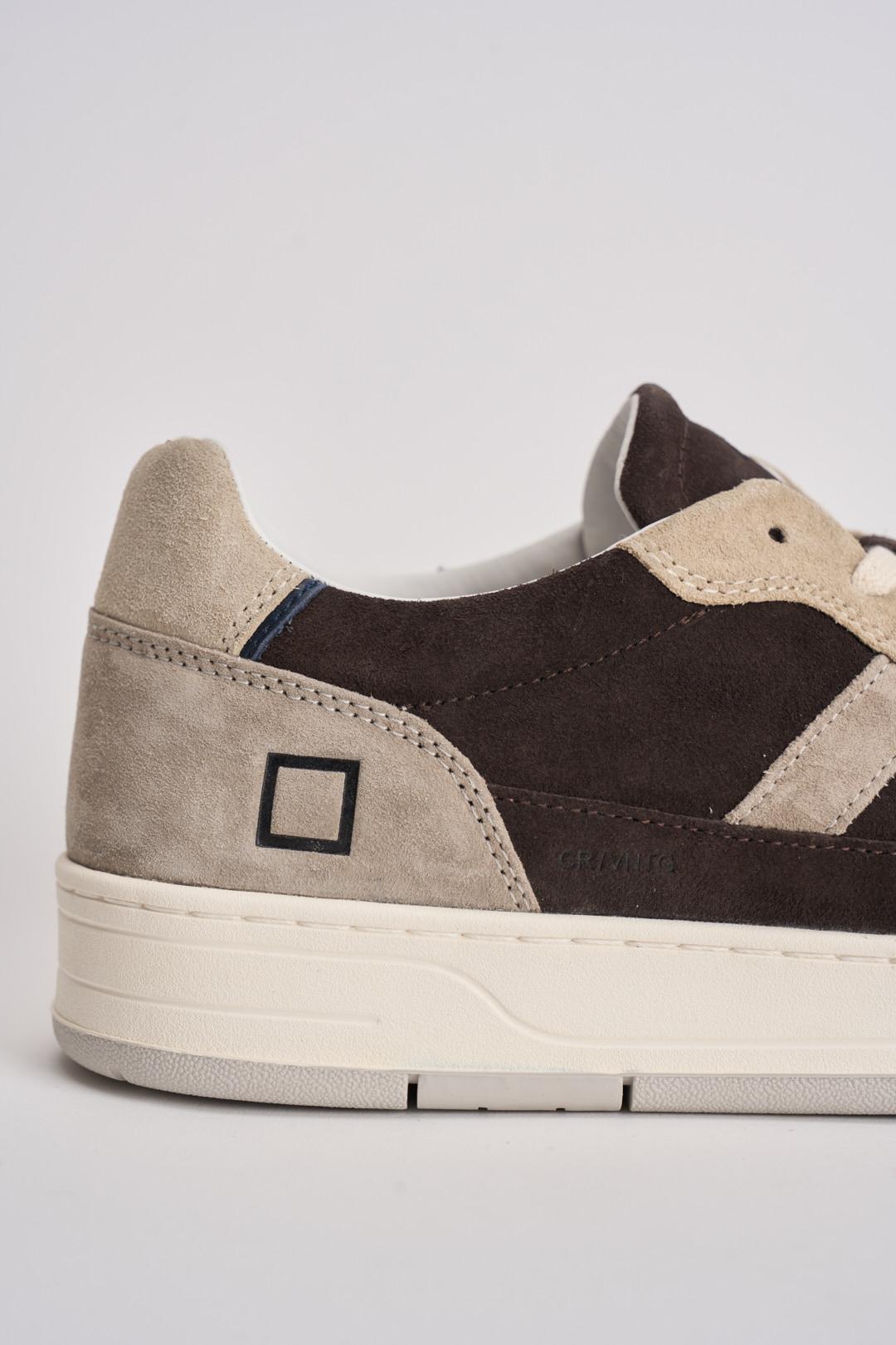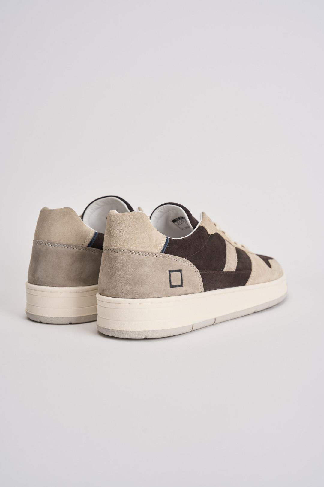 D.A.T.E. Sneakers uomo Court marrone e grigio. Modello con inserti in suede grigio. La punta è traforata per una maggiore traspirazione. Sulla linguetta è impressa la scritta D.A.T.E. I lacci sono in cotone. Il codice e il logo quadrato sono impressi lateralmente. La banda laterale e il talloncino è in suede colore grigio. Fodera in pelle e spugna di cotone. Il soletto interno è rialzato di 2.5 cm. La suola in gomma, alta 2.5 - 3 cm. Calzata regolare.