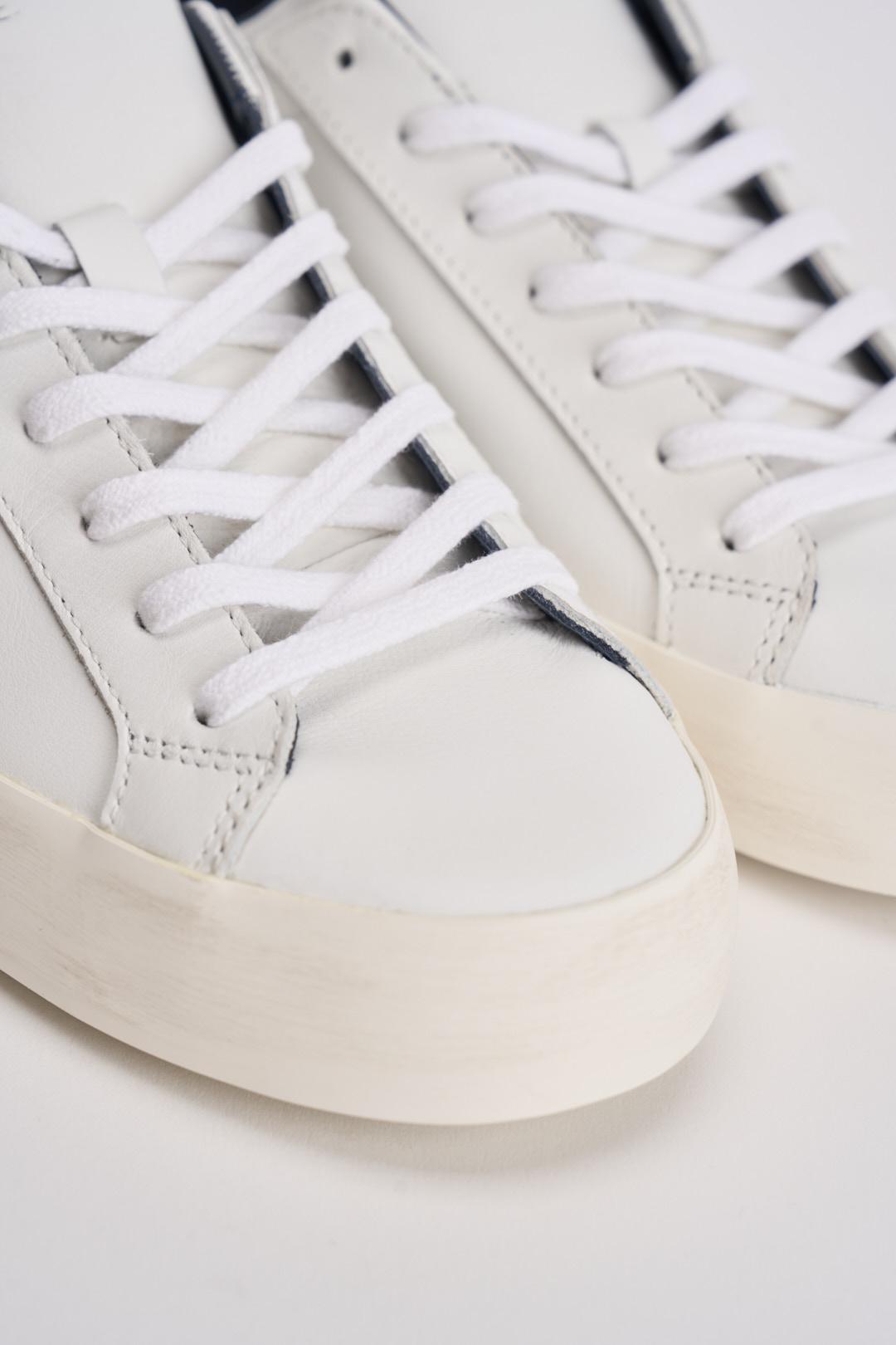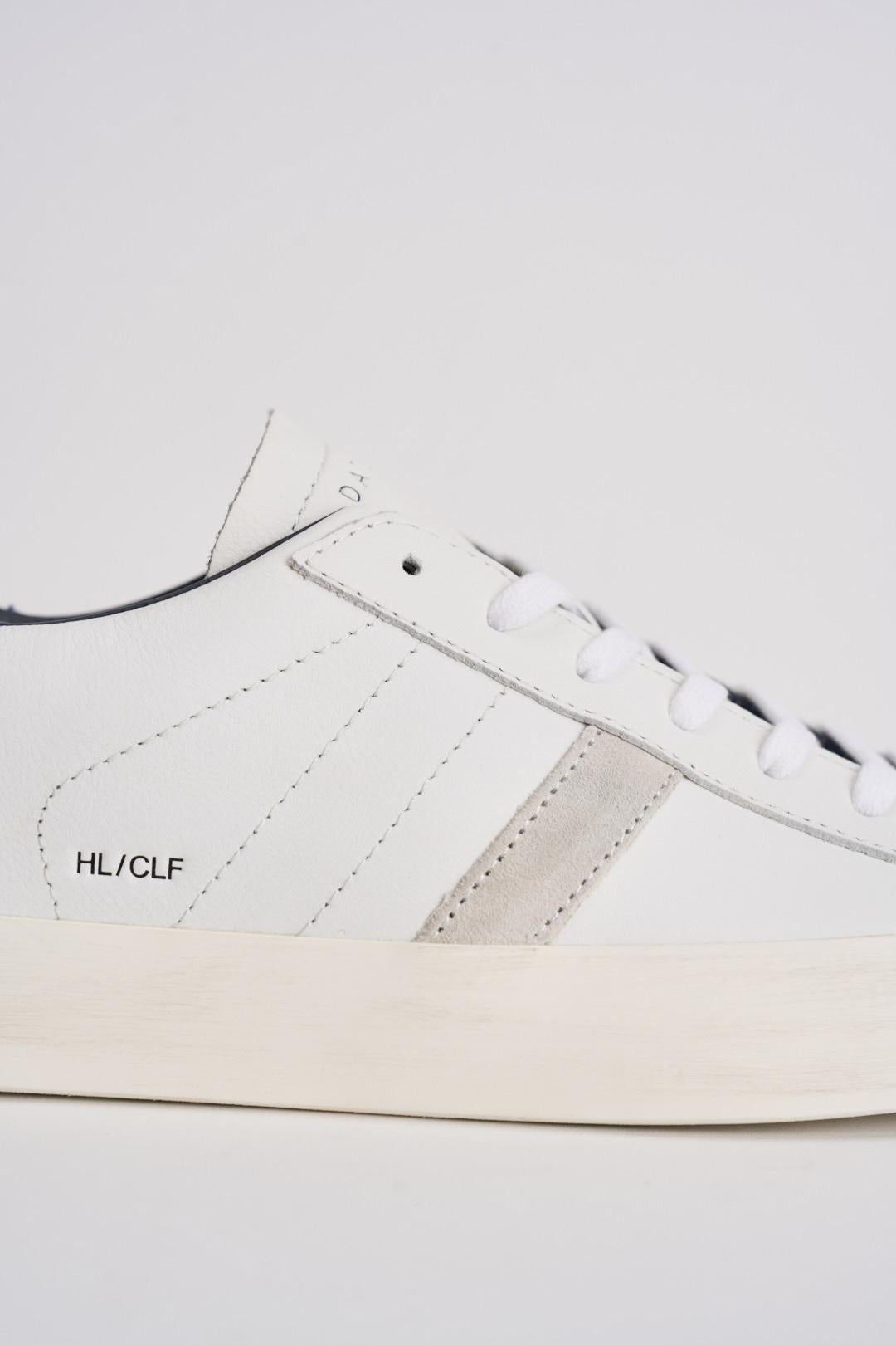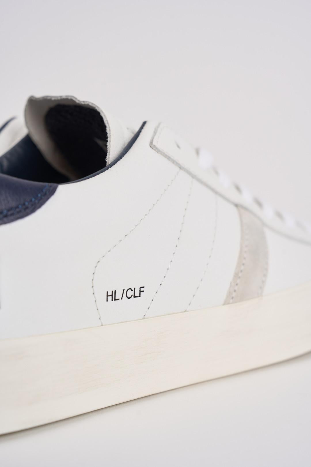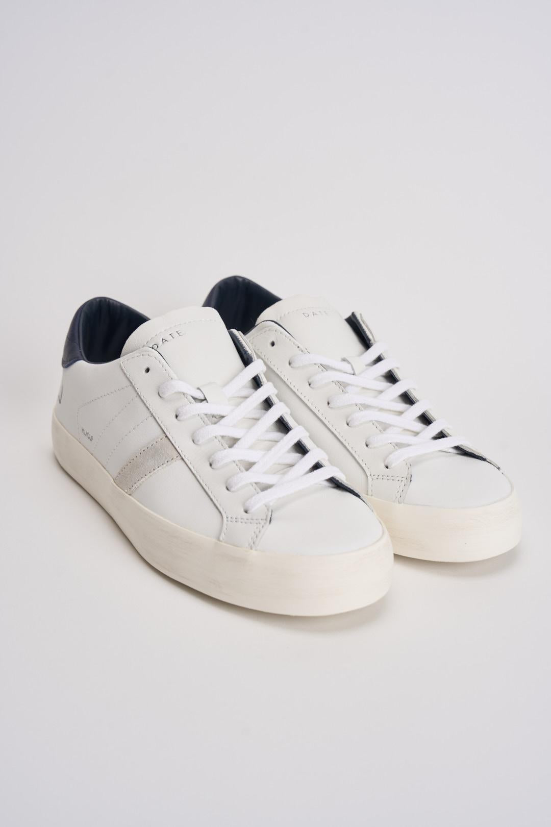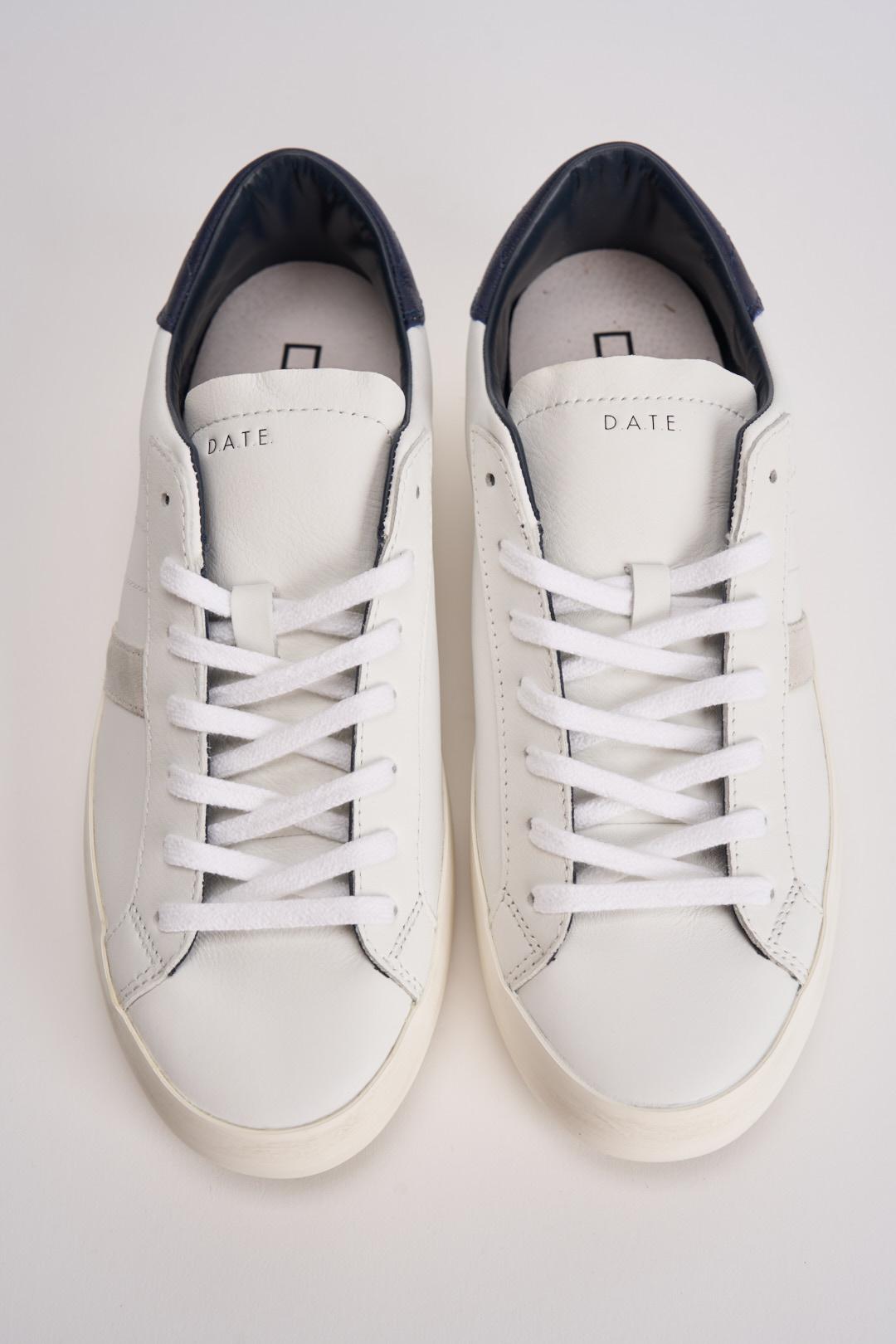 D.A.T.E. Sneakers uomo Hill low calf bianco e blu. Modello con linguetta in pelle tono su tono con impressa la scritta D.A.T.E. Logo quadrato e codice impressi lateralmente. La banda laterale è in suede grigia. Il talloncino posteriore è in pelle blu. Fodera in pelle e spugna di cotone. Lacci in cotone. Il soletto interno è rialzato di 2.5 cm. Suola in gomma alta 3 cm. Calzata regolare.