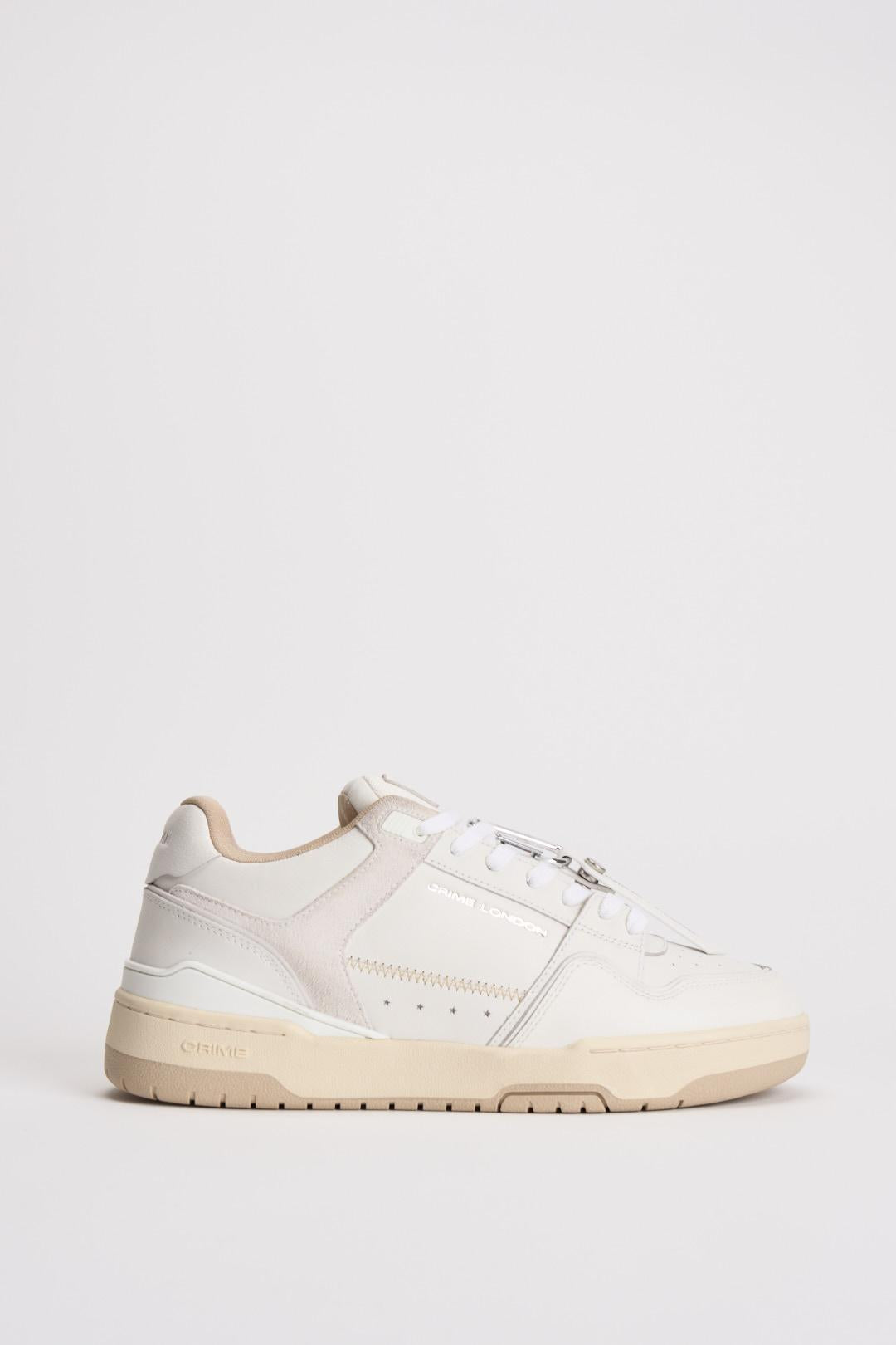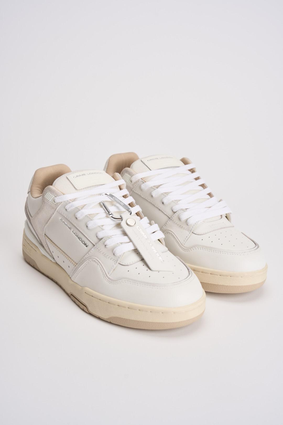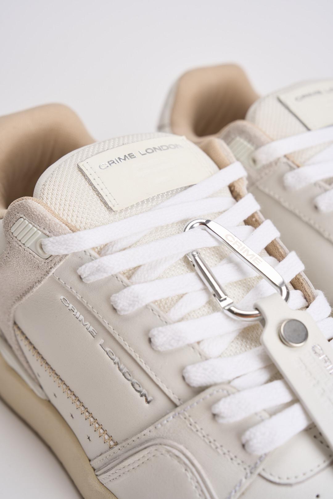 CRIME LONDON Sneakers uomo in pelle bianche. Made in Italy. Tomaia in pelle bianca e dettagli in suede bianco. Talloncino in pelle bianca. Linguetta logata. Lacci bianchi in cotone. Tag in pelle bianco con moschettone. Fodera in tessuto. Suola in gomma crema. Calzata regolare.
