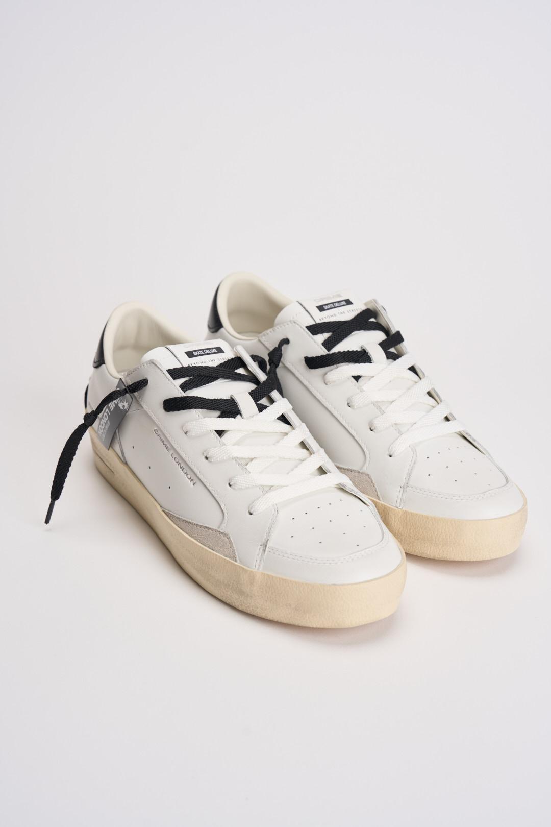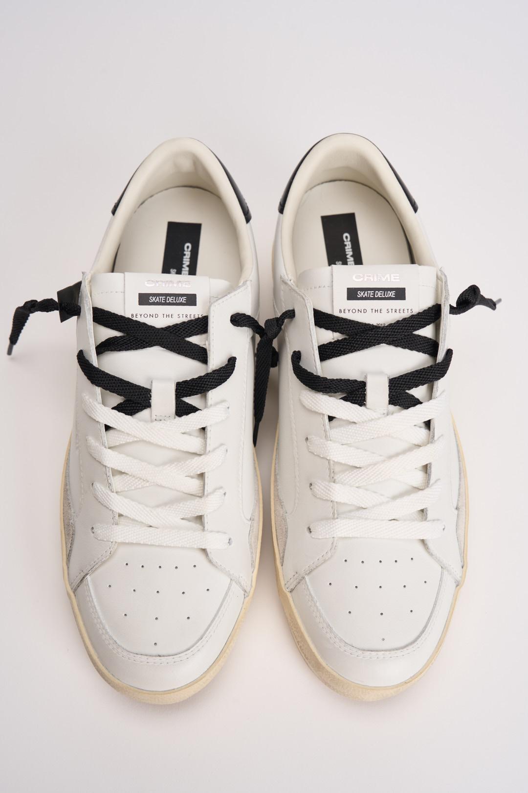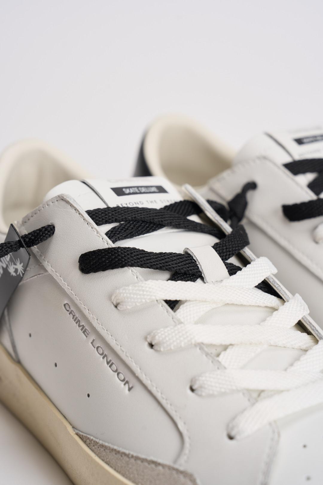 CRIME LONDON Sneakers uomo in pelle bianche e nere. Modello con talloncino in pelle nero e dettagli in suede grigio chiaro. Effetto distressed su tomaia e suola. Linguetta con label in pelle logata e testo stampato Beyond The Streets. Patch in pelle sul retro, tag nero in gomma e palme stampate. Composizione: pelle. Calzata regolare.