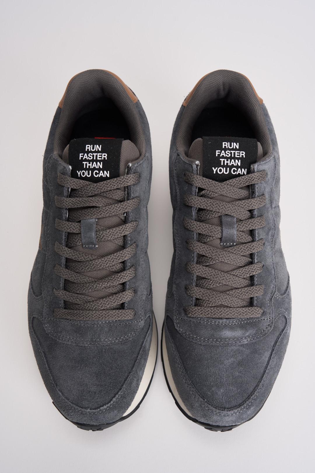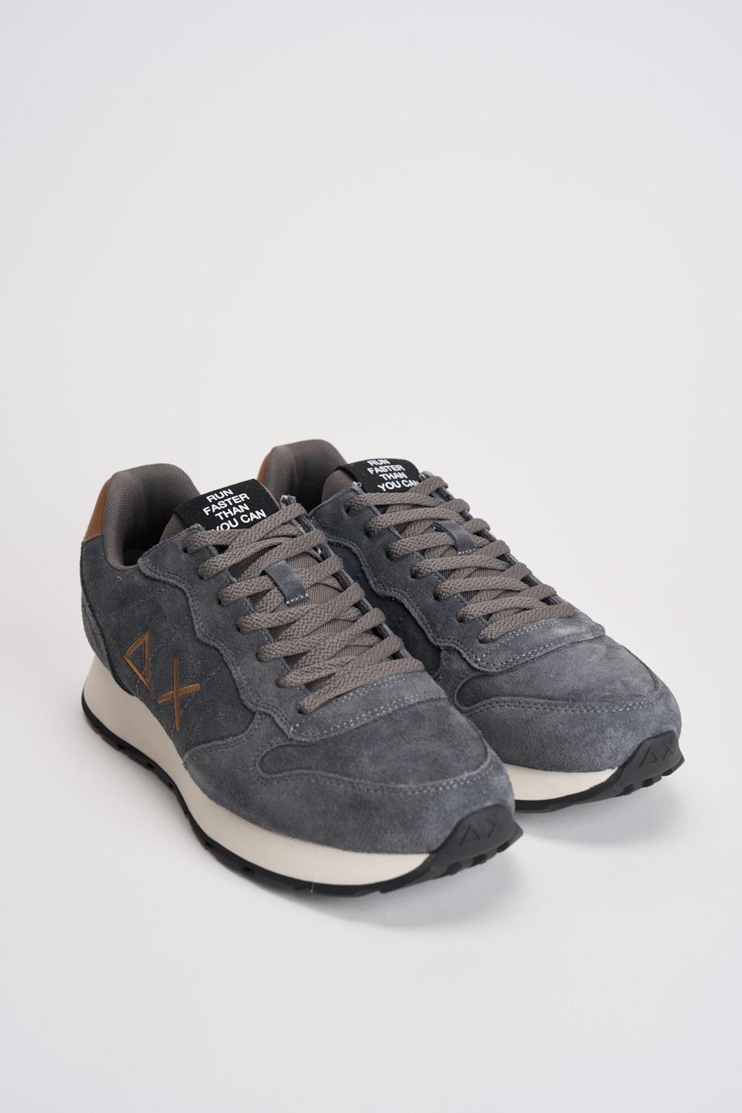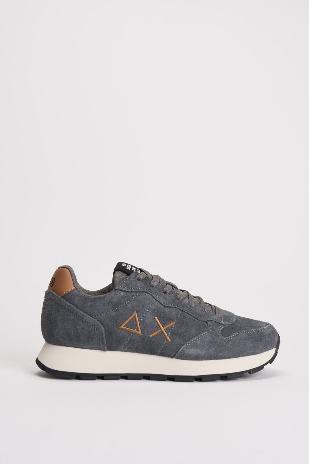 SUN68 Sneakers uomo in suede grigie. Modello in pelle con talloncino in pelle arancione e logo ricamato arancione. Linguetta con etichetta nera. Calzata regolare.