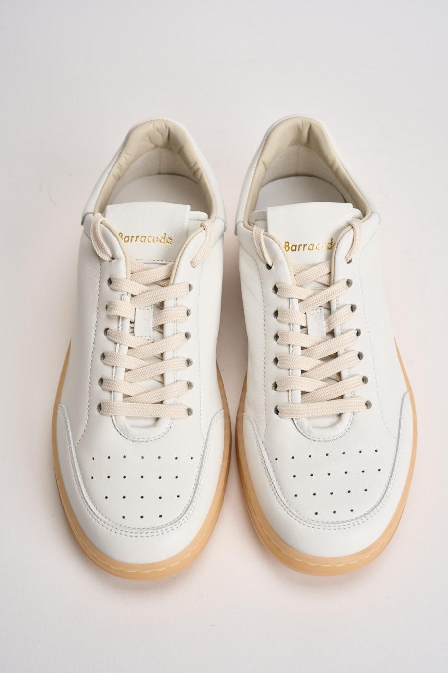 BARRACUDA Sneakers uomo Jordan bianche. Modello realizzato in pelle liscia di colore bianco. Il modello presenta una silhouette low-top con chiusura frontale con lacci tono su tono e punta traforata per una migliore traspirabilità. La suola in gomma color miele dona un contrasto raffinato e un tocco rétro. Sul retro, il dettaglio distintivo è rappresentato dai tiranti decorativi a contrasto arancio e blu, insieme al logo stampato sul tallone. Composizione: 100% pelle. Calzata regolare.
