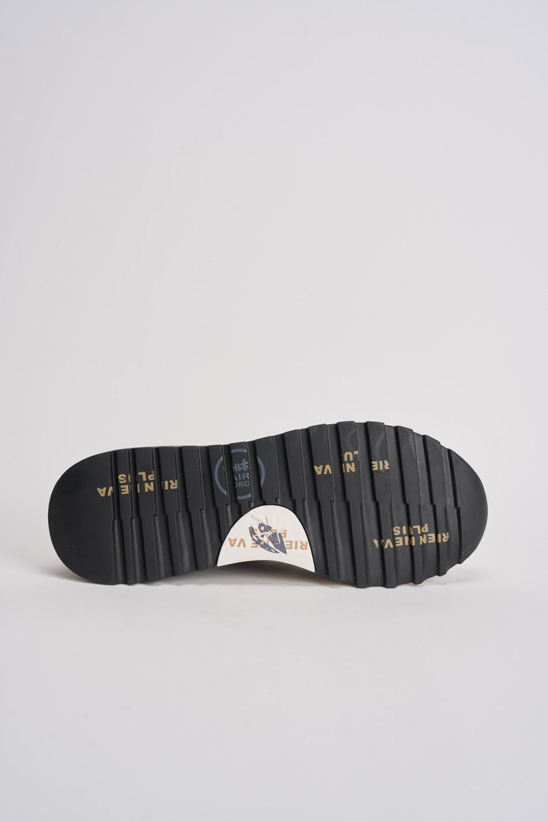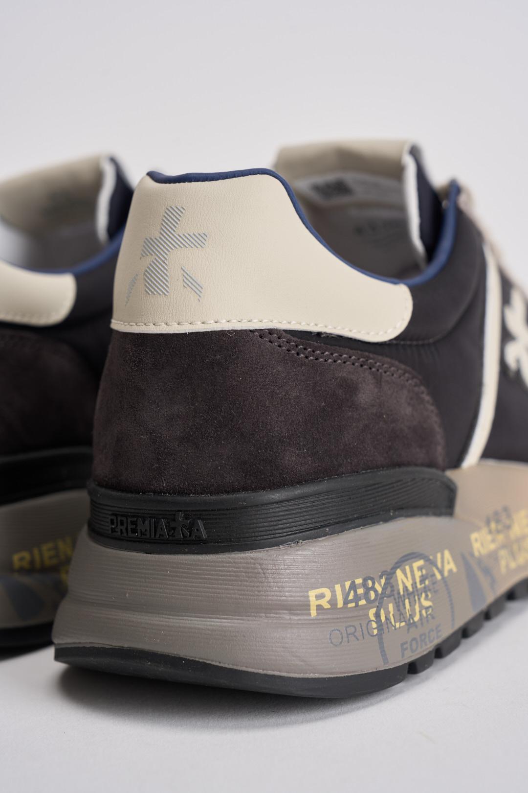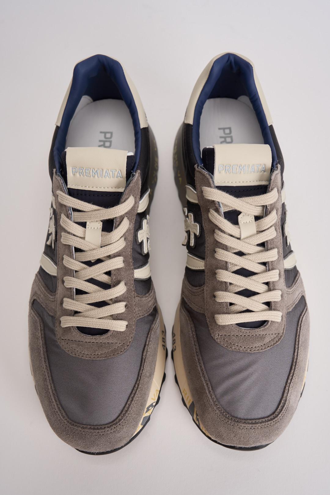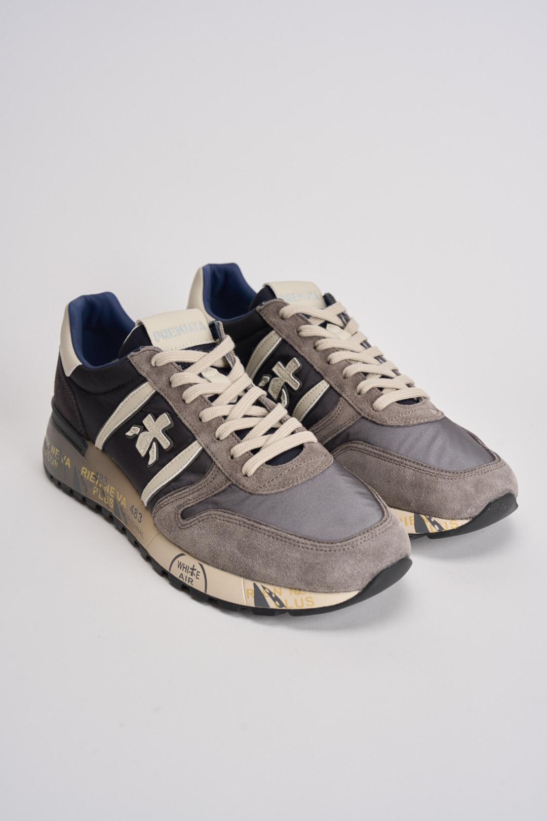 PREMIATA Sneakers uomo Lander 7203 grigia e blu. Pelle scamosciata e nylon. Dettagli in pelle bianca e grigia. Logo laterale bianco cucito in pelle. Suola oversize sfumata con stampa lettering. Altezza suola 4,2 cm. Composizione: 100% Pelle. Calzata regolare.