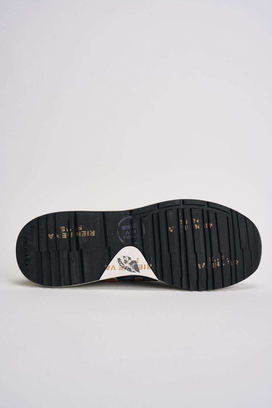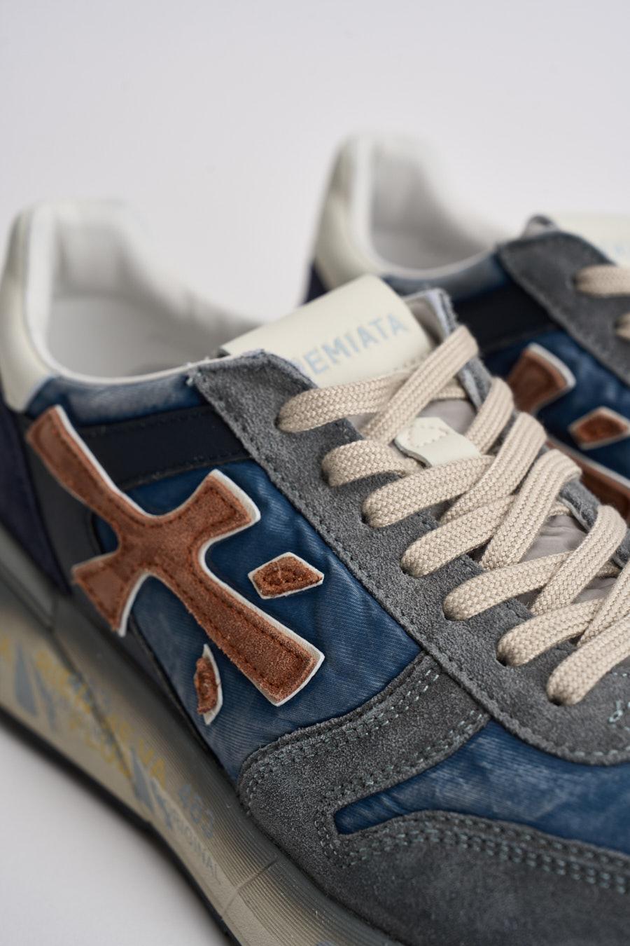 PREMIATA Sneakers uomo Mick blu. Modello con dettagli in camoscio blu e marrone. Talloncino bianco. Logo Premiata arancione laterale e spoiler sulla suola. Chiusura con lacci a contrasto. Altezza Suola 4,2 cm in gomma. Tomaia: 86% Pelle 14% poliuretano. Calzata regolare.