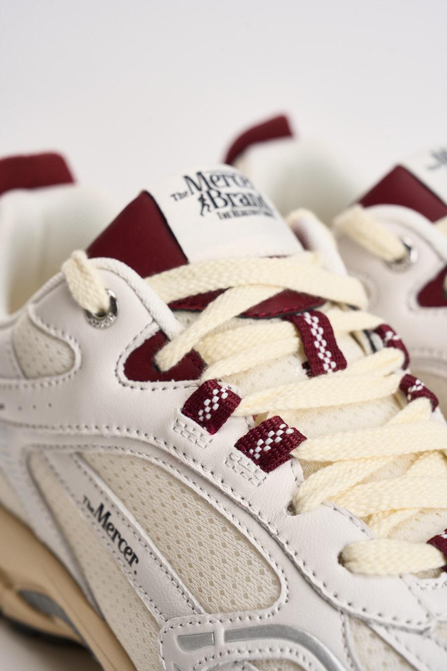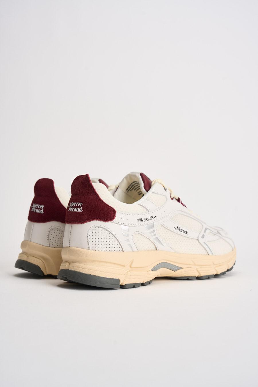 THE MERCER Sneakers uomo Rerun bordeaux e bianca. Modello stringato con inserti in mesh e pelle, dettagli a contrasto e suola chunky in gomma. Loghi stampati e ricamati su linguetta, lato e tallone. Composizione: pelle e tessuto. Calzata regolare.