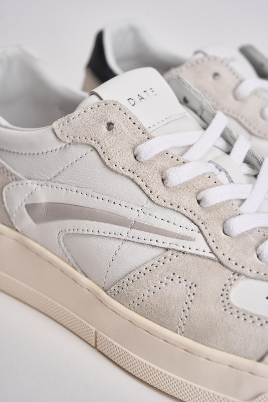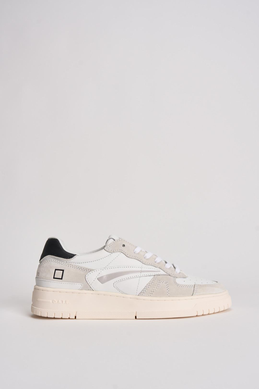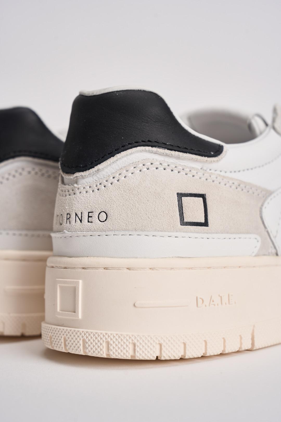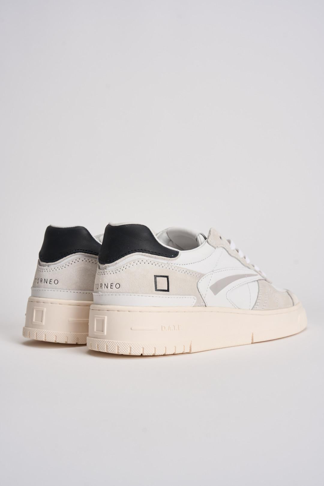 D.A.T.E. Sneakers uomo Torneo bianca e nera. Modello con punta traforata per una maggiore traspirazione. Sulla linguetta è impressa la scritta D.A.T.E. I lacci sono in cotone e il logo quadrato è impresso lateralmente. Dettaglio laterale impresso colore beige. Nome del modello impresso posteriormente. Fodera in pelle e spugna di cotone. Il soletto interno è rialzato di 2.5 cm per un migliore comfort. La suola in gomma, alta 2.5 - 4 cm, è cucita. Dettagli in suede beige. Composizione: pelle. Calzata regolare.