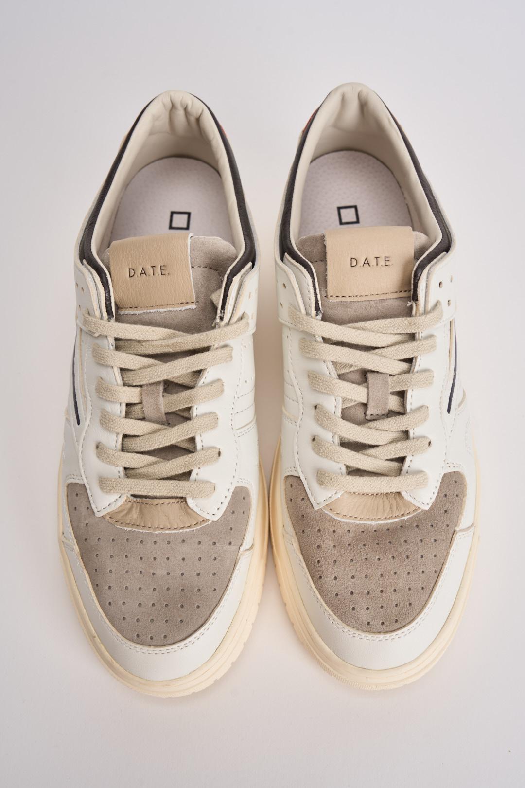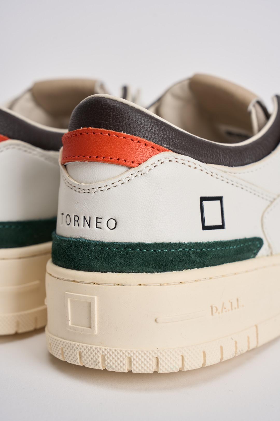 D.A.T.E. Sneakers uomo Torneo bianco e beige. Modello in pelle colore bianco e suede colore beige. La punta è traforata per una maggiore traspirazione. Sulla linguetta è impressa la scritta D.A.T.E. I lacci sono in cotone e il logo quadrato è impresso lateralmente. Collare in pelle colore verde militare. Nome del modello impresso posteriormente. Fodera in pelle e spugna di cotone. Il soletto interno è rialzato di 2.5 cm. La suola in gomma alta 2.5 - 4 cm. Calzata regolare.
