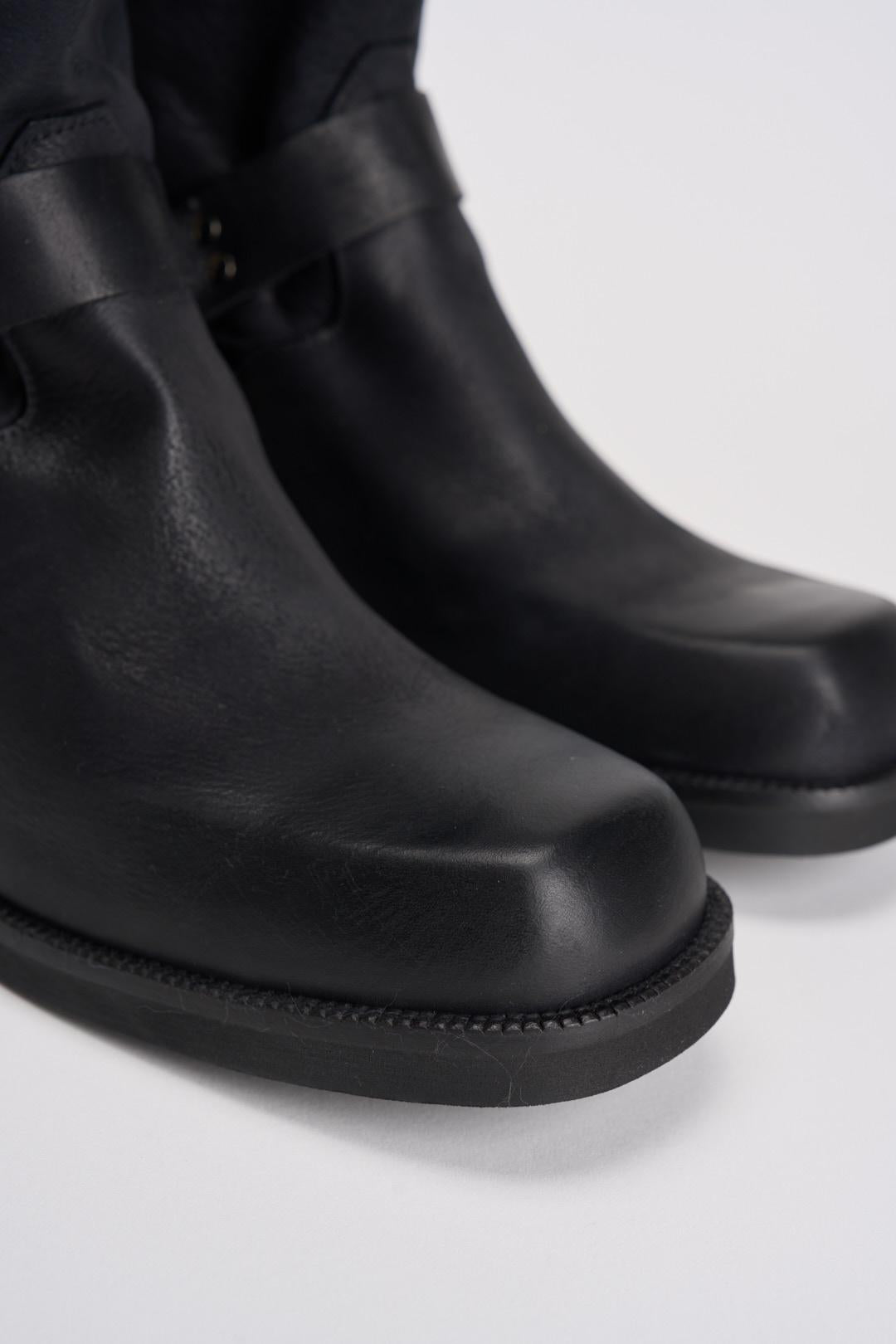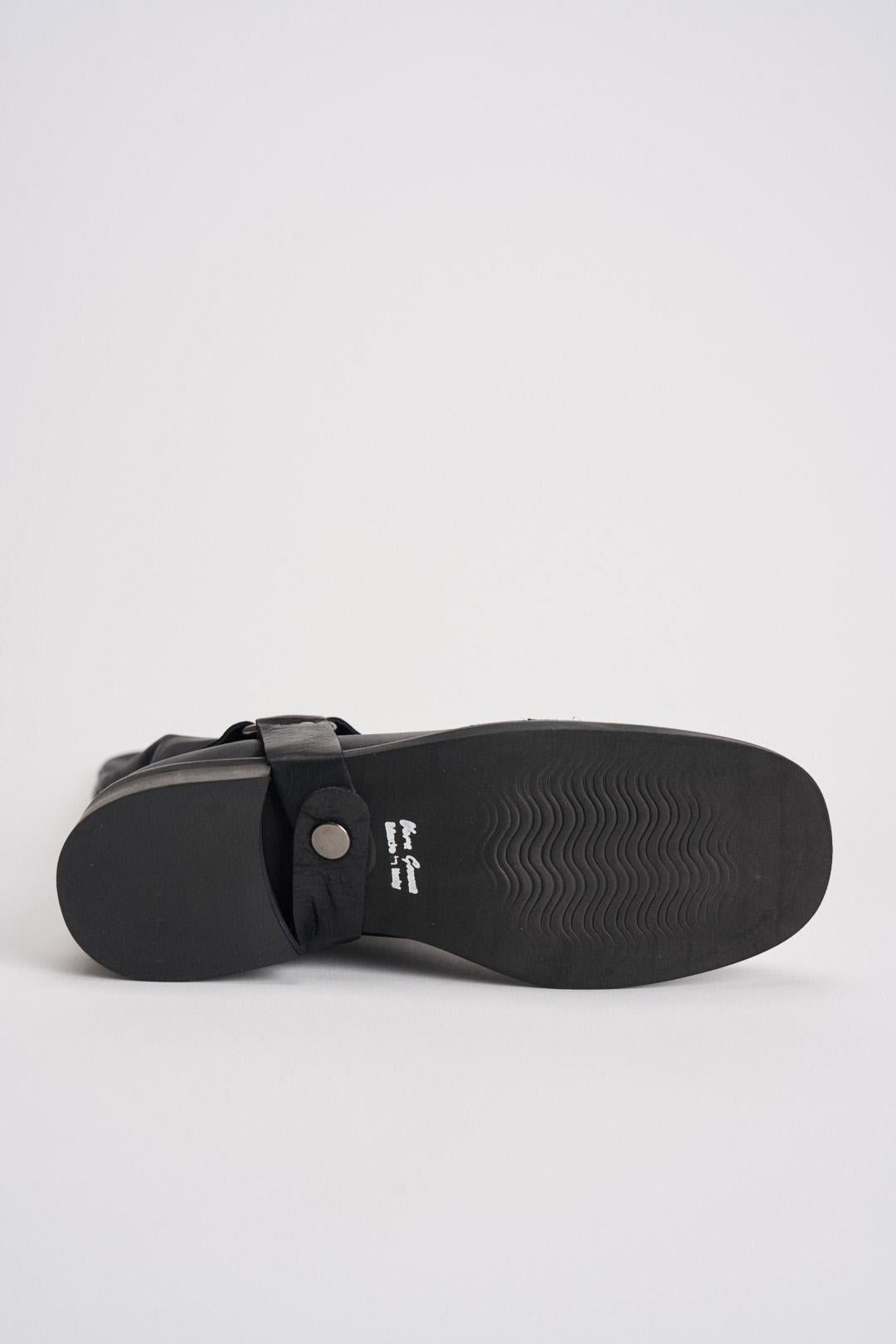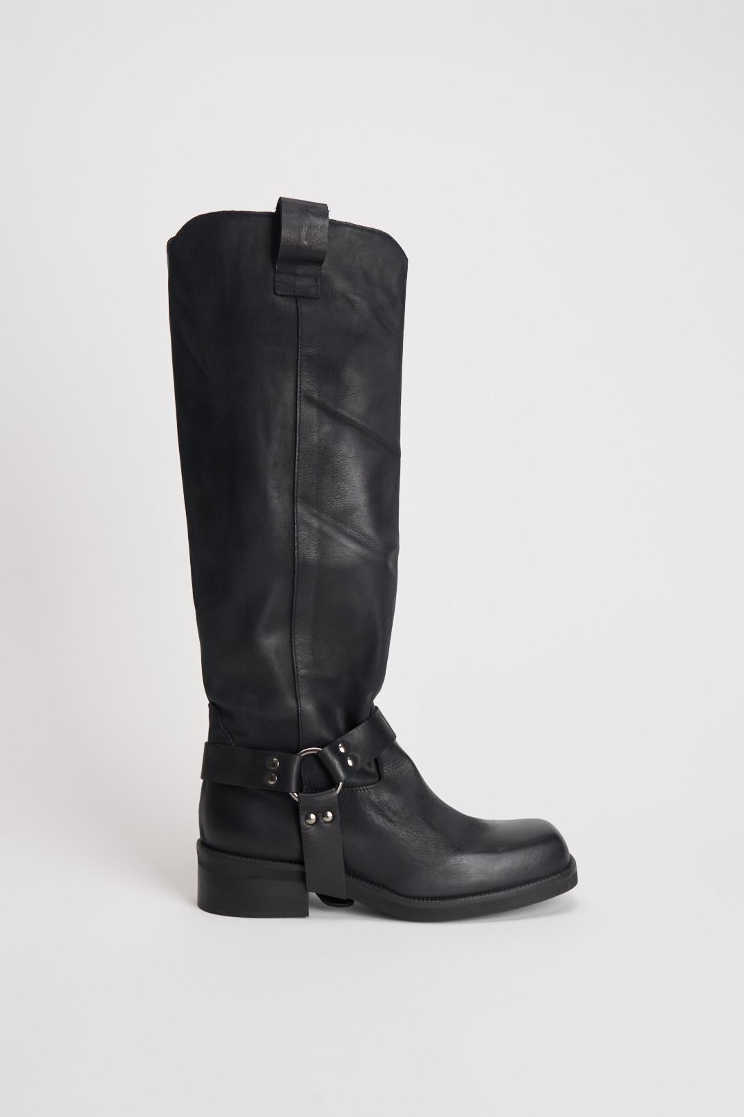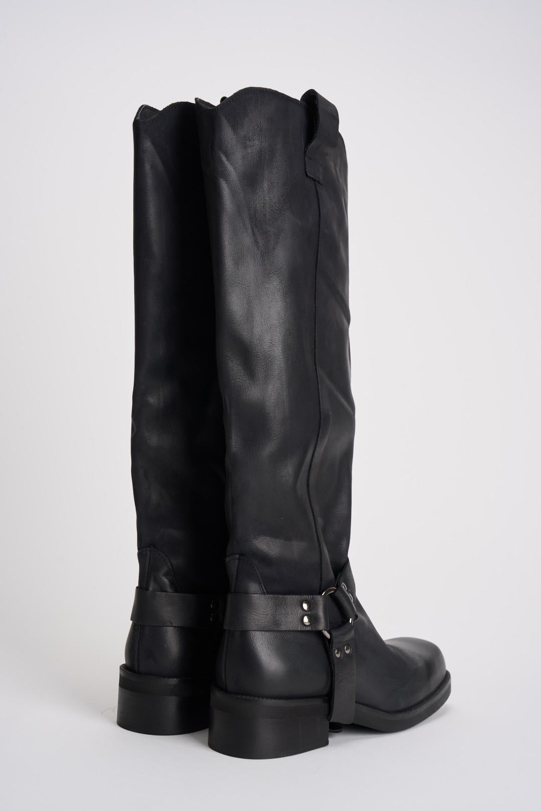DIVINE FOLLIE Stivale biker nero in pelle invecchiata. Modello camperos con fibbie laterali. Altezza tacco: 4 cm.