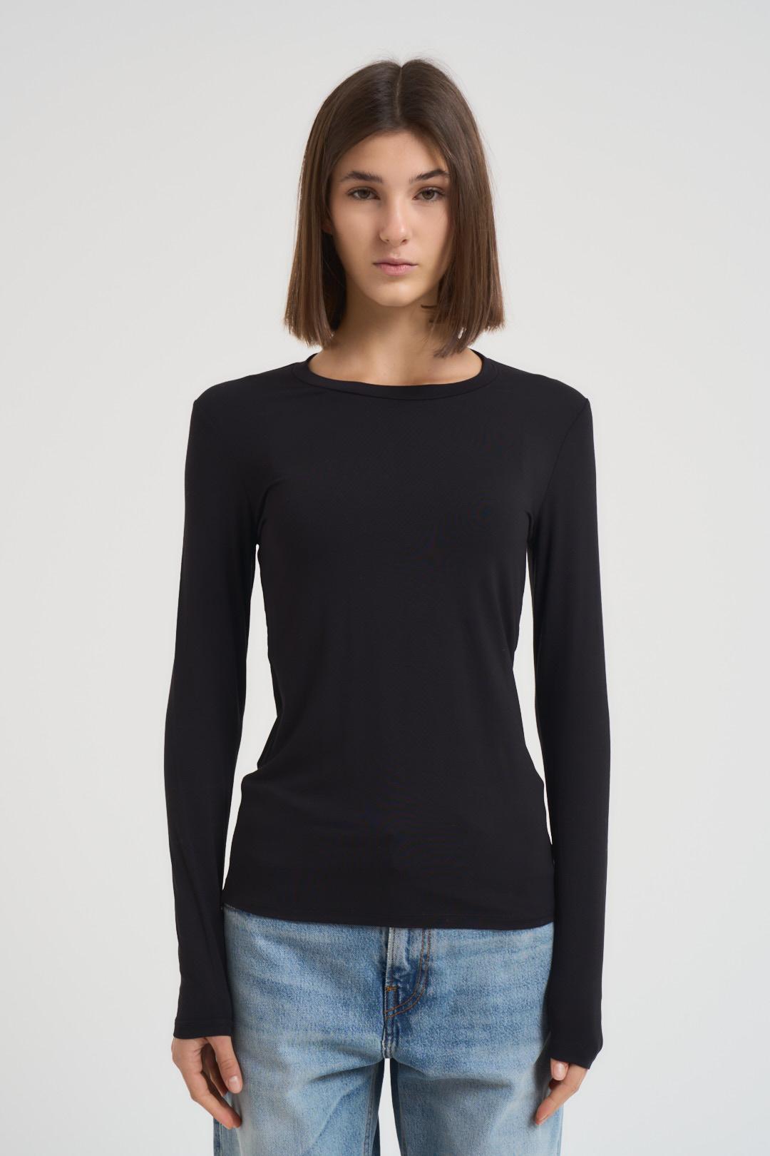 MAX MARA WEEKEND T-shirt basic donna nera manica lunga. Modello con girocollo scostato, maniche lunghe a giro, linea aderente. Logo a farfalla stampato sul retro del collo. Coposizione: in jersey di viscosa. La modella è alta 176 cm e indossa la tg S.