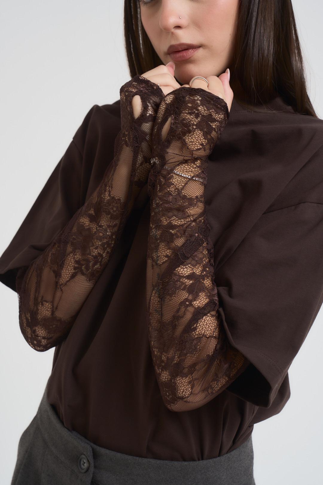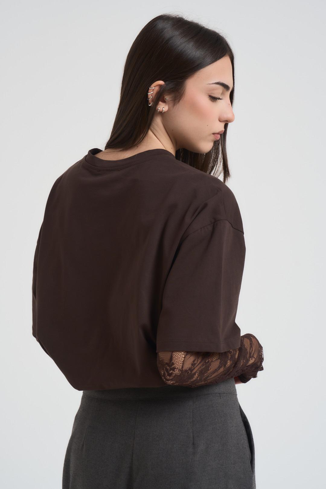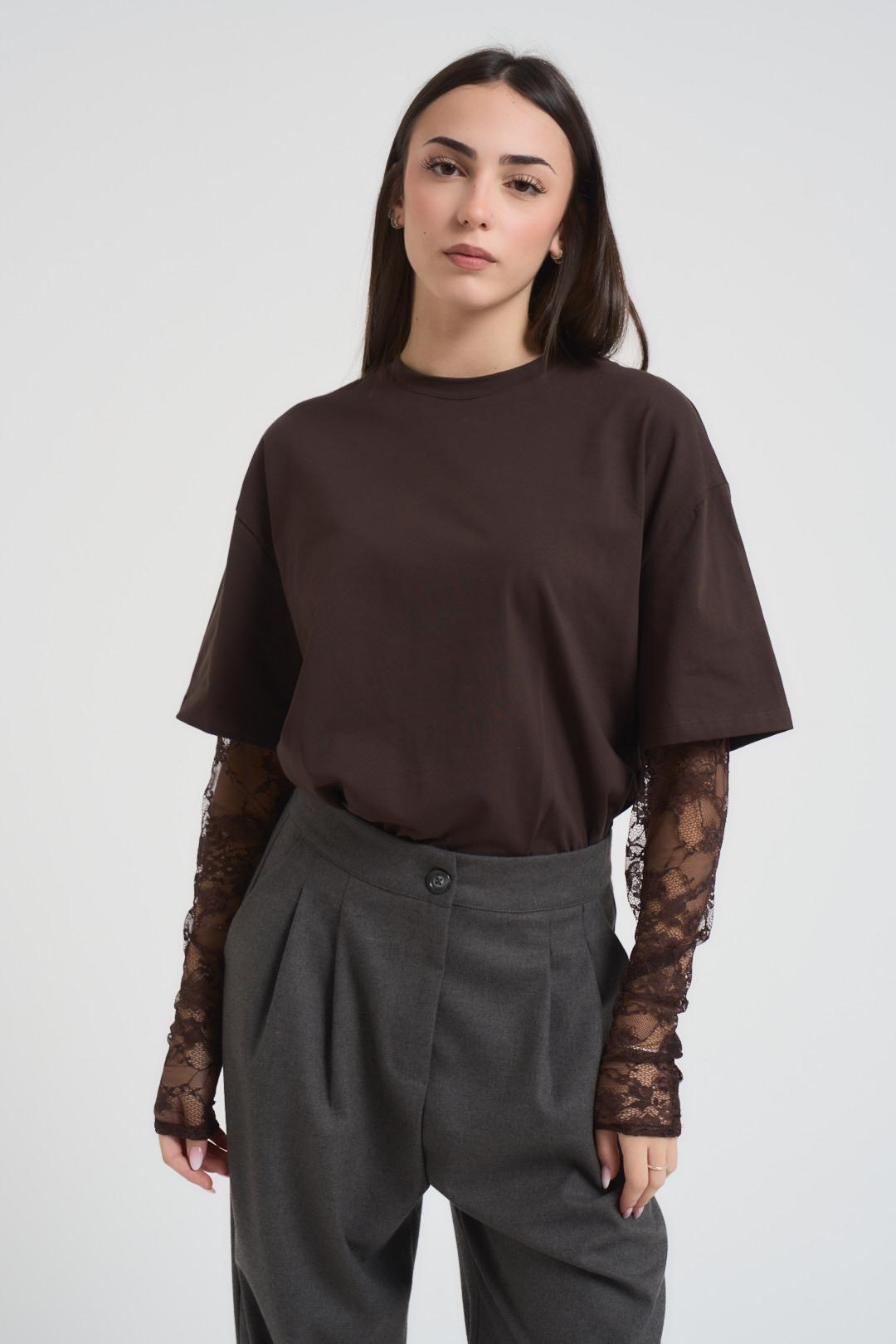 VICOLO T-shirt donna con maniche in pizzo marrone. Modello over con inserti velati in pizzo. Girocollo. Composizione: 100% cotone. La modella è alta 172 cm e indossa la taglia UNI.