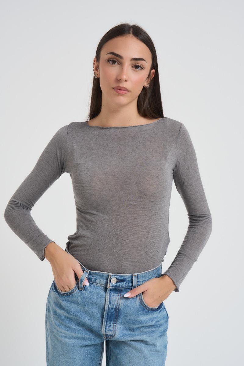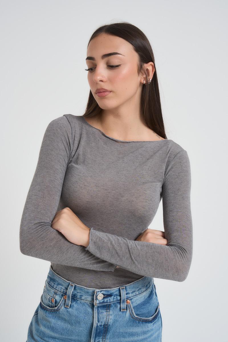 LOKITA MILANO T-shirt donna girocollo grigia. Modello sottogiacca, tessuto fino, manica lunga. Composizione: misto viscosa e poliammide. La modella è alta 172cm e indossa la taglia S.