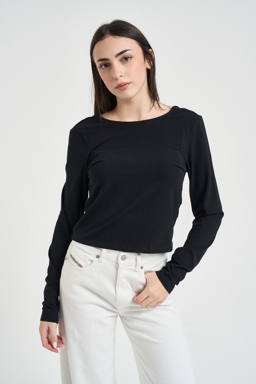 ONLY NOOS T-shirt donna girocollo nera. Modello a manica lunga con scollatura sul retro. Composizione: cotone e elastane. La modella è alta 172cm e indossa la taglia S.