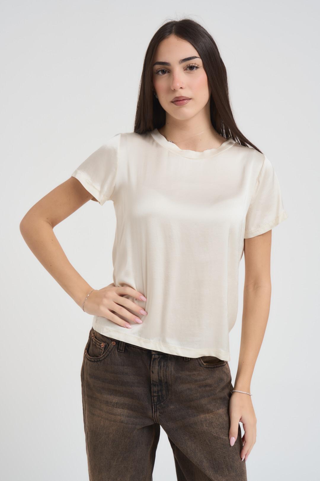 VITTO T-shirt donna girocollo satinata panna. Modello a manica corta fluido. Composizione: 100% viscosa. La modella è alta 172cm e indossa la taglia S/M.