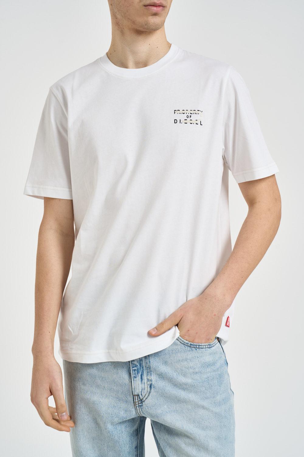 DIESEL T-shirt uomo girocollo bianca. Modello con stampa sul petto. Girocollo. Manica corta. Dettagli a costine. Composizione: 100% cotone. Il modello è alto 190cm e indossa la taglia L.