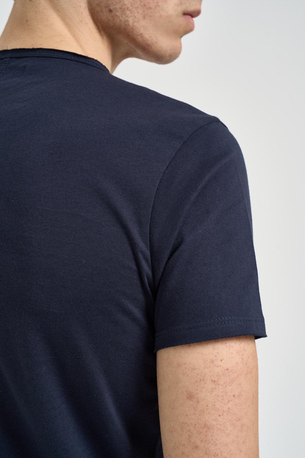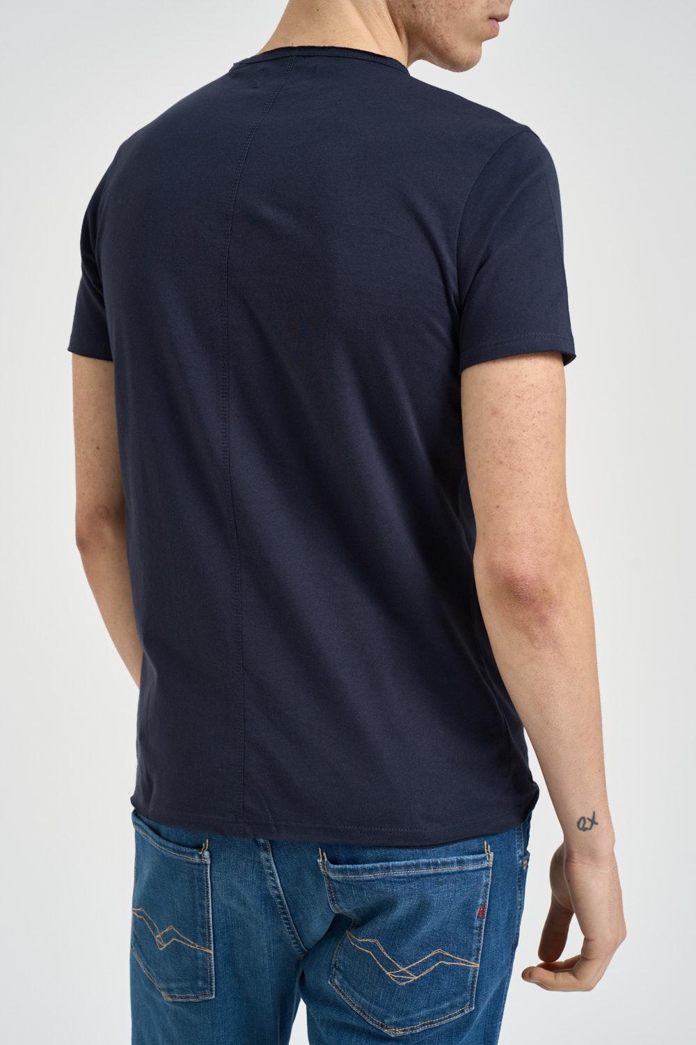 REPLAY T-shirt uomo girocollo blu. Modello a manica corta con etichetta logo. Orli non definiti. Composizione: 100% cotone. Il modello è alto 190 cm e indossa la tg L.