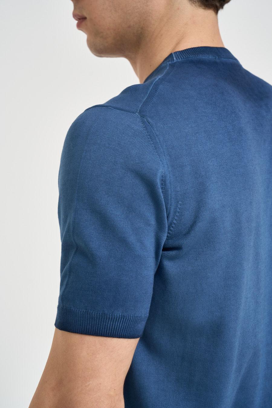 ALPHA STUDIO T-shirt uomo in maglia blu. Modello regular fit. Manica corta. Girocollo. Dettagli a costine. Composizione: 100% cotone. Il modello è alto 190 cm e indossa la taglia 50.