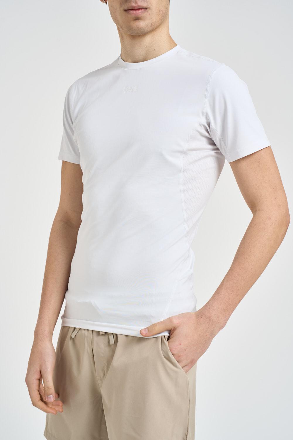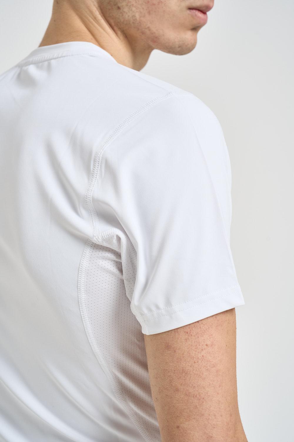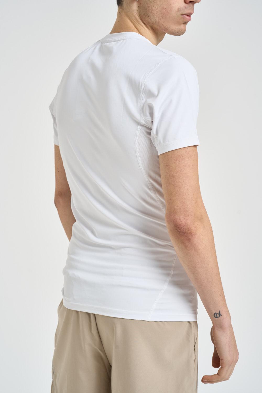 JACK & JONES T-shirt uomo sportiva bianca. Modello slim fit. Girocollo. Manica corta. Realizzata in tessuto tecnico leggero ed elasticizzato, favorisce la traspirabilità e una rapida asciugatura. Sul petto è presente il logo CNZ Core Nine-Zero tono su tono. Composizione: 88% poliestere, 12% elastane. Il modello è alto 190cm e indossa la taglia L.