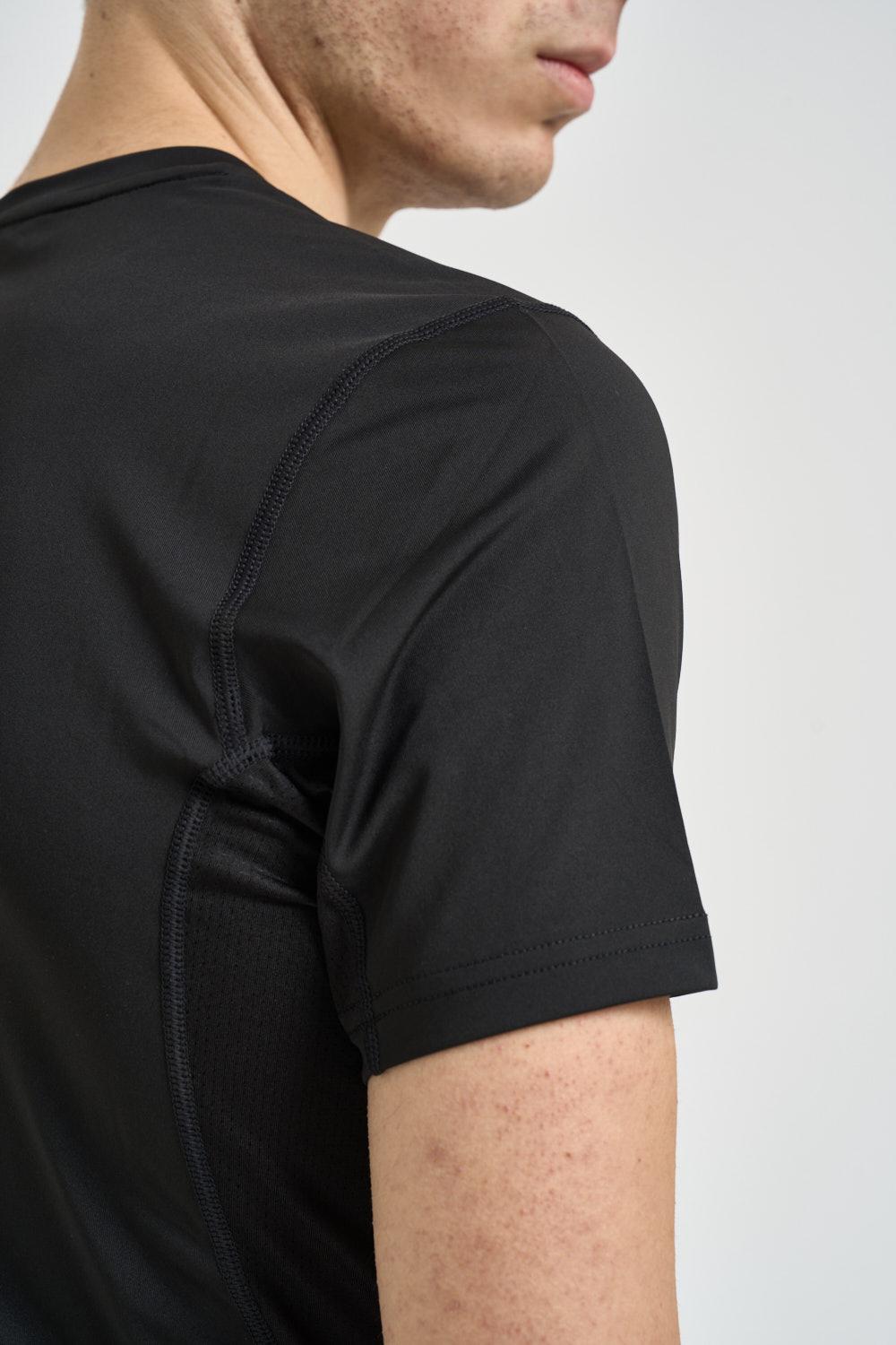 JACK & JONES T-shirt uomo sportiva nera. Modello slim fit. Girocollo. Manica corta. Realizzata in tessuto tecnico leggero ed elasticizzato, favorisce la traspirabilità e una rapida asciugatura. Sul petto è presente il logo CNZ Core Nine-Zero tono su tono. Composizione: 88% poliestere, 12% elastane. Il modello è alto 190cm e indossa la taglia L.