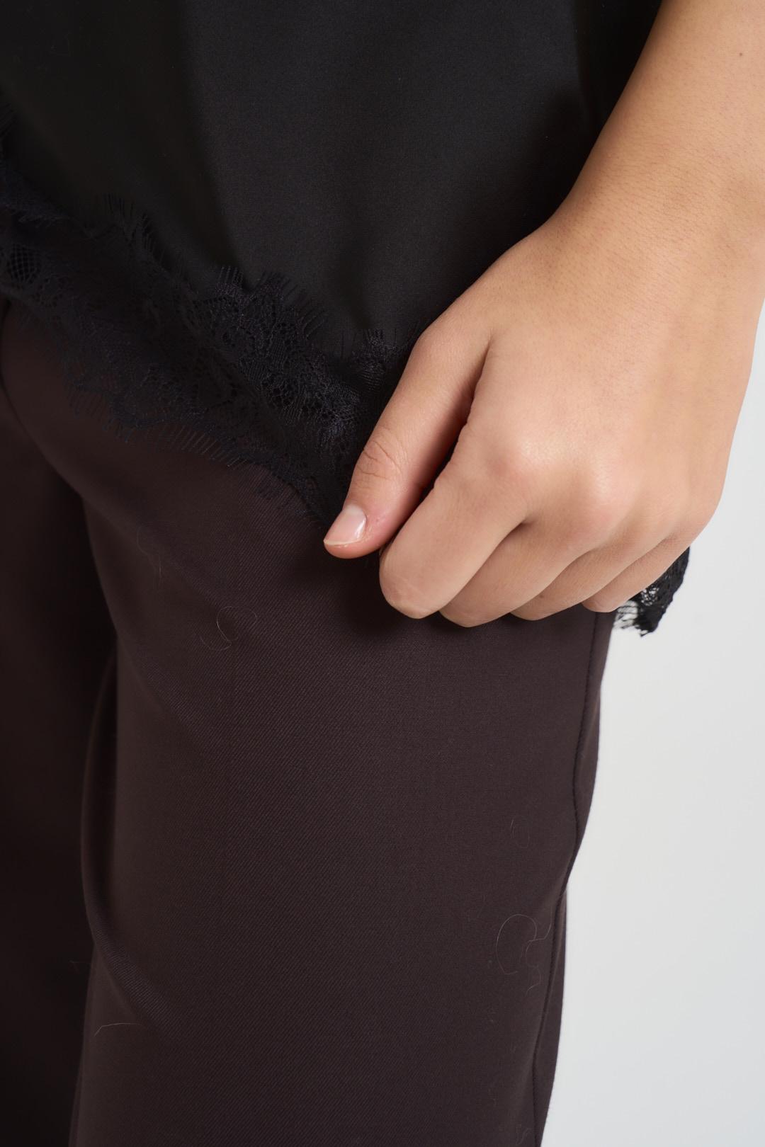 VITTO Top donna con pizzo asimmetrico nero. Modello satinato con un lato più lungo e uno più corto, dettagli in pizzo e spalline fini. Composizione: Poliestere. La modella è alta 176 cm e indossa la taglia UNI.