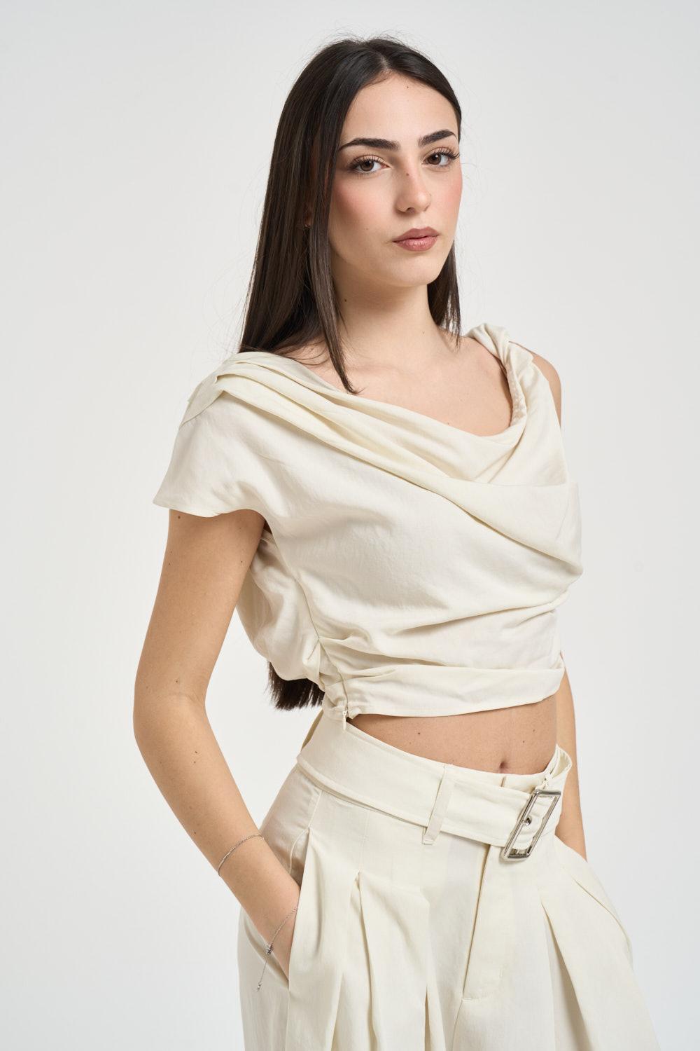 ELEH Top donna drappeggiato cropped panna. Modello smanicato con drappeggio sul davanti e dettaglio nodo sulla spalla che valorizza la linea del capo. Vestibilità cropped con fondo leggermente aderente. Composizione: 95% tencel 5%elastane. La modella è alta 172cm e indossa la taglia 40.
