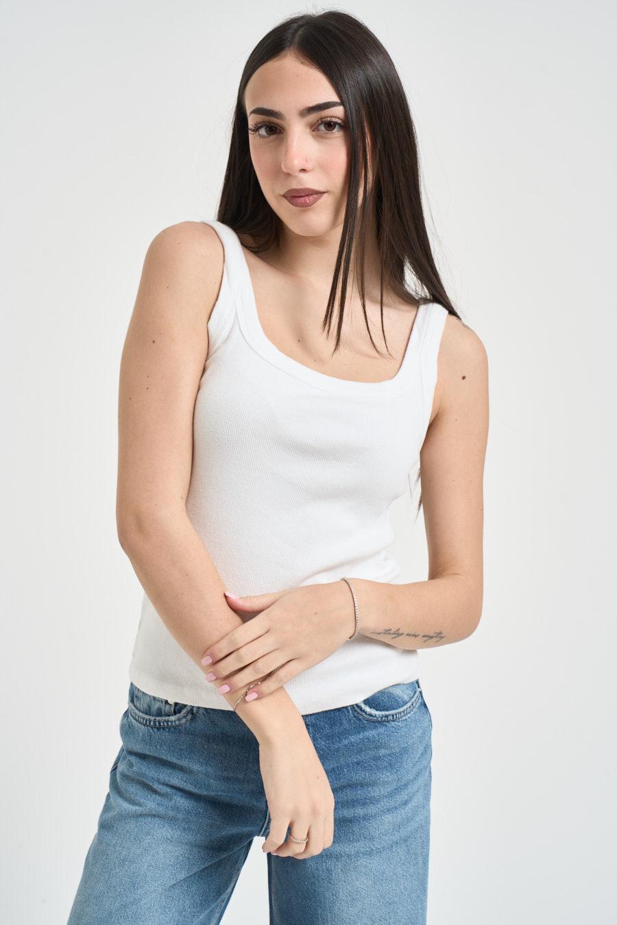 TENSIONE IN Top donna in cotone bianco. Modello smanicato con scollo ampio rotondo e spalline larghe, realizzato in tessuto elasticizzato che valorizza la silhouette. Linea aderente e confortevole. Fit slim. Composizione: 95%cotone 5%elastane. La modella è alta 172cm e indossa la taglia uni.