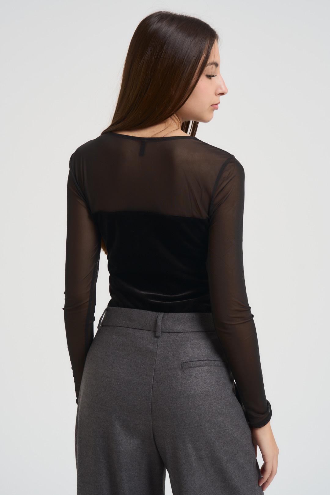 ONLY Top donna in velluto e semitrasparente nero. Modello girocollo a manica lunga, parte sotto in velluto con scollo a cuore e parte superiore del petto e maniche in tessuto trasparente nero. Composizione: 90% poliestere 10% elastane. La modella è alta 176cm e indossa la taglia S.