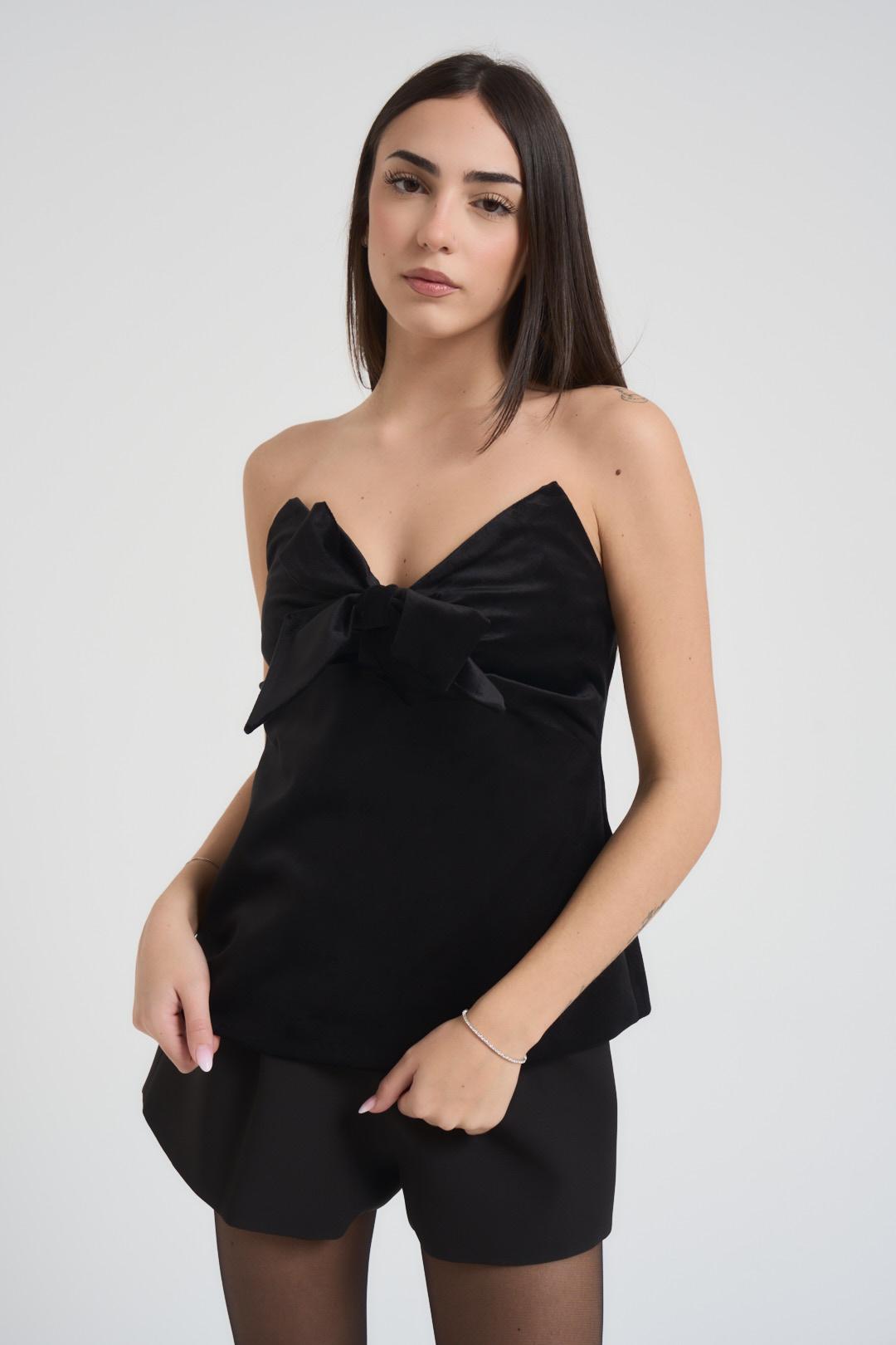 VICOLO Top donna in velluto nero. Modello senza spalline con dettaglio fiocco sul petto e chiusura sul retro con zip invisibile. Composizione: 100% poliestere. La modella è alta 175cm e indossa la taglia S.