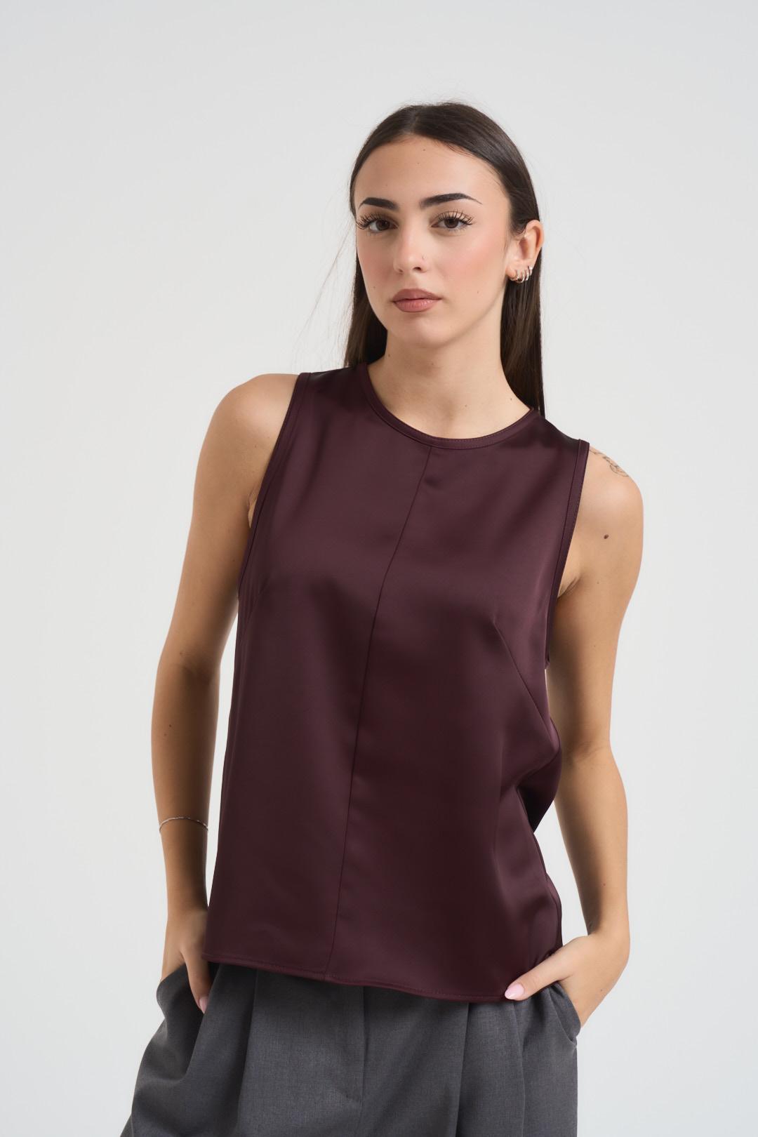 IMPERIAL Top donna senza maniche prugna. Modello satinato girocollo, con taglio semplice. Composizione: 100% Poliestere. La modella è alta 172 cm e indossa la taglia S.