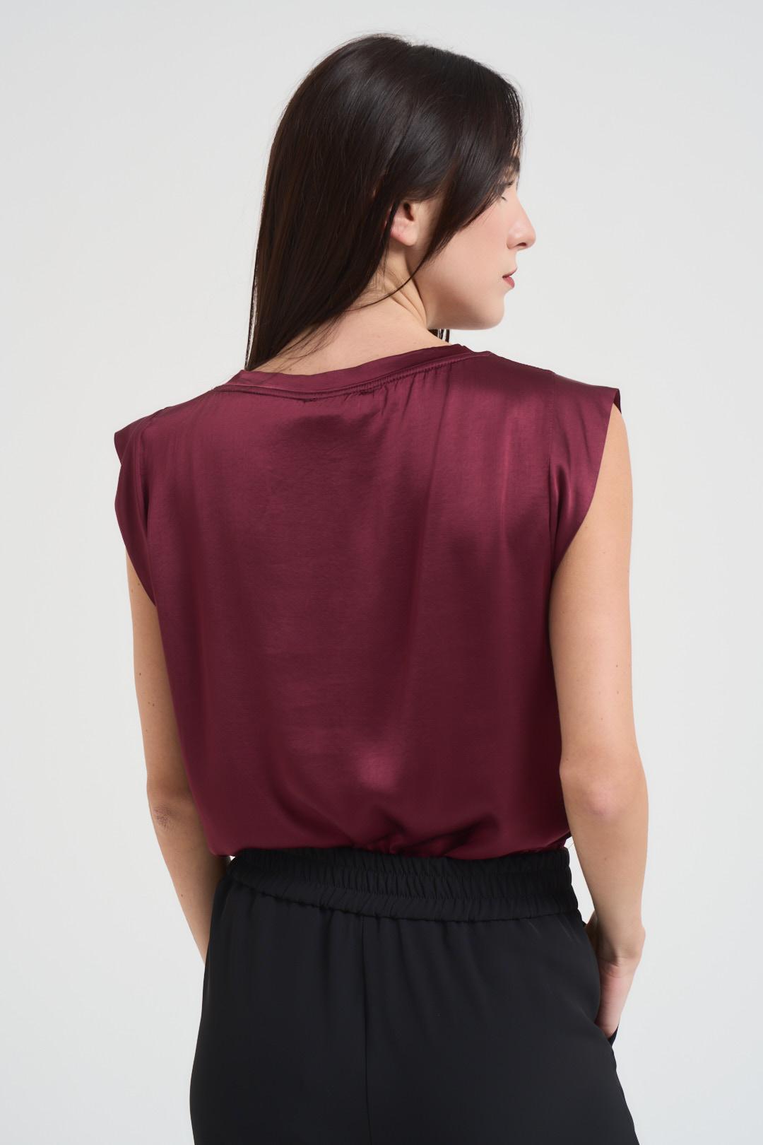 MOTEL Top donna smanicato bordeaux. Modello con collo a barchetta, senza maniche. Tessuto leggermente elasticizzato. Composizione: 97% Viscosa 3% Elastan. La modella è alta 175 cm e indossa la taglia S.